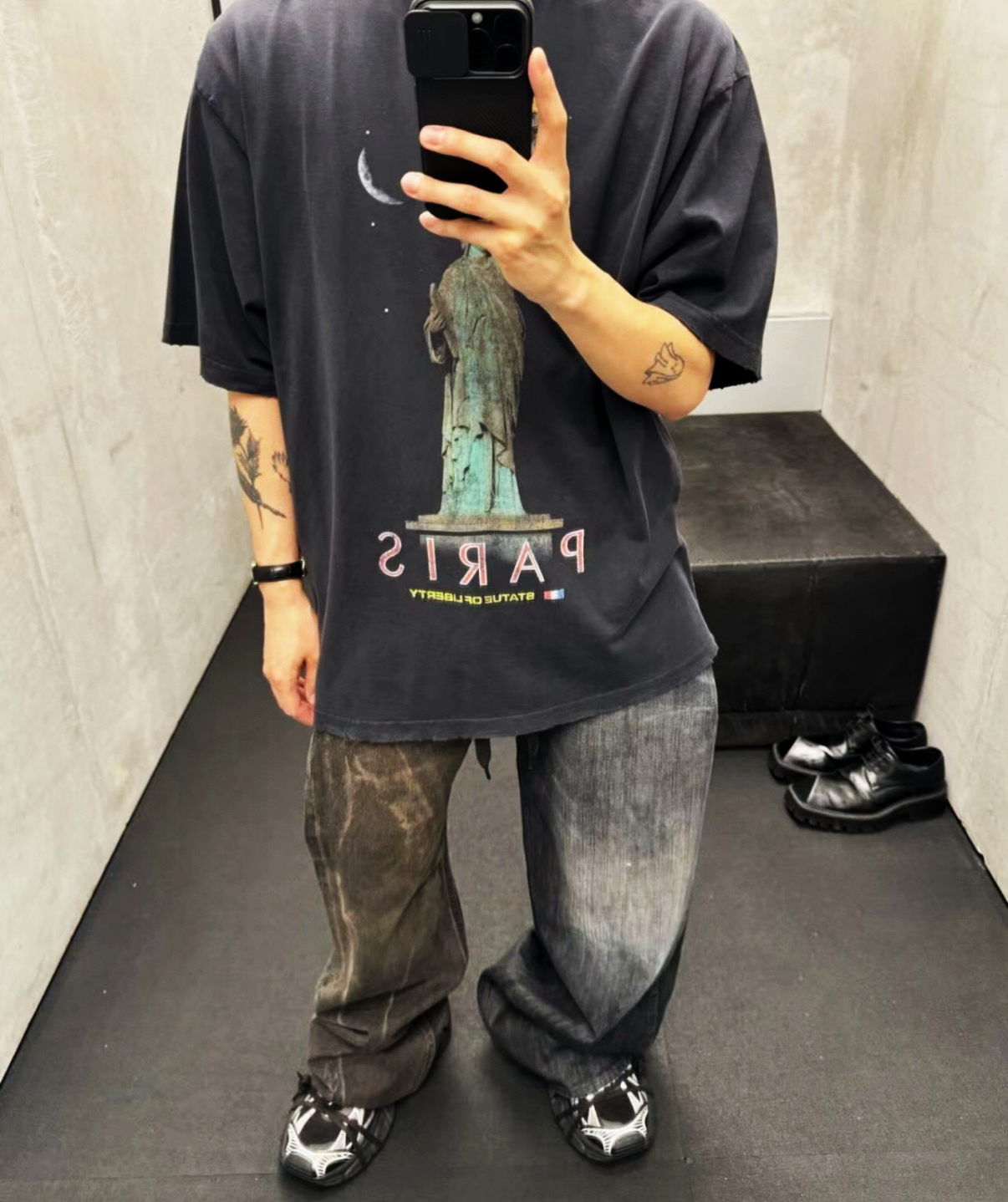 风格独特:T恤上印有独特的图案和反向的“PARIS”字样 ,带有一种街头潮流感,很容易吸引目光,展现出穿着者的个性。 2. 色彩搭配和谐:整体穿搭以深灰色、黑色和浅灰色为主,色彩搭配较为和谐,没有过于突兀的颜色冲突,给人一种沉稳又不失时尚的感觉。 3. 宽松舒适:T恤和裤子都是宽松的版型,这种穿搭风格符合当下流行的舒适休闲风,穿着会比较自在,同时也能营造出一种随性的时尚感。 4. 配饰加分:...