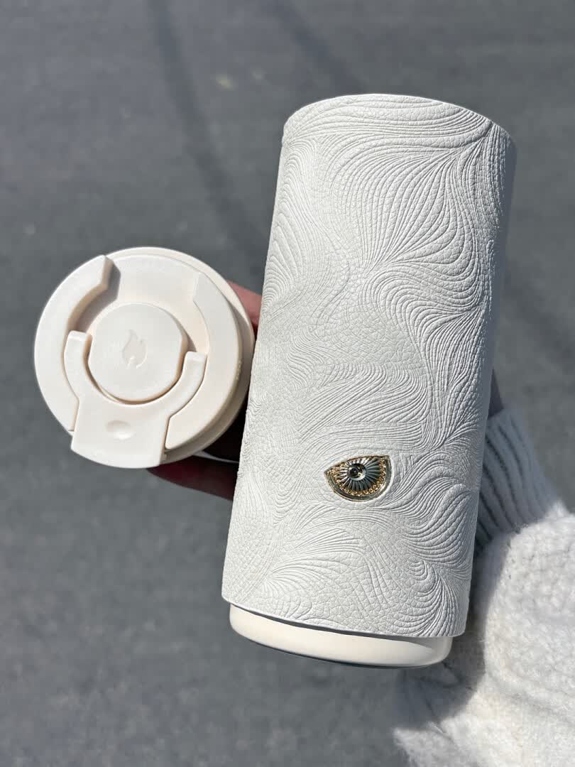 实物有亿点点好看怎么回事。用上之后...哐哐喝水,可拆卸白色皮纹浮雕杯套摸起来特别有质感,一盖双饮设计也泰贴心噜,这么实用又有颜的保温杯,谁能不爱