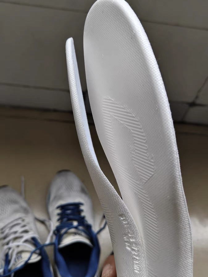 买来穿了几天了,感觉挺好的,不软,不过跑步弹性很强。就是右脚这只到手的时候上面有一些褶皱,因为我已经有心理预期了,以为是压的印,也不严重就没管,现在抽出来仔细看发现这只明显比左边更瘪更薄更软,都踩出脚的印了,合着是发泡的时候料没填够?这品控不愧是361