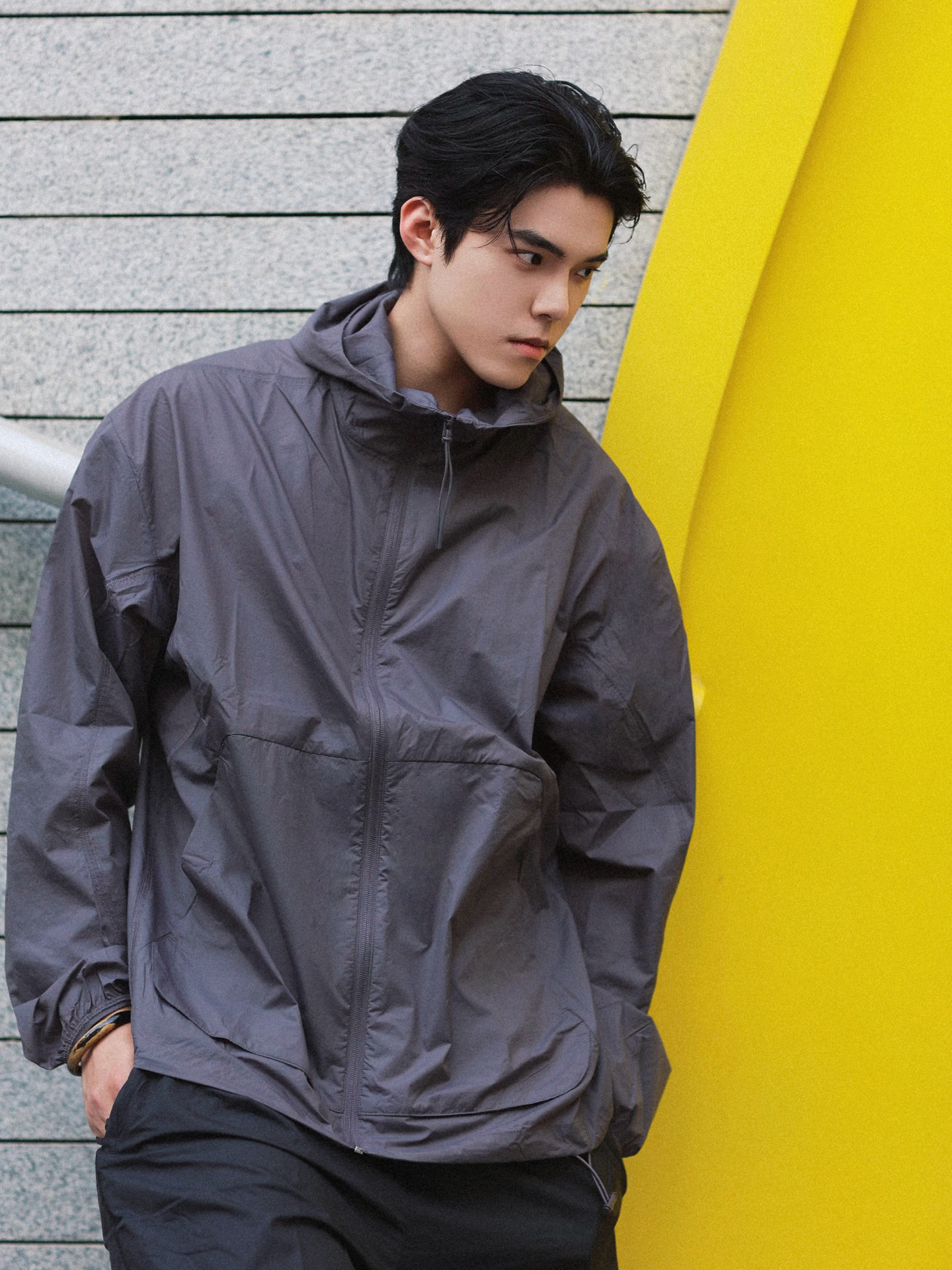 太帅了一身灰 衣服轻薄又防晒 比传统男款防晒衣都会好点, 梭织面料轻量又强韧,耐磨还透气,日常通勤、户外慢跑,完全能应对各种状况。拉链连帽设计超实用,风大时拉上拉链,天气好时敞开穿,随性又自在。两侧拉链口袋,放手机、钥匙超方便。强烈推荐! 图源网络,侵删!