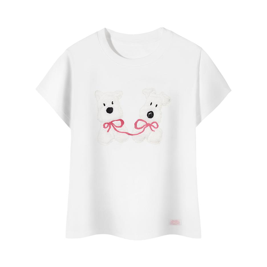 本篇笔记关联了【沈羽洁同款】PSO Brand 假两件修身圆领正肩贴布绣图案针织蝴蝶结小狗短袖T恤 TKA126 白/女等商品,为用户提供真实的使用体验和购买参考。