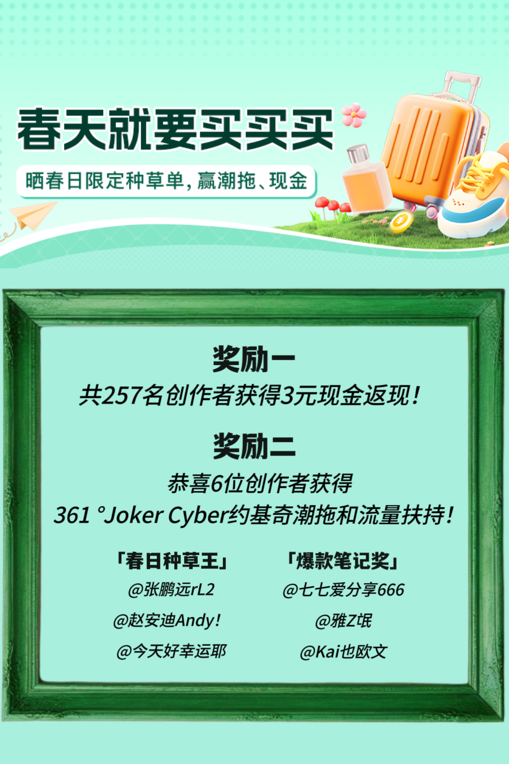 截至目前#春天就要买买买 已圆满结束,获奖结果新鲜出炉! 👏恭喜以下获奖创作者! 【奖励一】共257名创作者获得3元现金返现! 【奖励二】恭喜6位创作者(详情请见p2)获得361°Joker Cyber约基奇潮拖1双(尺码任选)和流量扶持! 领取方式 六位创作者: @张鹏远rL2 @赵安迪Andy!@今天好幸运耶 @七七爱分享666 @雅Z氓 @Kai也欧文 须在4月27日之前联系已添加的官方...