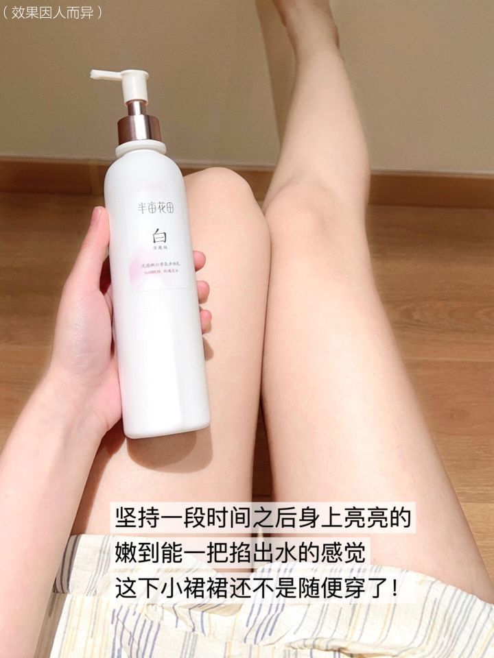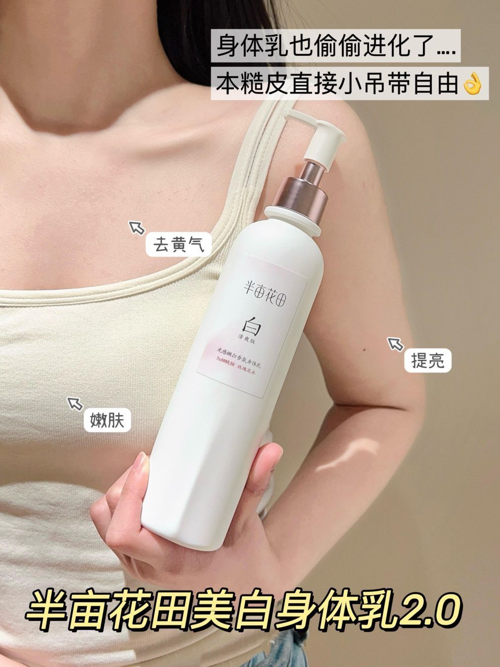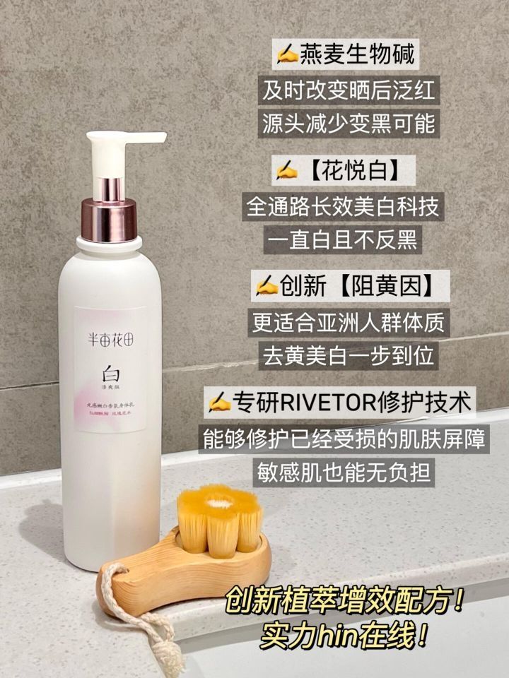 姐妹们有没有发现?明明脸已经很白了 但一到夏天露胳膊露腿就暴露了肤色! 去海边玩一圈回来像斑马线 学车晒出熊猫臂🐼 连闺蜜都问我是不是偷偷穿了长袖... 直到挖到这个热巴同款的半亩花田美白身体乳2.0! 没想到身体乳真的会偷偷进化! - 第二段成分介绍 成分这方面也是下了不少功夫! ✅【花悦白™三重狙击! 红没药醇+烟酰胺+玫瑰花水 打通美白全链路,不仅白还不返黑 ✅阻黄因™ 白睡莲花+玫瑰花水+...