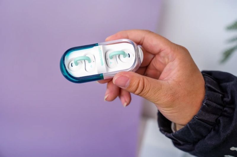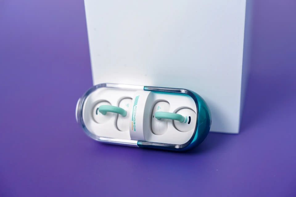 充电仓椭圆造型呼应“胶囊”概念,旋转开盖阻尼感超绝,精准到0.5秒完成动作,磁吸卡扣的“咔嗒”声超解压,就像按机械键盘。不过,ABS塑料外壳接缝处理不太完美,沾汗后类肤涂层易留指纹,这大概是199元定价的妥协。但耳机本体液态硅胶材质+C形耳夹结构超赞,接触耳廓部分无棱角,单只含耳夹仅9.8g,比Oladece OWS2还轻1.2g,诚意满满。