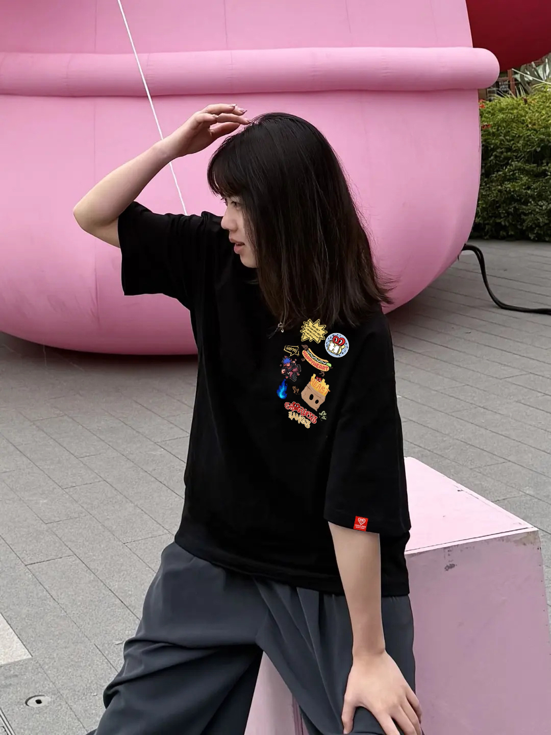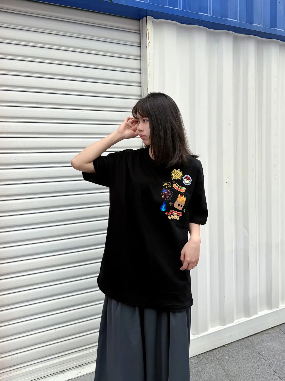 我特别喜欢这个衣服的设计,感觉很可爱,涂鸦的设计很特别,版型宽松,下身搭配一条阔腿长裤,好看极了,松弛感拉满