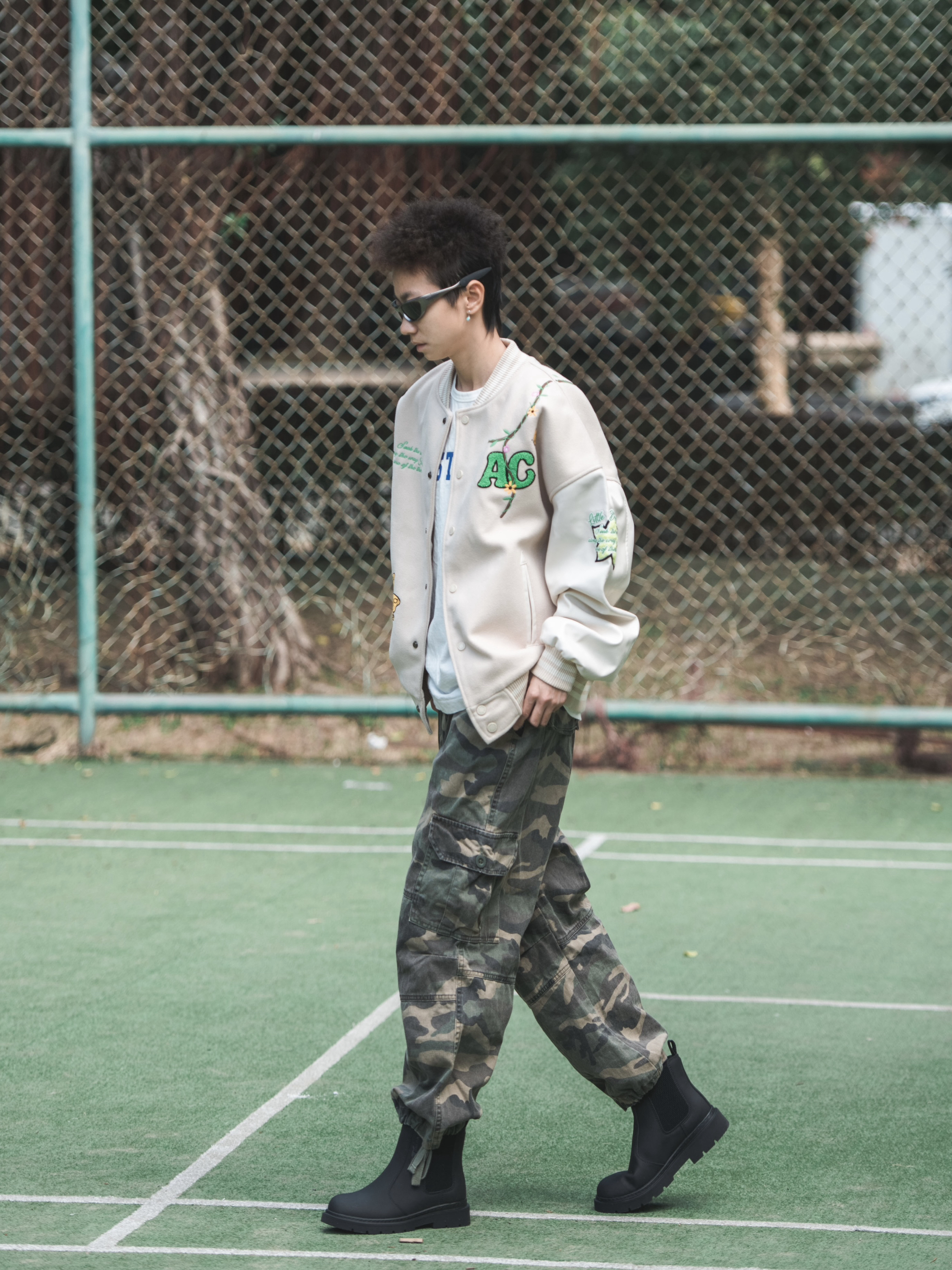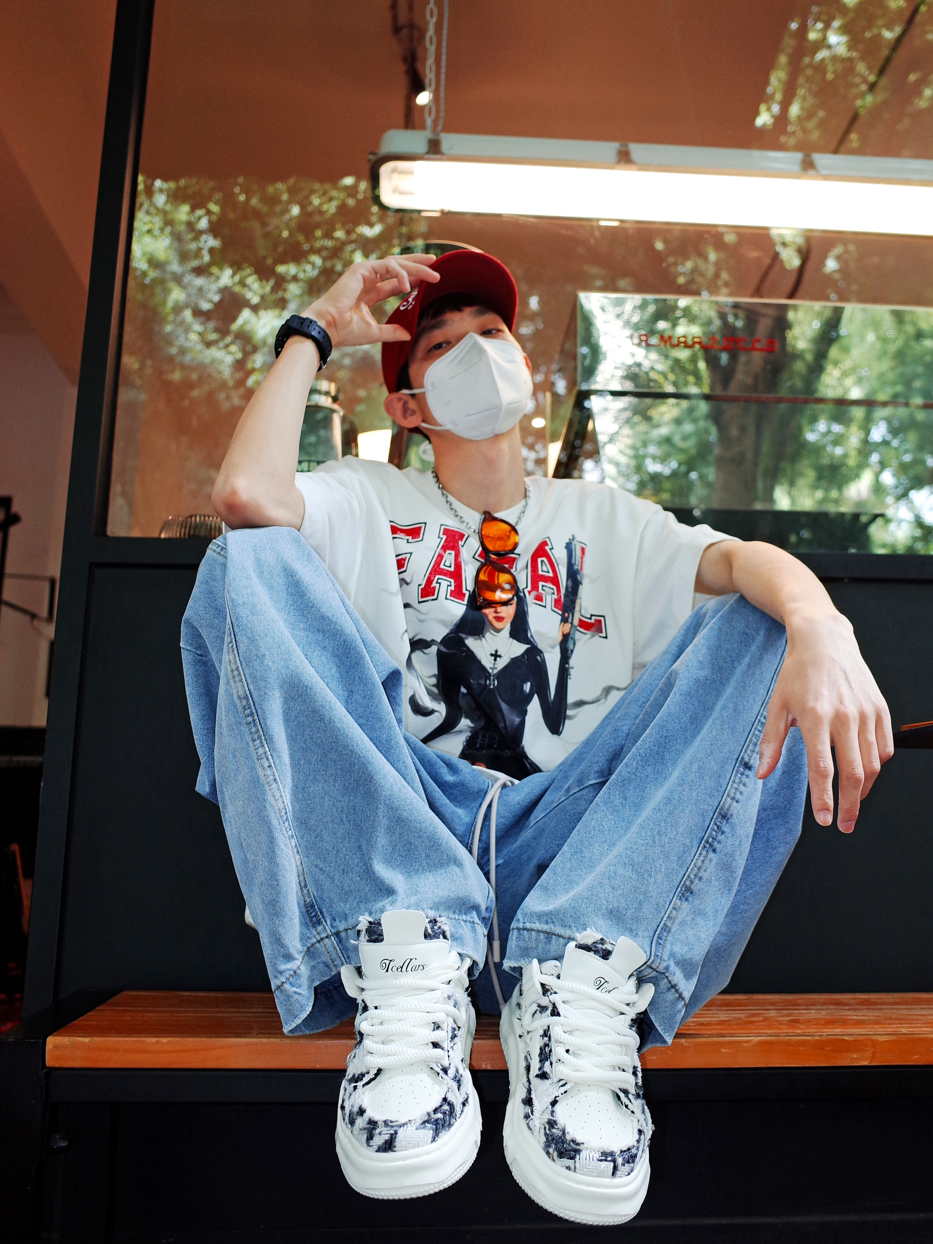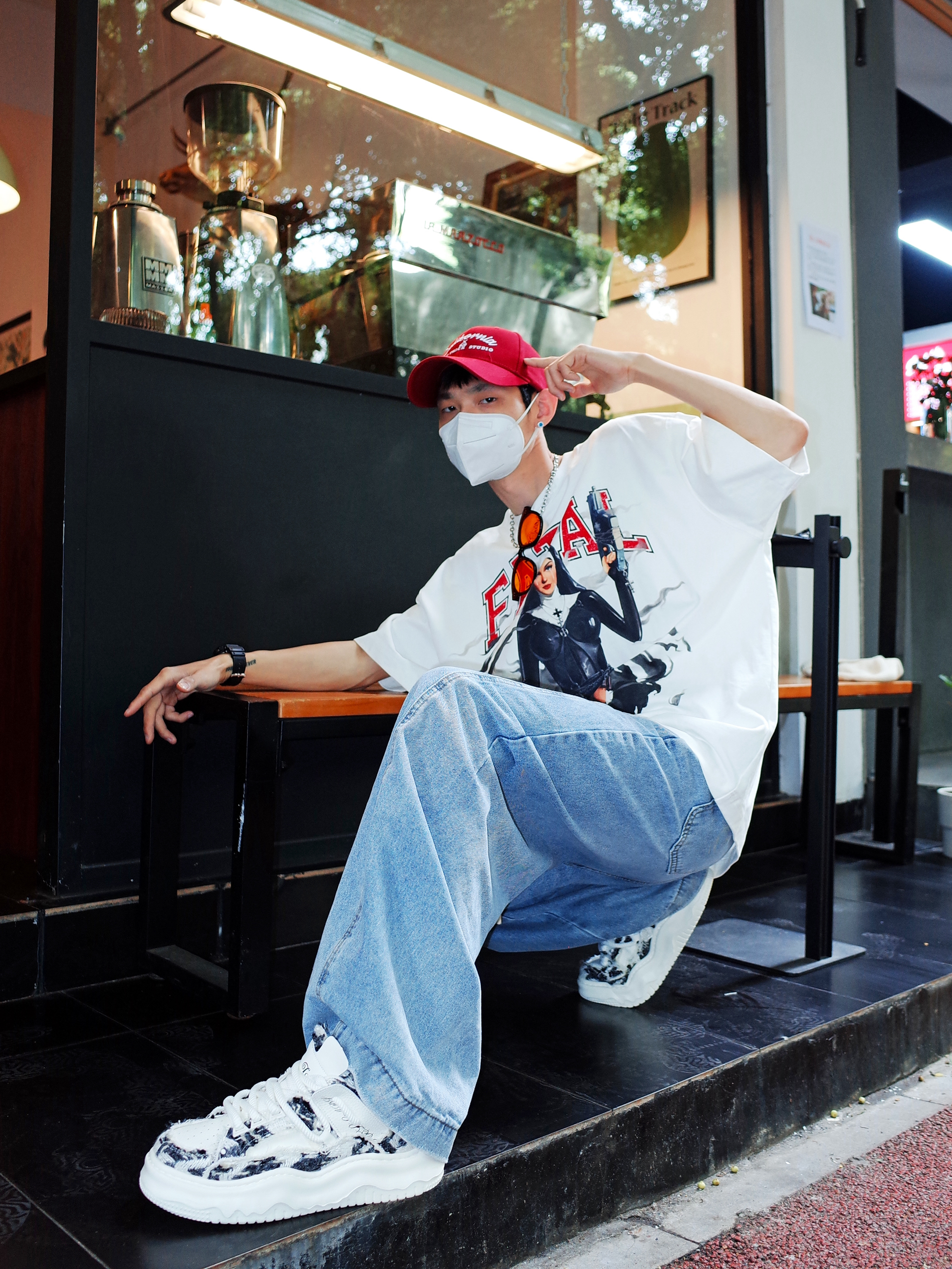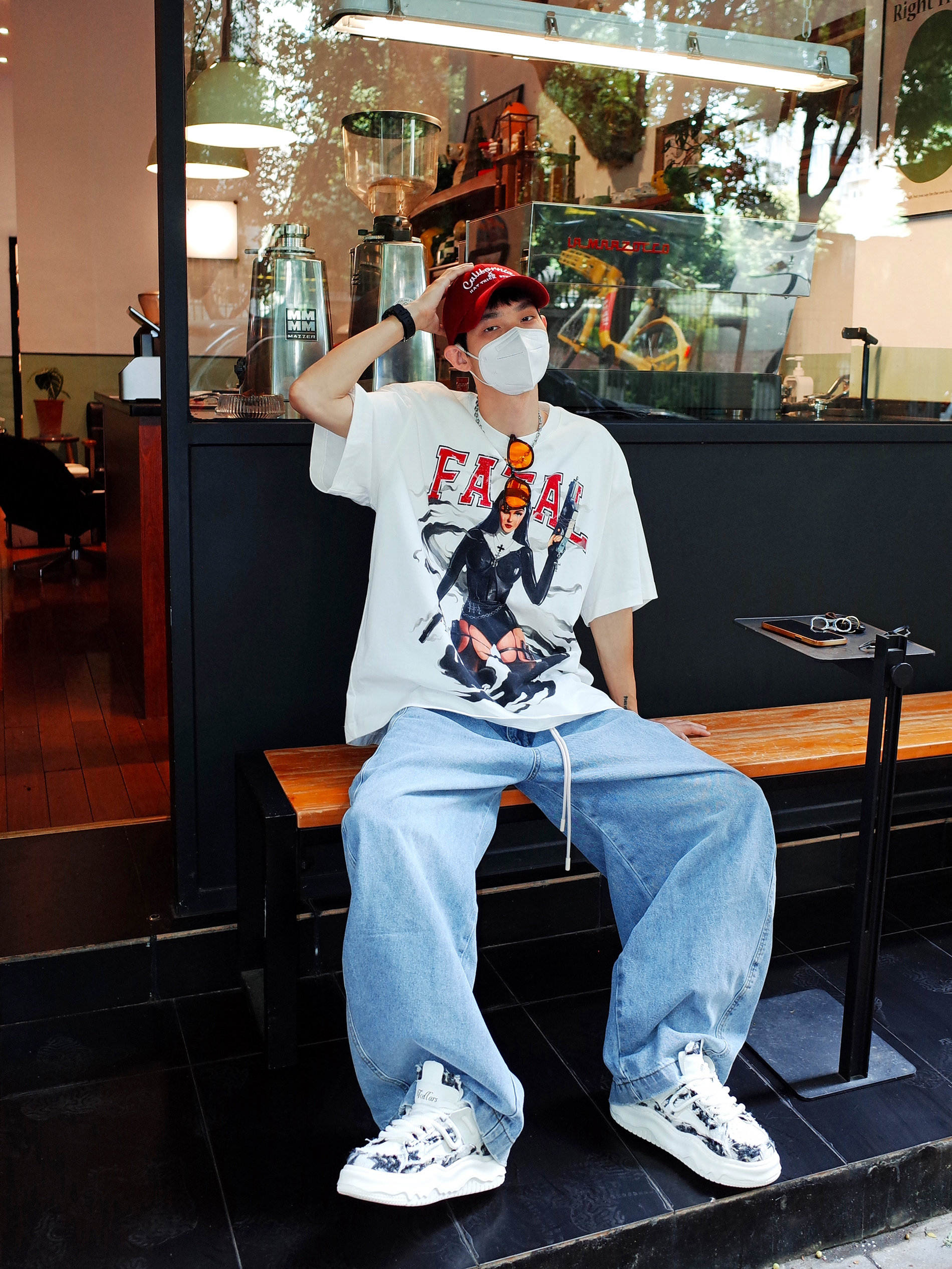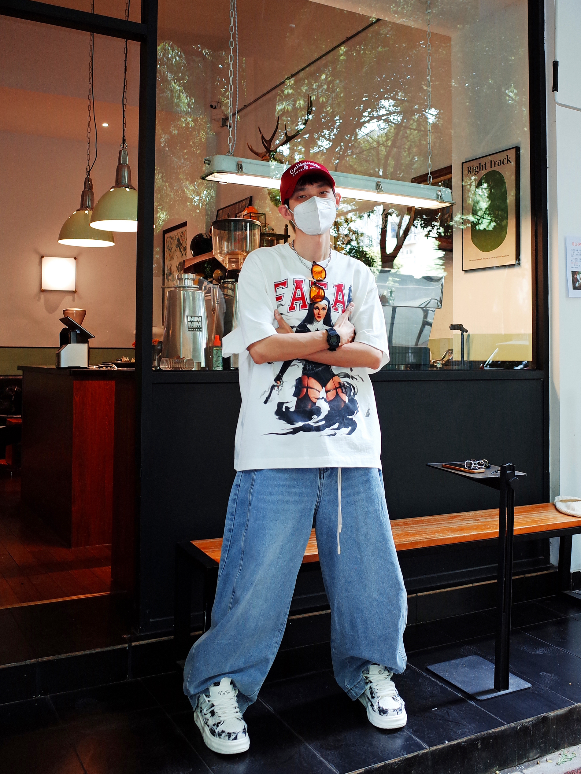 谁说街头风只能黑白灰⁉️ 白色oversize T恤打底, 胸前个性的大印花自带叛逆DNA🧬 浅蓝弯刀裤配黑白板鞋, 悄悄拉长腿型又不失随性✨ 压低红色鸭舌帽🎈 在午后三点的咖啡店门口☕️ 📸随便倚墙插兜就能出片~