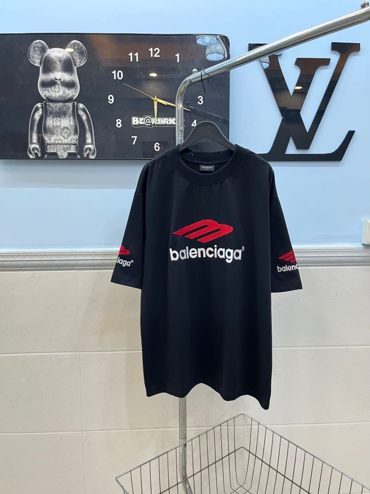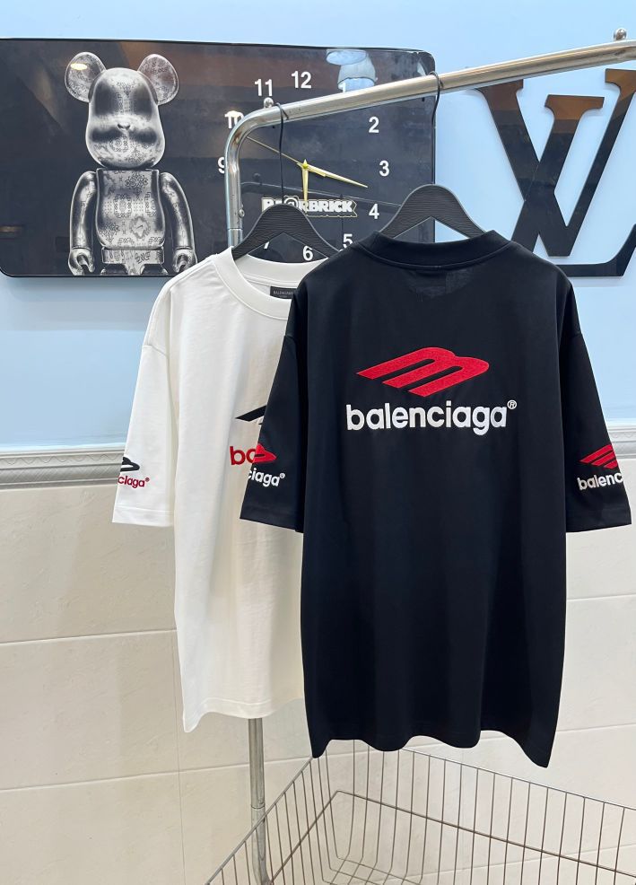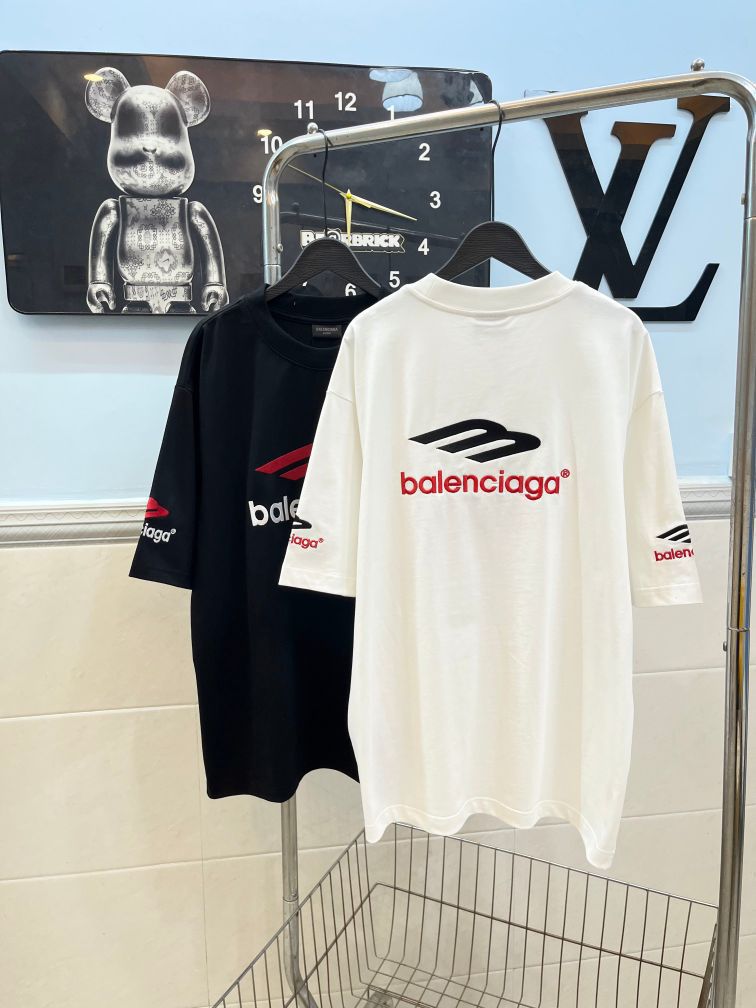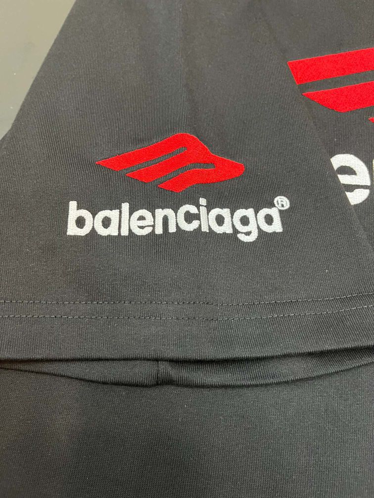 巴黎世家是知名奢侈品牌,由克里斯托瓦尔·巴伦西亚加创立,在时尚界地位颇高,以先锋、前卫的设计风格闻名,常引领时尚潮流。这两款T恤简约中彰显品牌标识,是品牌日常时尚单品的代表 。背景中出现的Bearbrick积木熊是热门潮玩,由Medicom Toy公司推出,在潮流文化领域人气很高,常与各类品牌、艺术家合作推出联名款