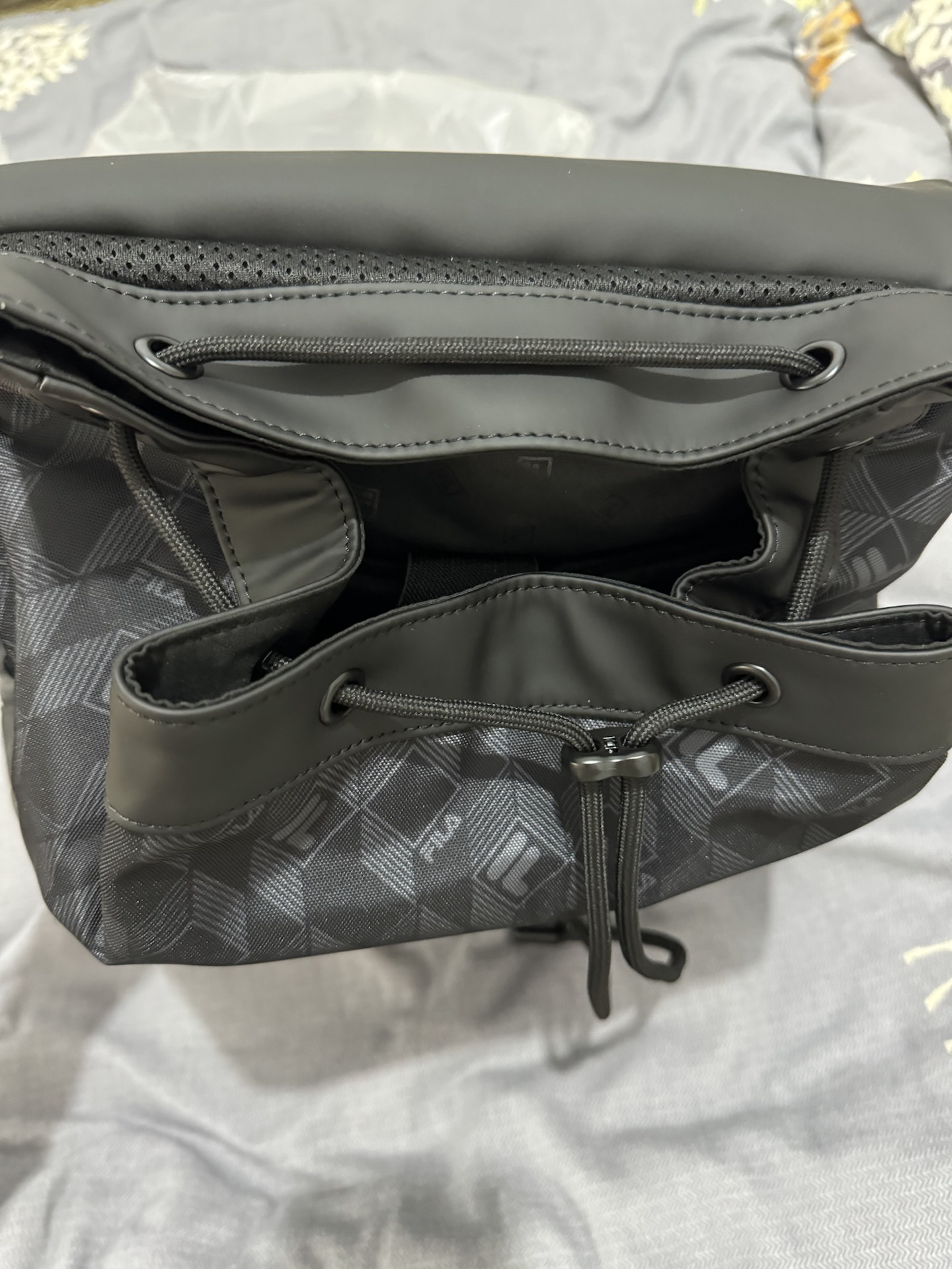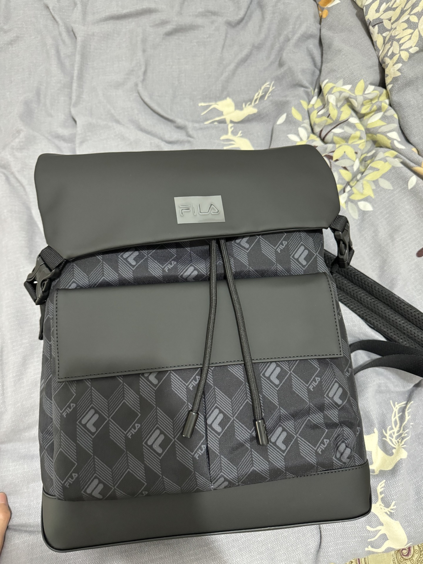 FILA 新出的这款双肩包容量很大 外部采用防水材质 装装笔记本书本都是随随便便的 包口采用抽绳加上翻盖设计 这个包容量超级无敌 肩带还采用了特殊设计 背上很轻松 值得购买