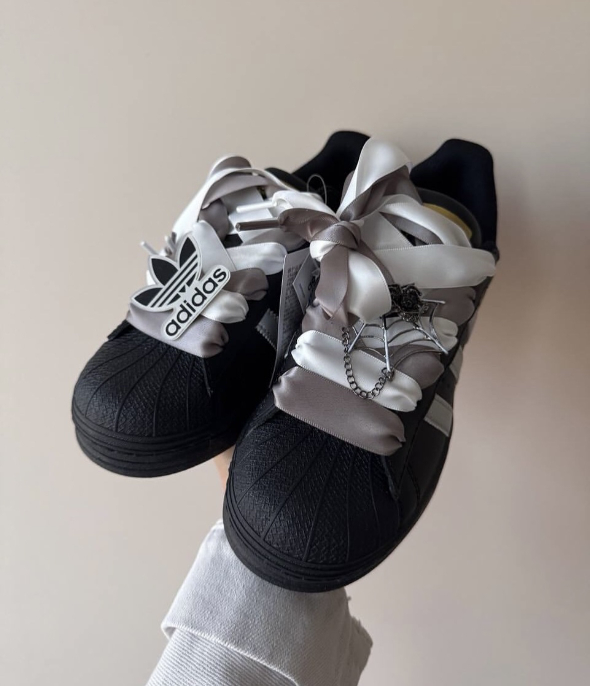 这款阿迪金属感十足,上脚非常帅气!!鞋带是丝绸,还有金属别针!黑银搭配真的很酷!
