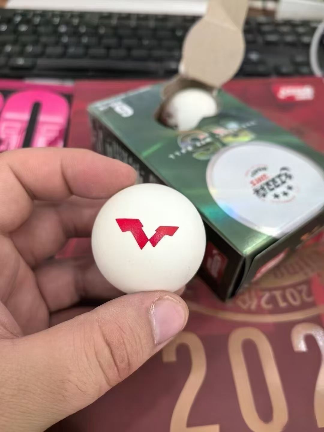 球面色泽均匀,红双喜标志超醒目。 材质更是没得说,采用优质材料,弹性和硬度平衡得恰到好处,击球声音清脆,反馈超精准。 圆度近乎完美,飞行超稳定,不管啥球路都能轻松hold住。