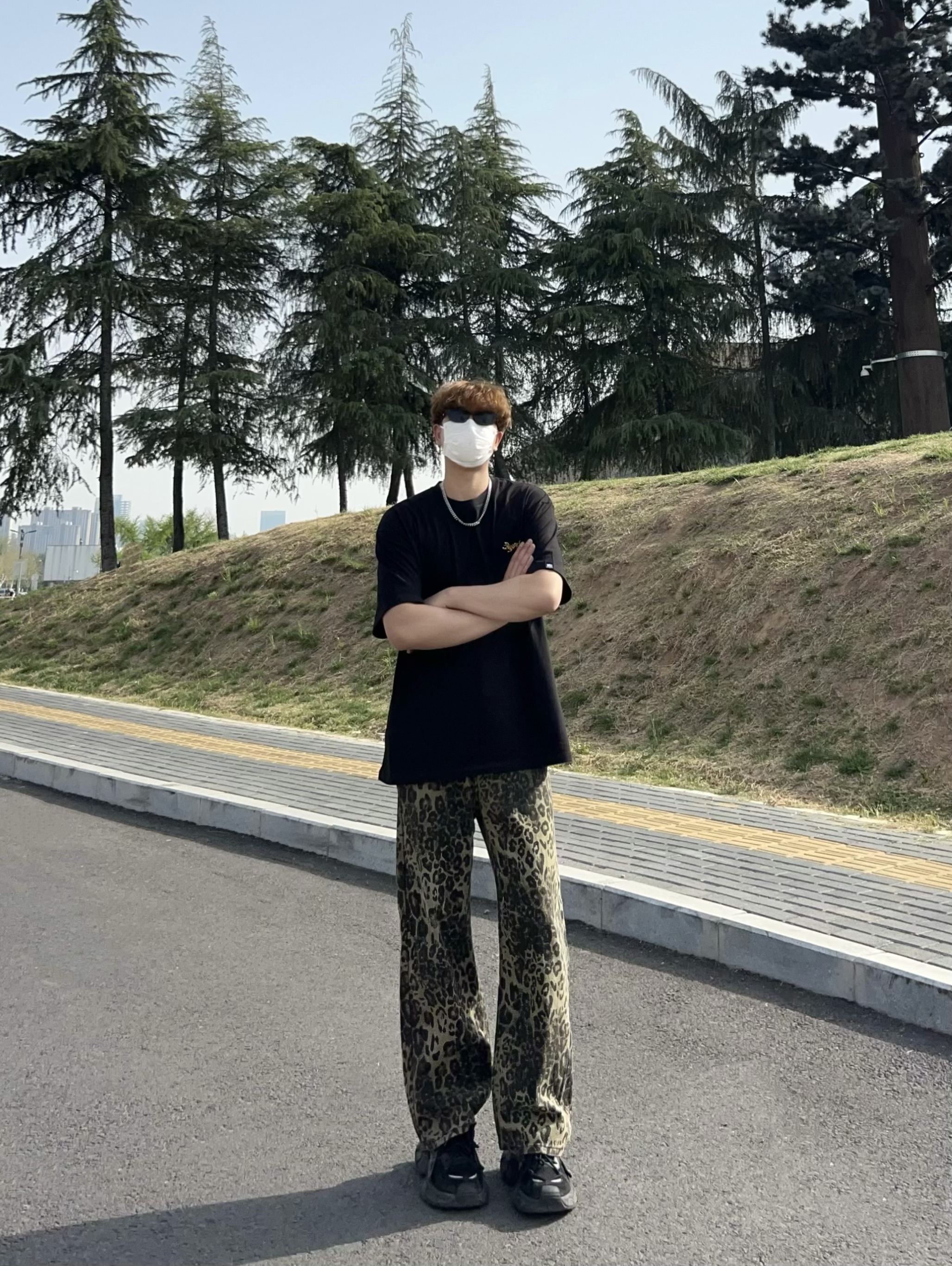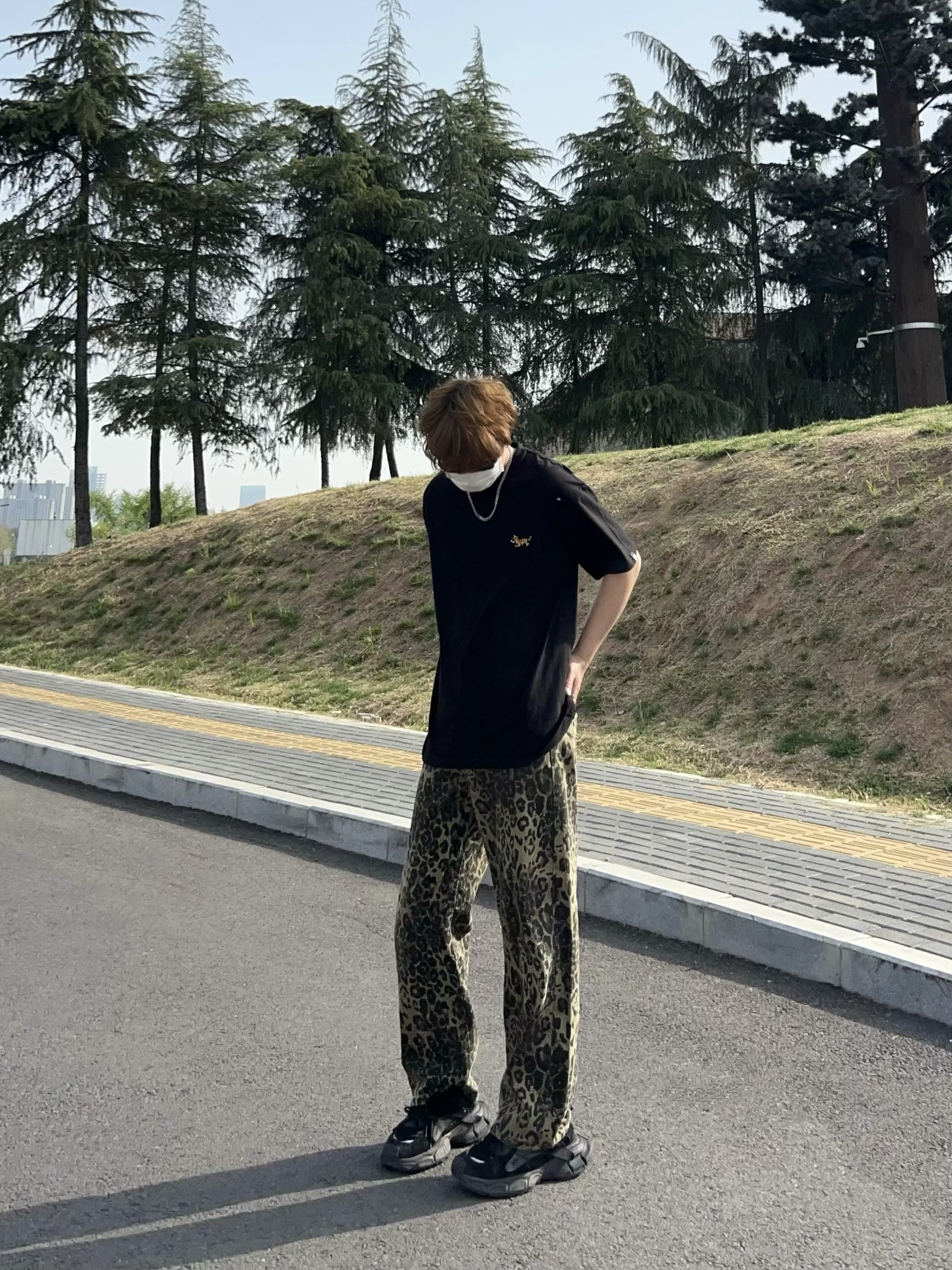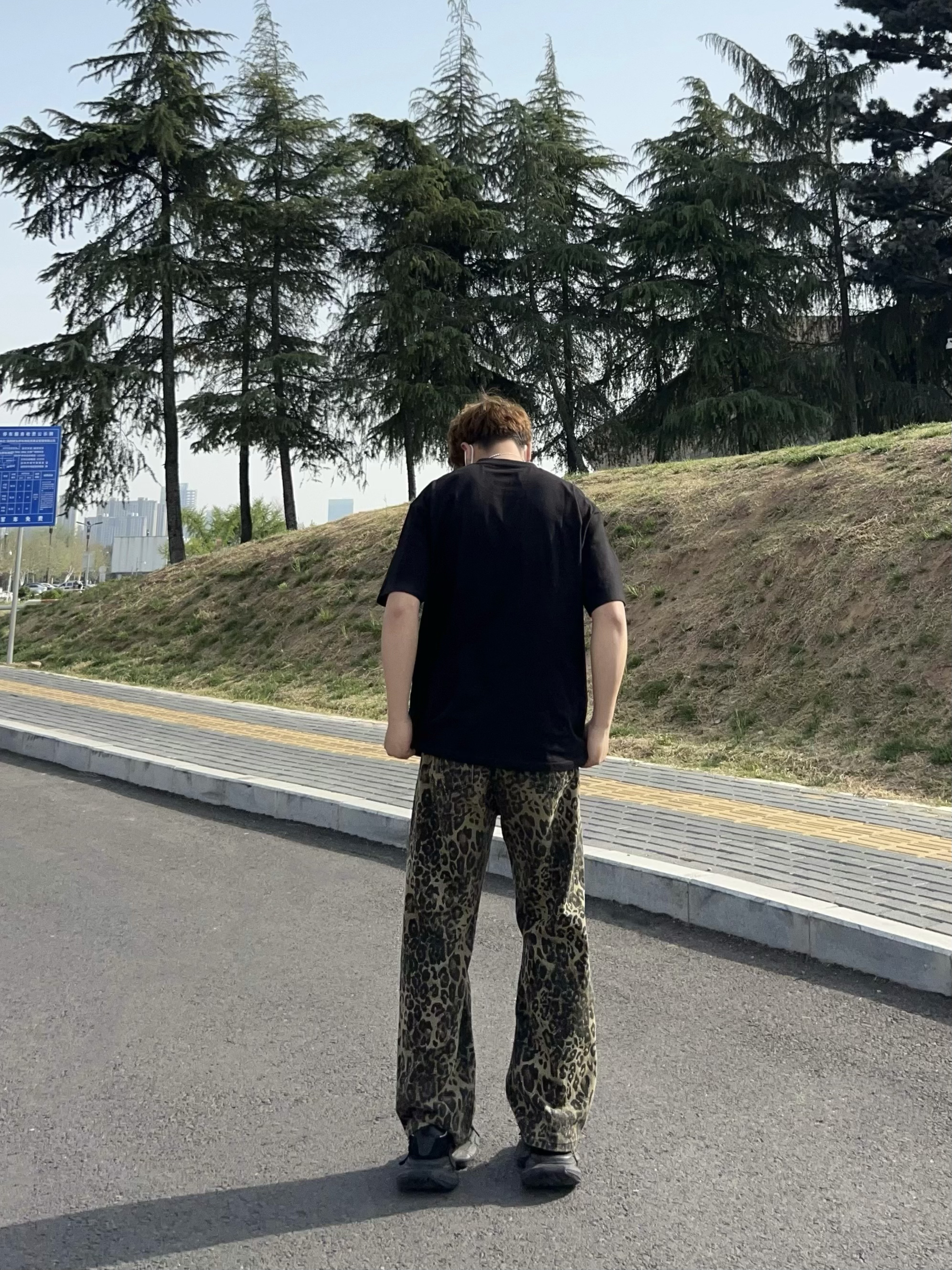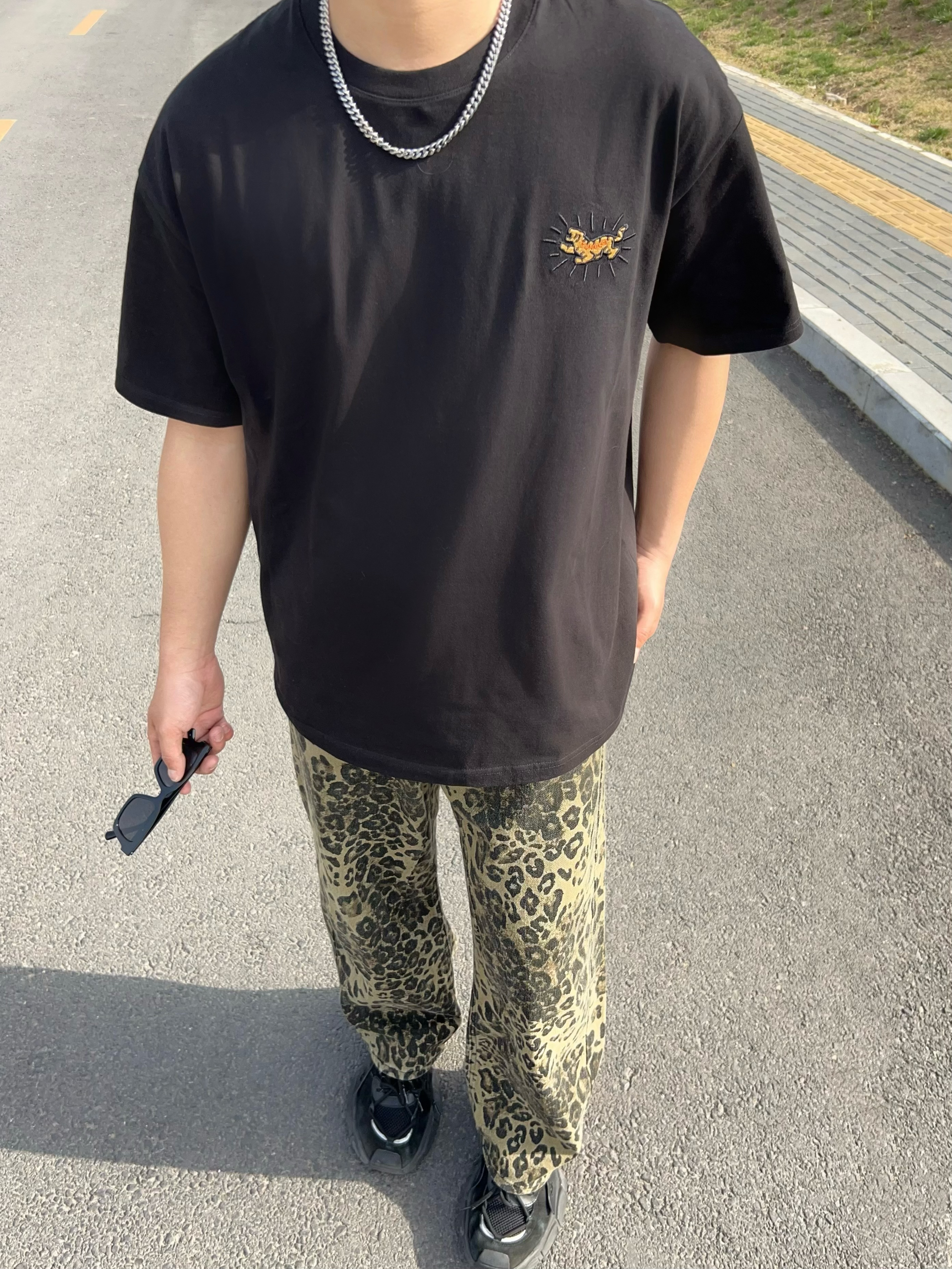 男生根本逃不了黑色短袖的魅力 这款简约黑T上身宽松有型 胸前老虎小刺绣 好精致 搭配一条豹纹裤 这美式风不就来了