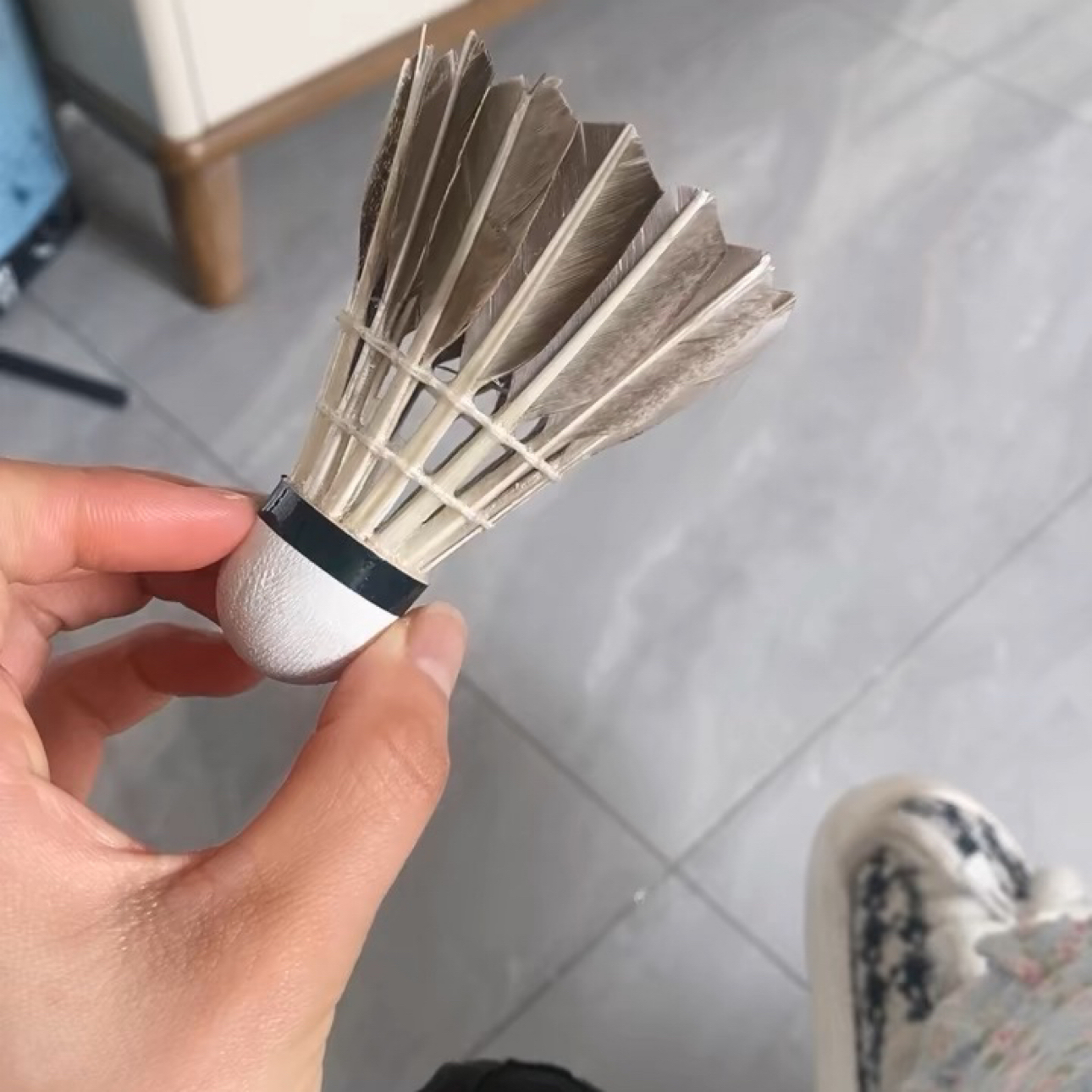 看起来质量挺好👌,买一桶十二个,可以用很久。打开里面是灰色羽毛的羽毛球。 打了半小时之后的样子😁 飞速可以 ,就是不抗风 😥使劲打的还是耐打👌