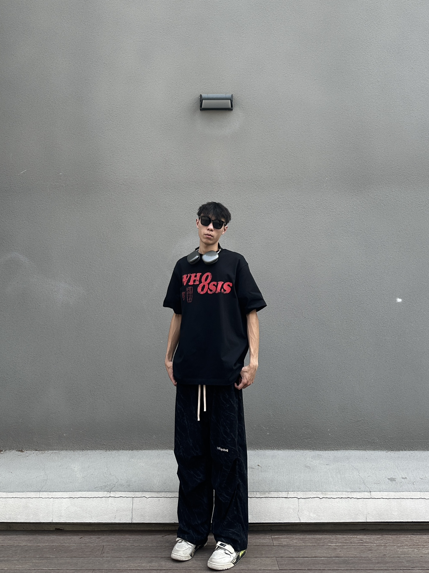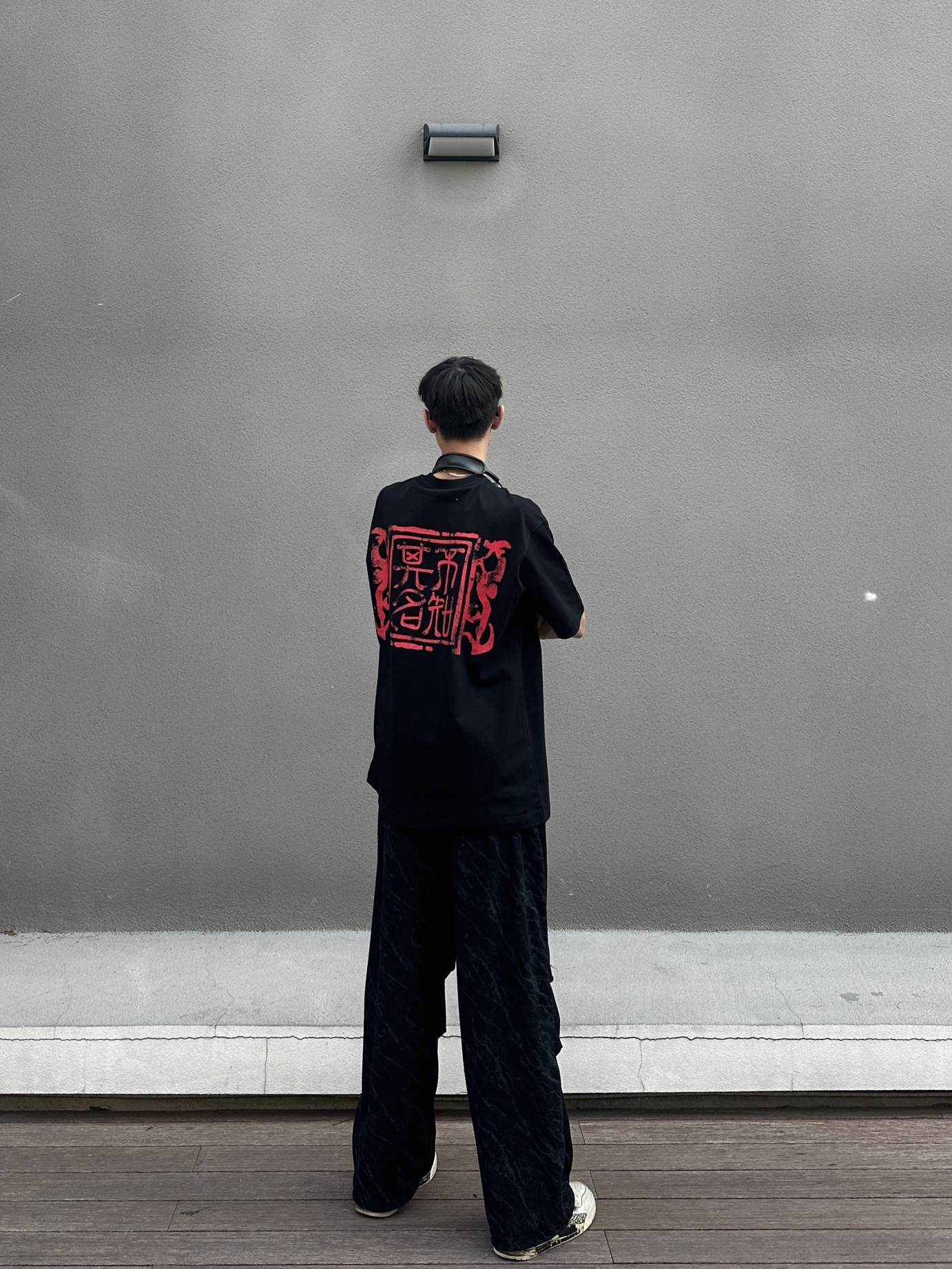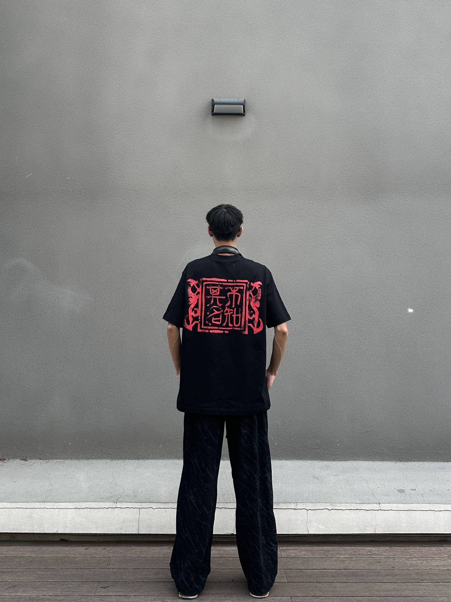 黑色绝对是最百搭的配色了 今日穿搭分享来啦 👔 WHOOSIS 今日上身一件印花圆领短袖 印章印花设计满满中式风味 宽松版型垂感面料很好打理 我182cm 65kg XL码搭配一条黑色伞兵裤 这一身春日舒适感轻松拿捏