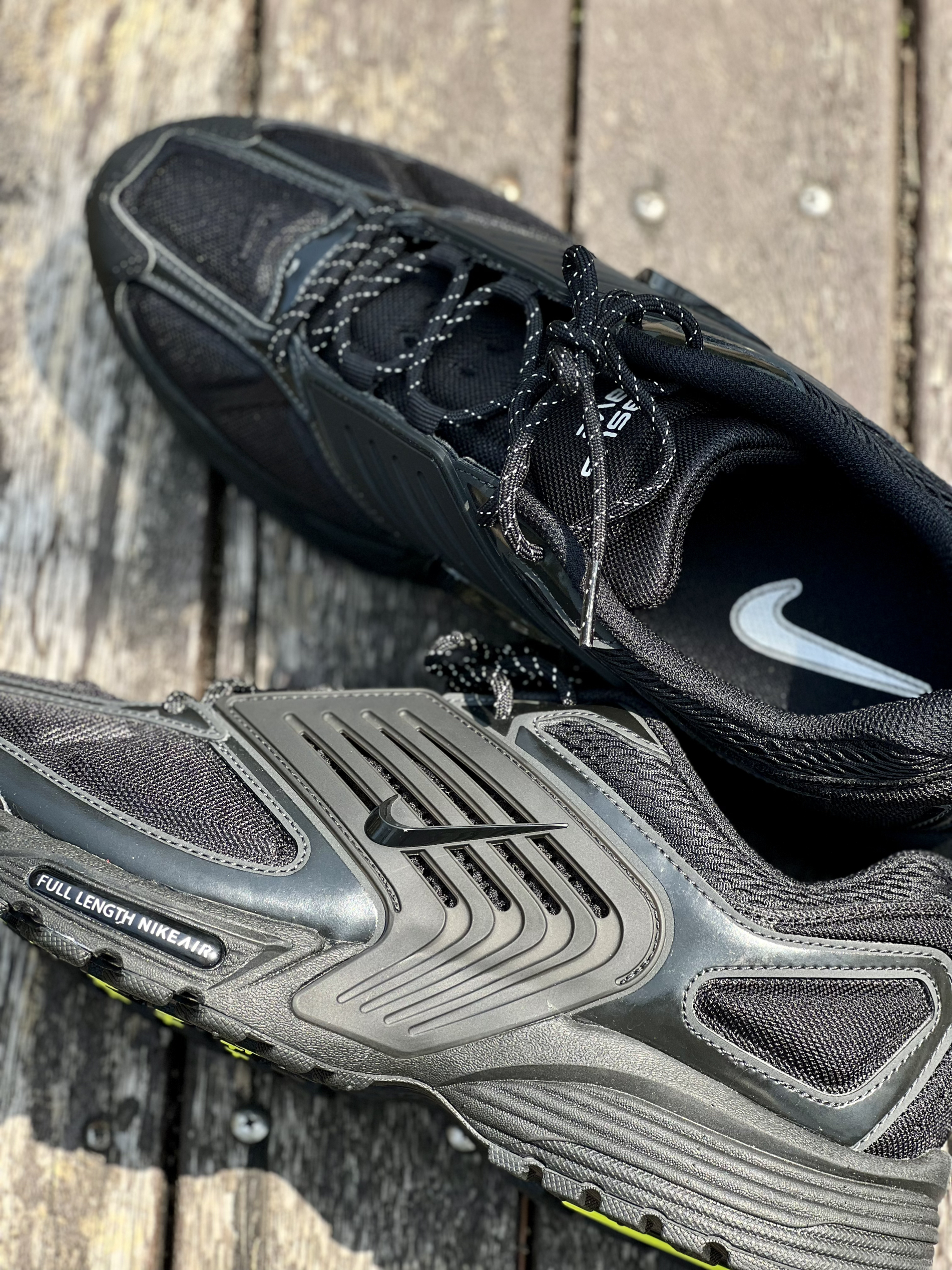这双复古的nike跑鞋,满满的黑武士机能风哇 👟侧边logo里面是网纱材质的透气布料,夏天穿着也是比较OK的。 ✅鞋子上脚的感觉还是蛮舒适的,毕竟是复古慢跑鞋的范畴,日常通勤是不错的选择。 ✅鞋底的荧光绿是挺亮眼的,穿上之后大概有2-3cm的增高效果。 ⭐️有一个小彩蛋就是鞋舌可以上翻变成nike的swooth