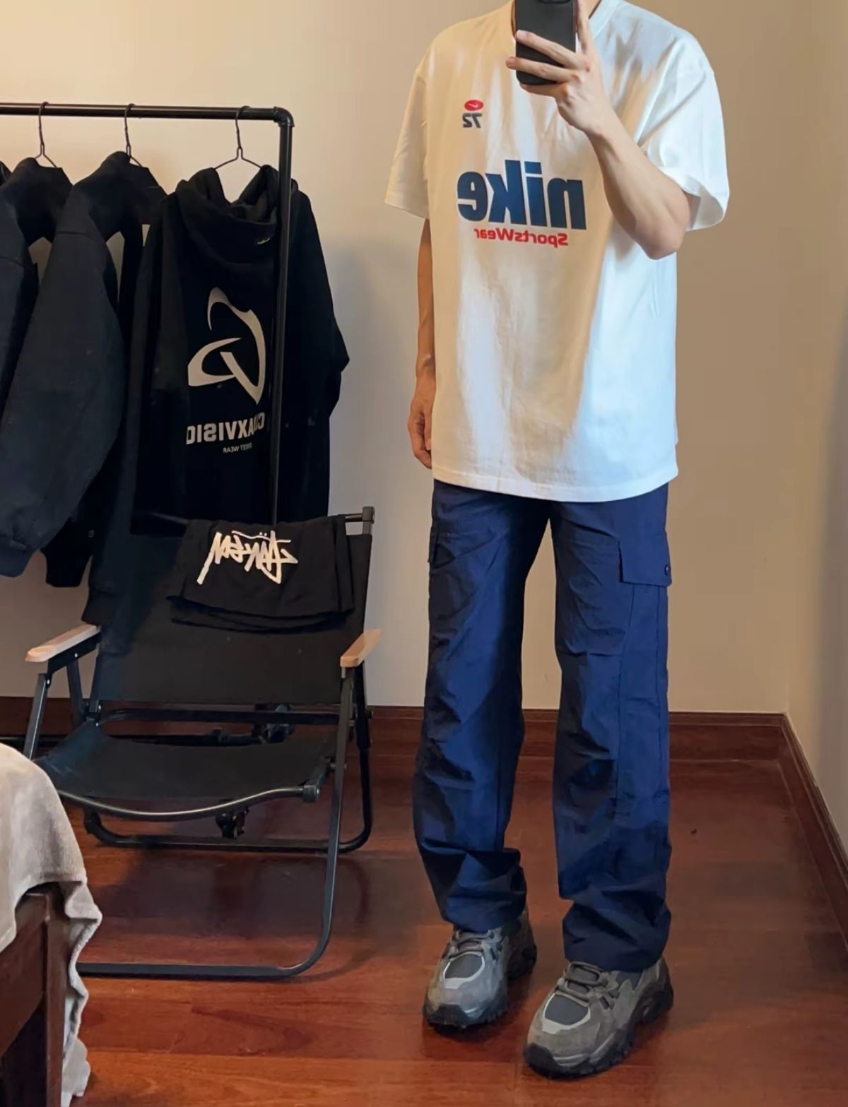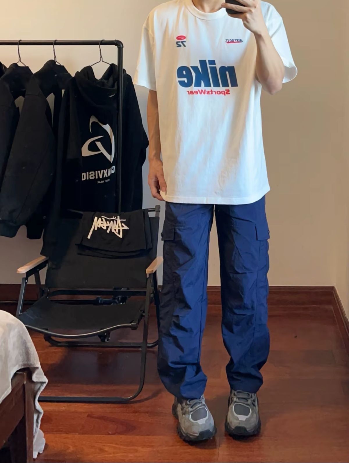 今日份穿搭 酷酷的穿搭就得这样去穿 上衣穿的是Nike家蓝白配色的T恤 穿着很舒服 而且白色穿着就很百搭 穿上有种青春洋溢的感觉 真的很是不错的 下身再来穿一个舒适的冲锋裤加上一双拼色的老爹鞋 这种感觉简直帅呆啦!!!