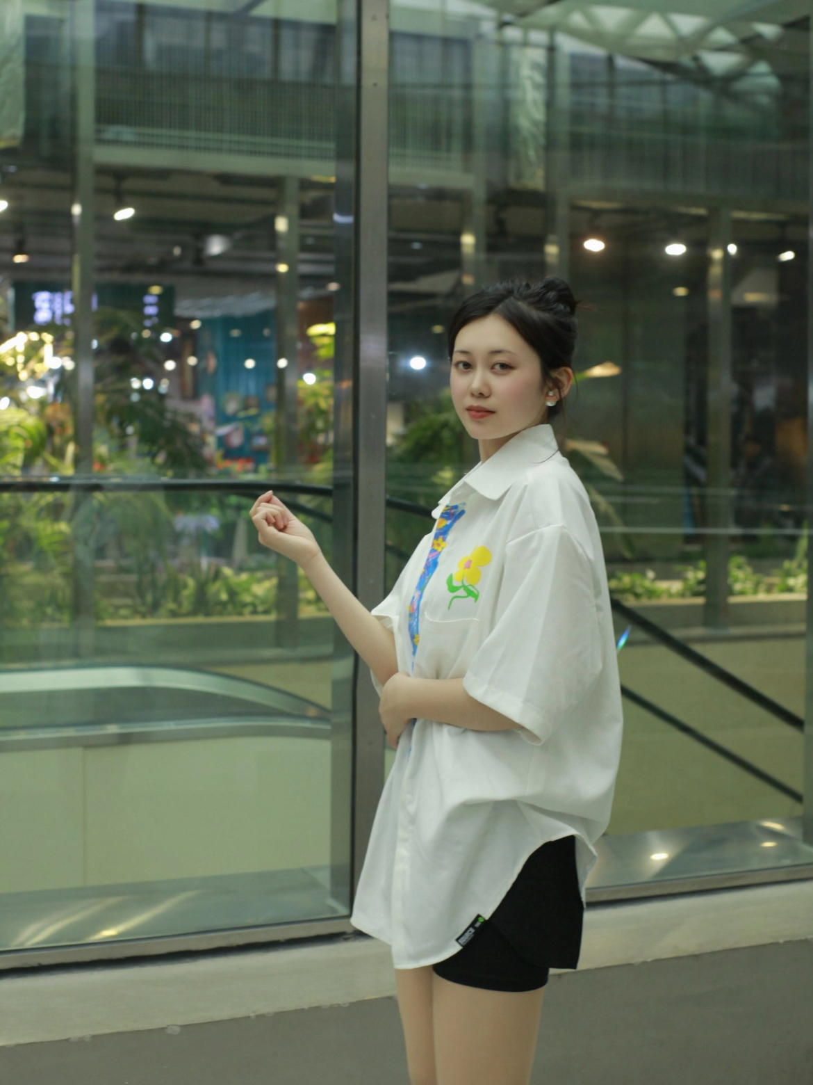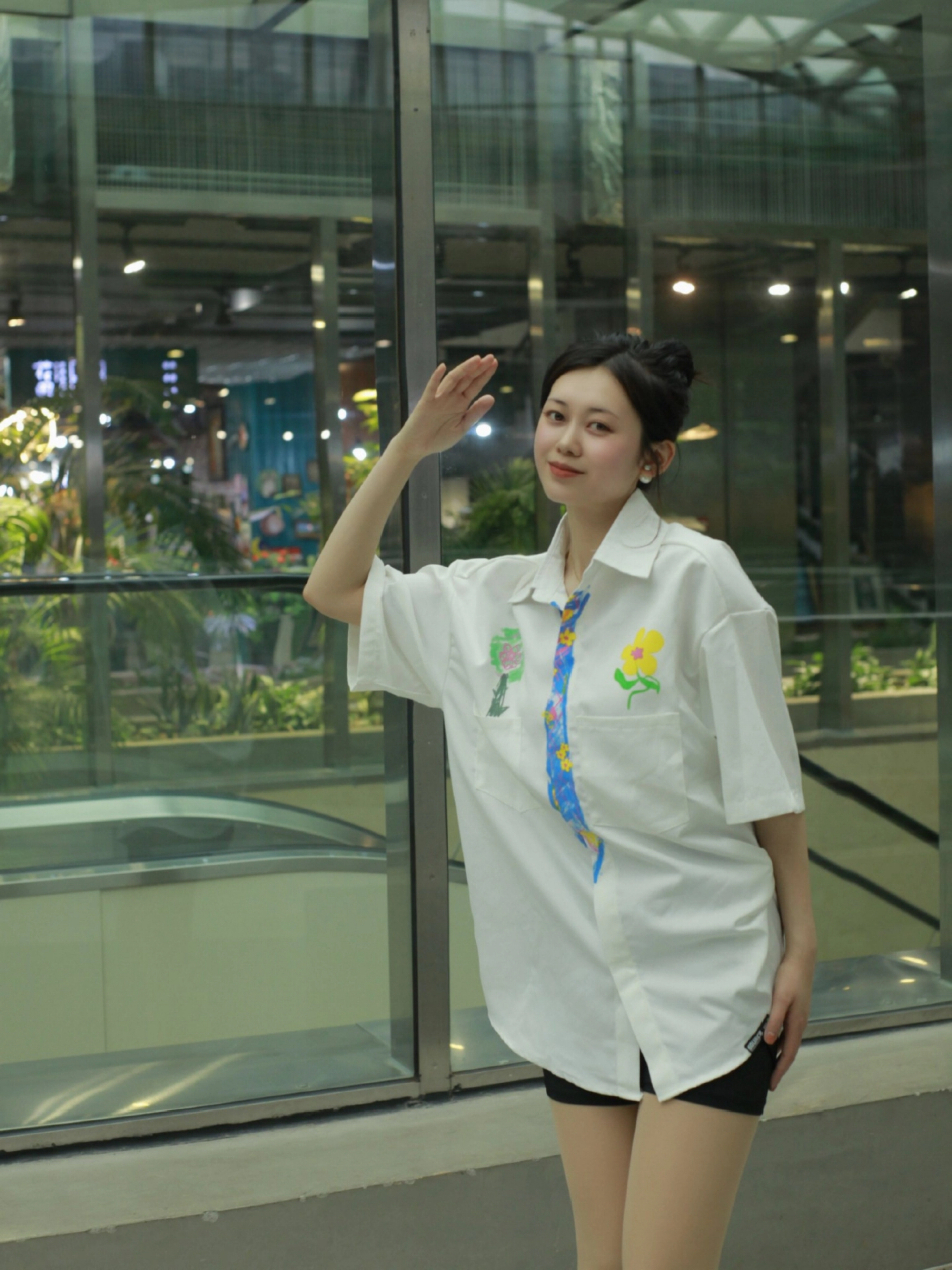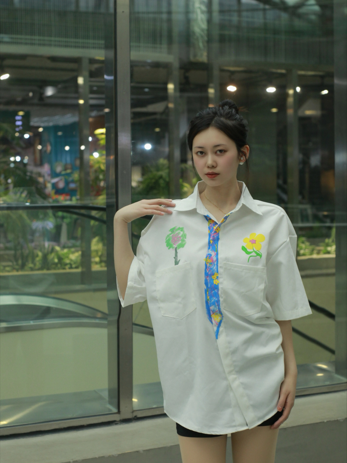 今天来聊聊白衬衫和黑短裤咋搭配~ 【整体look】一件白色的短袖衬衫配上黑色短裤,简单又好看②,还带点美式复古那味儿。男女同款哦,都可以穿! 【图案细节】衬衫上的涂鸦植物花卉,画得栩栩如生 ,就像真的花花草草在衣服上生长。假领带的印花看起来巧妙,增添了复古氛围,让人眼前一亮(。 【版型优点】宽松大码的版型,穿起来可舒服了,没有束缚感。不管你是啥身材,都能轻松hold住 』【材质体验】这衬衫的材质还...