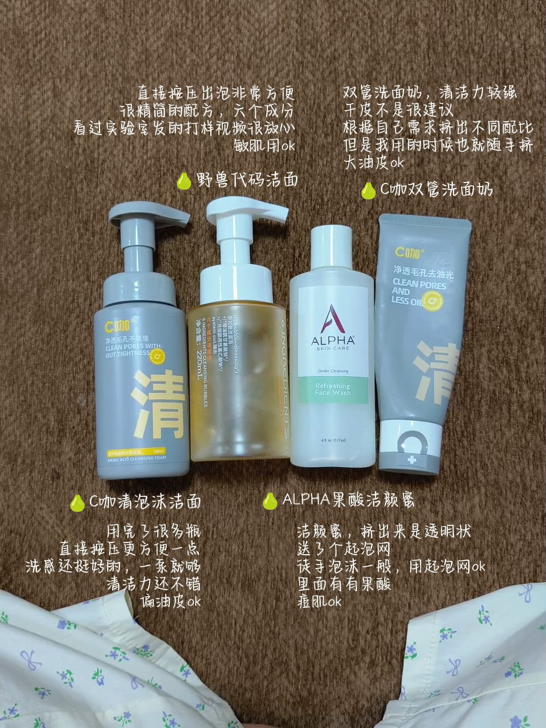 ○洗面奶 C咖清洁面泡沫 野兽代码洁面泡 ALPHA洁颜蜜 C咖双管洗面奶 ○去黑头 科颜氏白泥 Q+A苹果酸啫喱 ○卸妆油 芭比波朗卸妆油 兰糯米卸妆油 ○卸妆膏 且初卸妆膏 C咖卸妆膏
