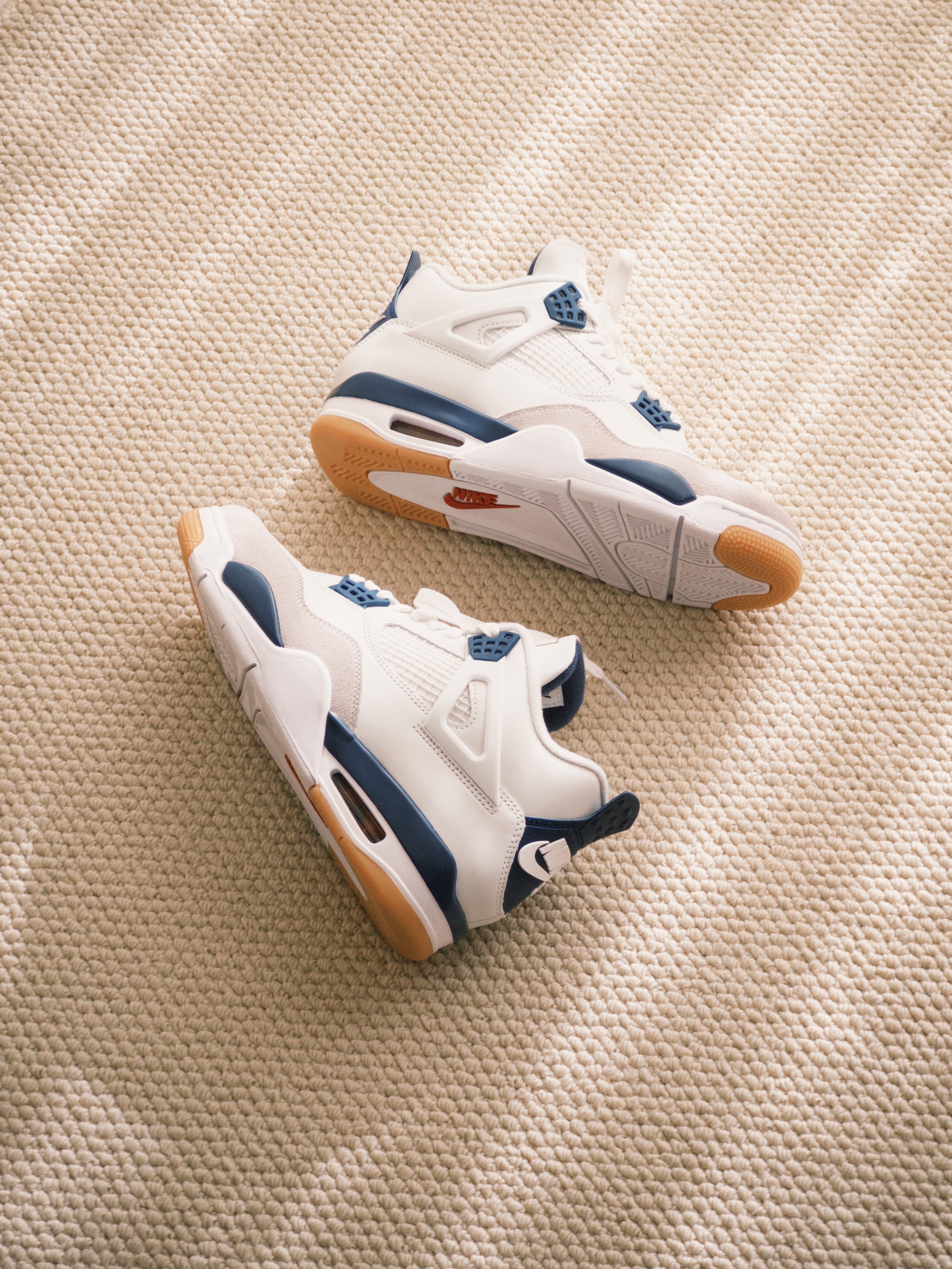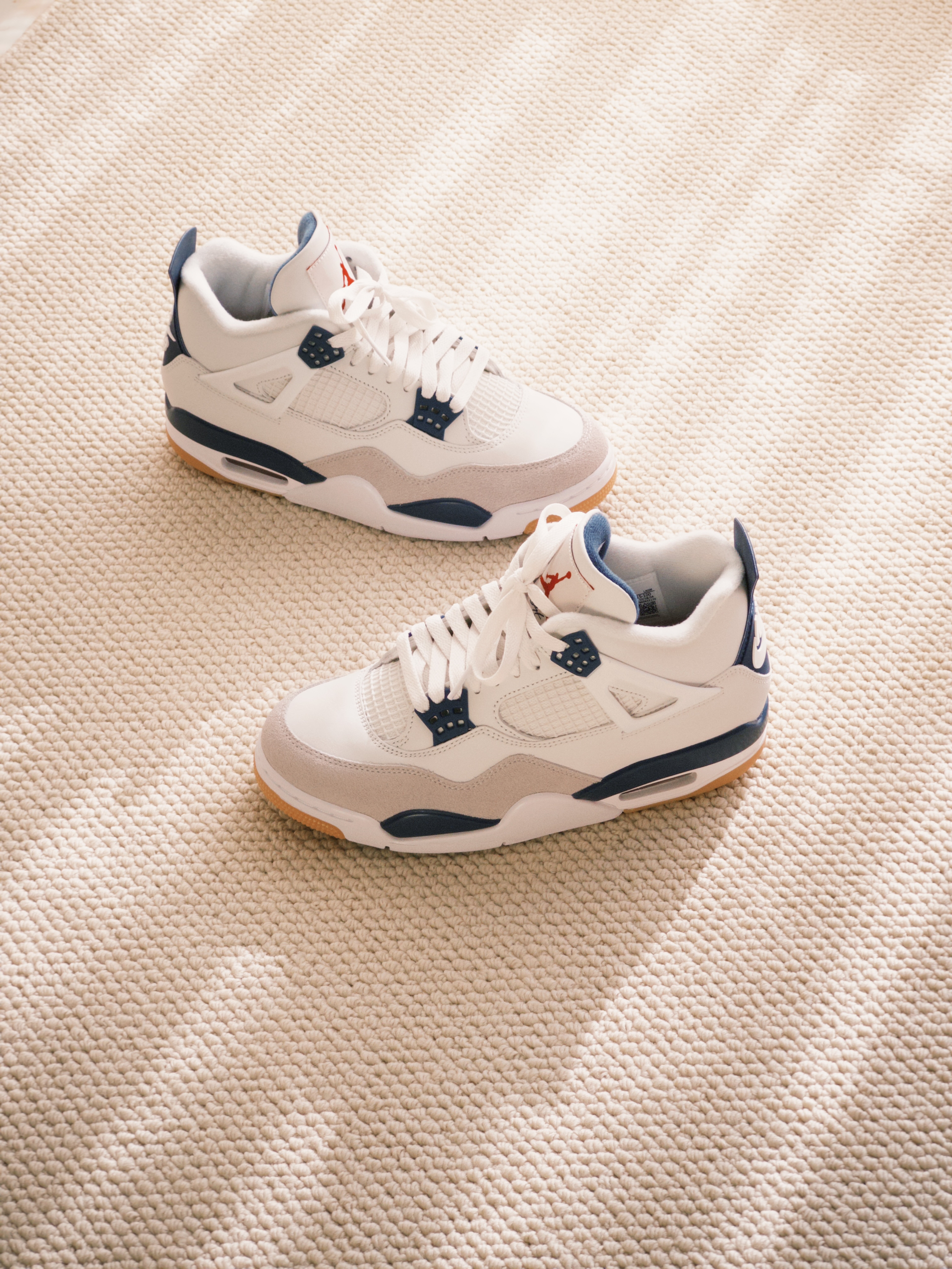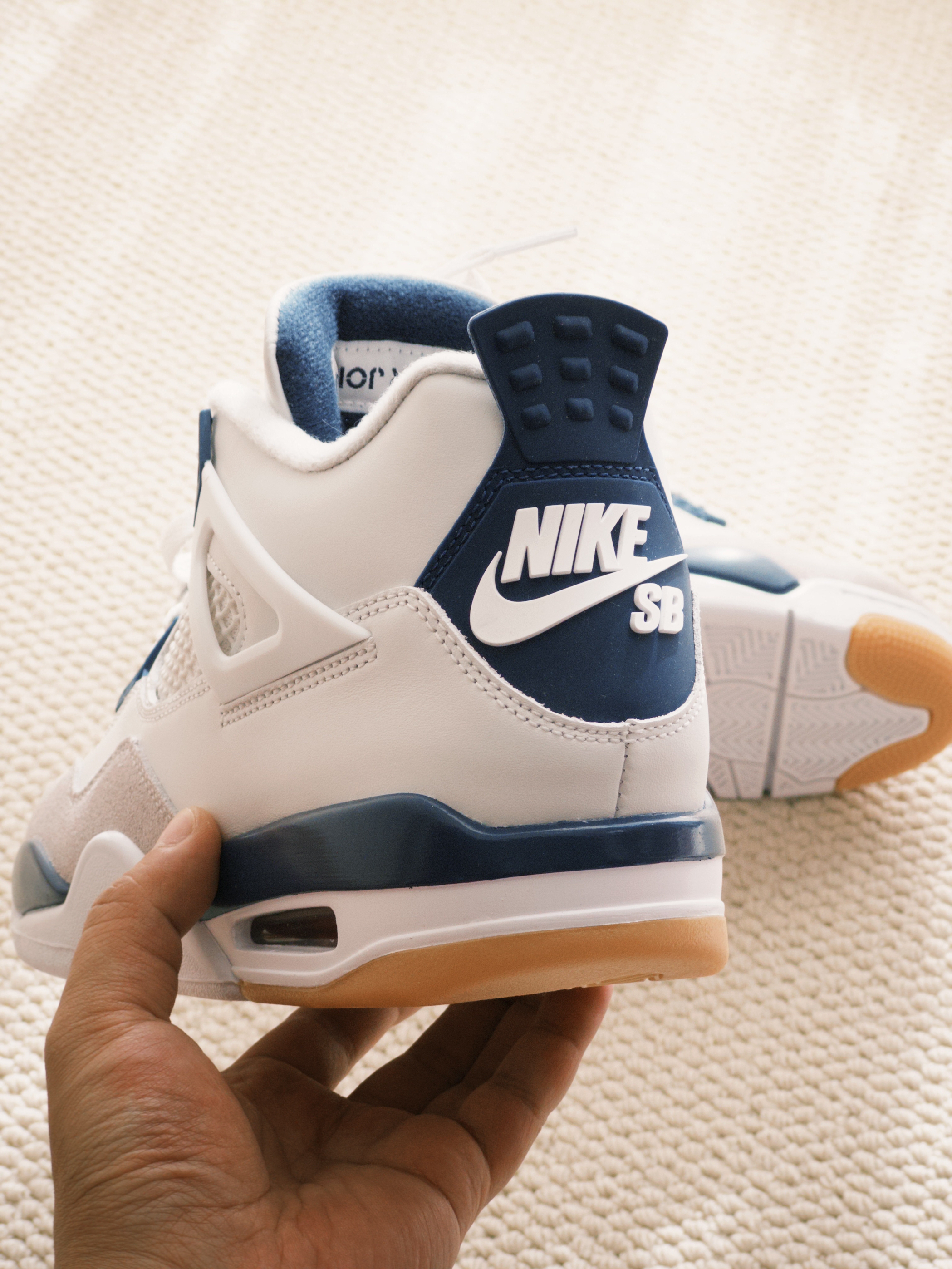 白绿配色的绿松石颜色有点出挑,还是白蓝更适合中年男人,撑着阳光明媚,加上滤镜,复古感拉满! 这款 SB 联名的填充物比其他 AJ4 厚实,留着秋冬外穿,不知道各位潮人能不买耐得住。 材质用料确实可以,全牛皮革皮质细腻,鞋底比之前的橡胶略微软那么一点,两侧和后跟塑料材质比普款更柔软。