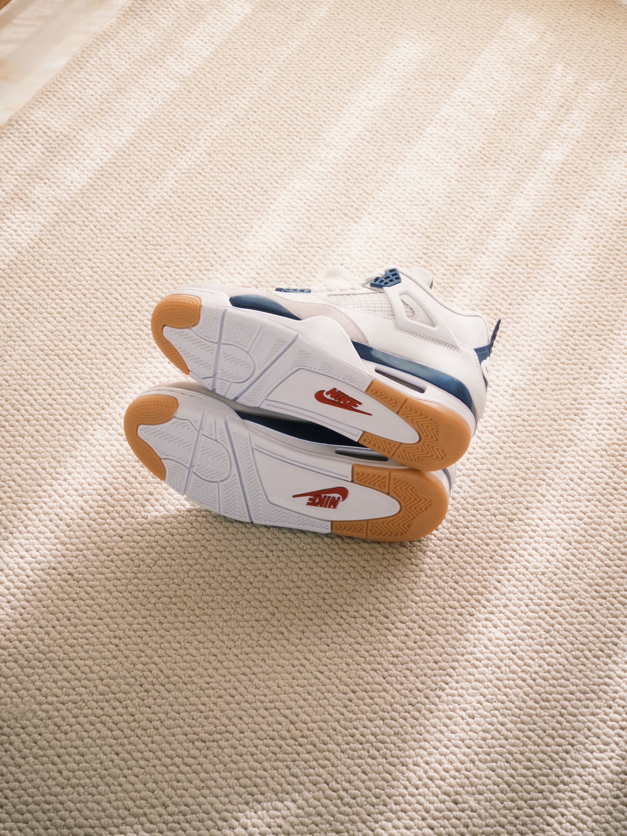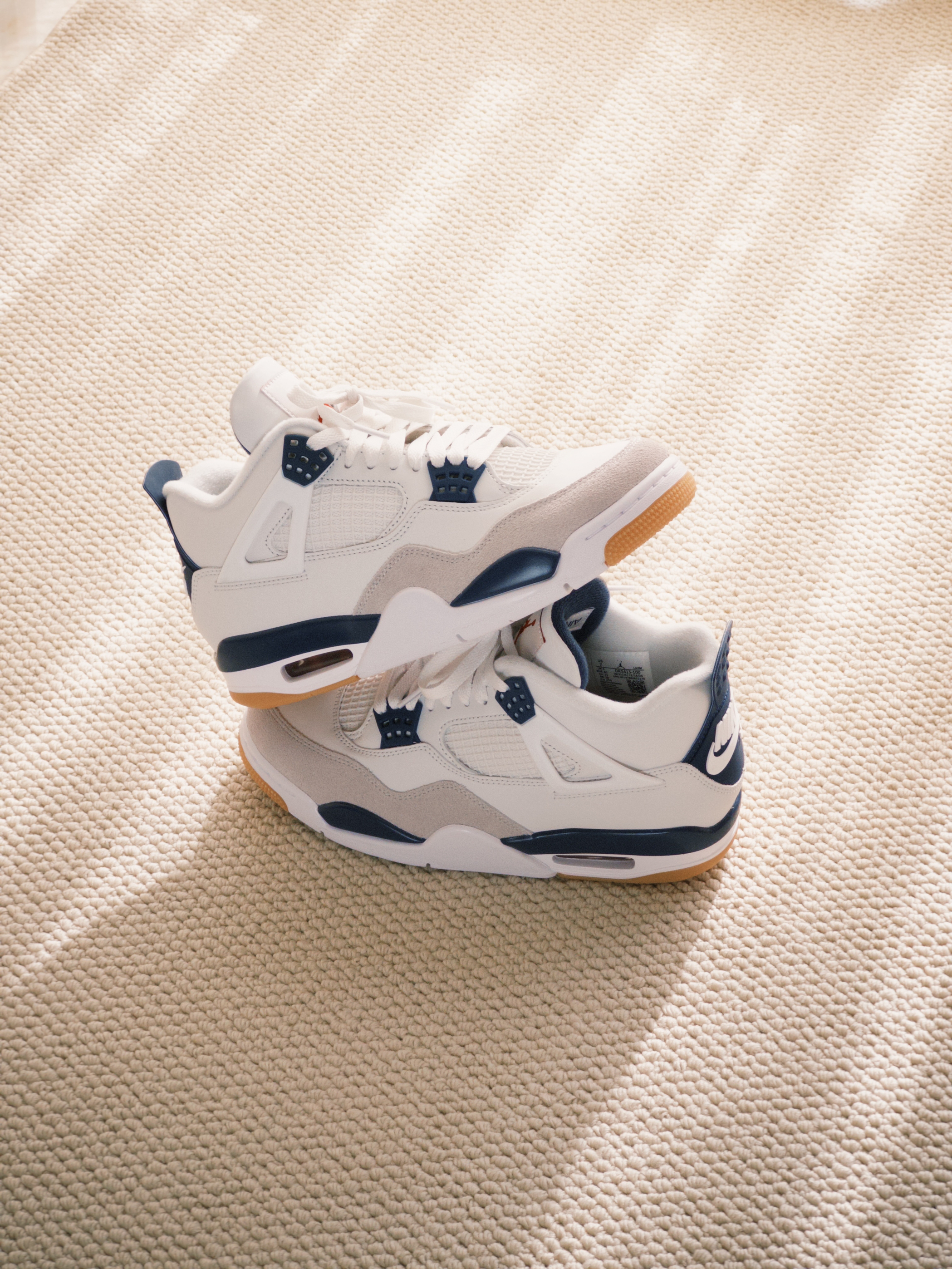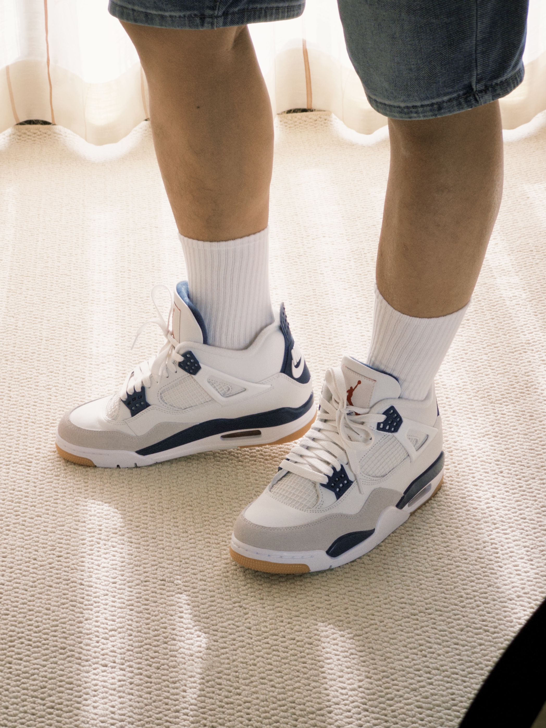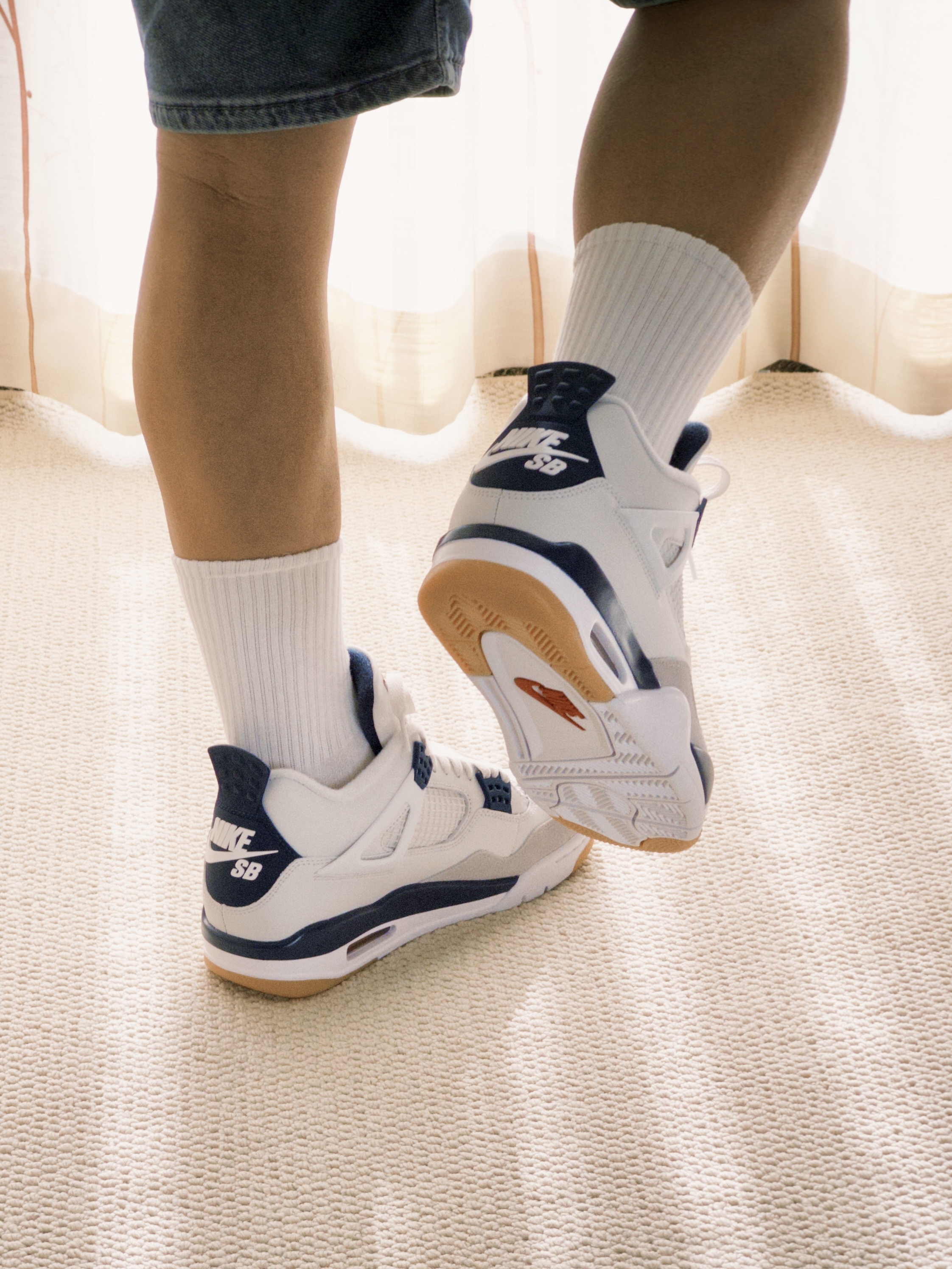 白绿配色的绿松石颜色有点出挑,还是白蓝更适合中年男人,撑着阳光明媚,加上滤镜,复古感拉满! 这款 SB 联名的填充物比其他 AJ4 厚实,留着秋冬外穿,不知道各位潮人能不买耐得住。 材质用料确实可以,全牛皮革皮质细腻,鞋底比之前的橡胶略微软那么一点,两侧和后跟塑料材质比普款更柔软。