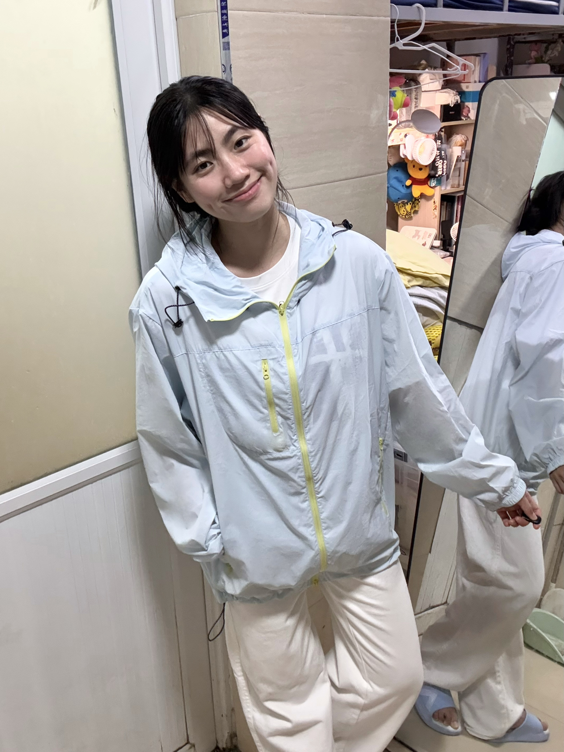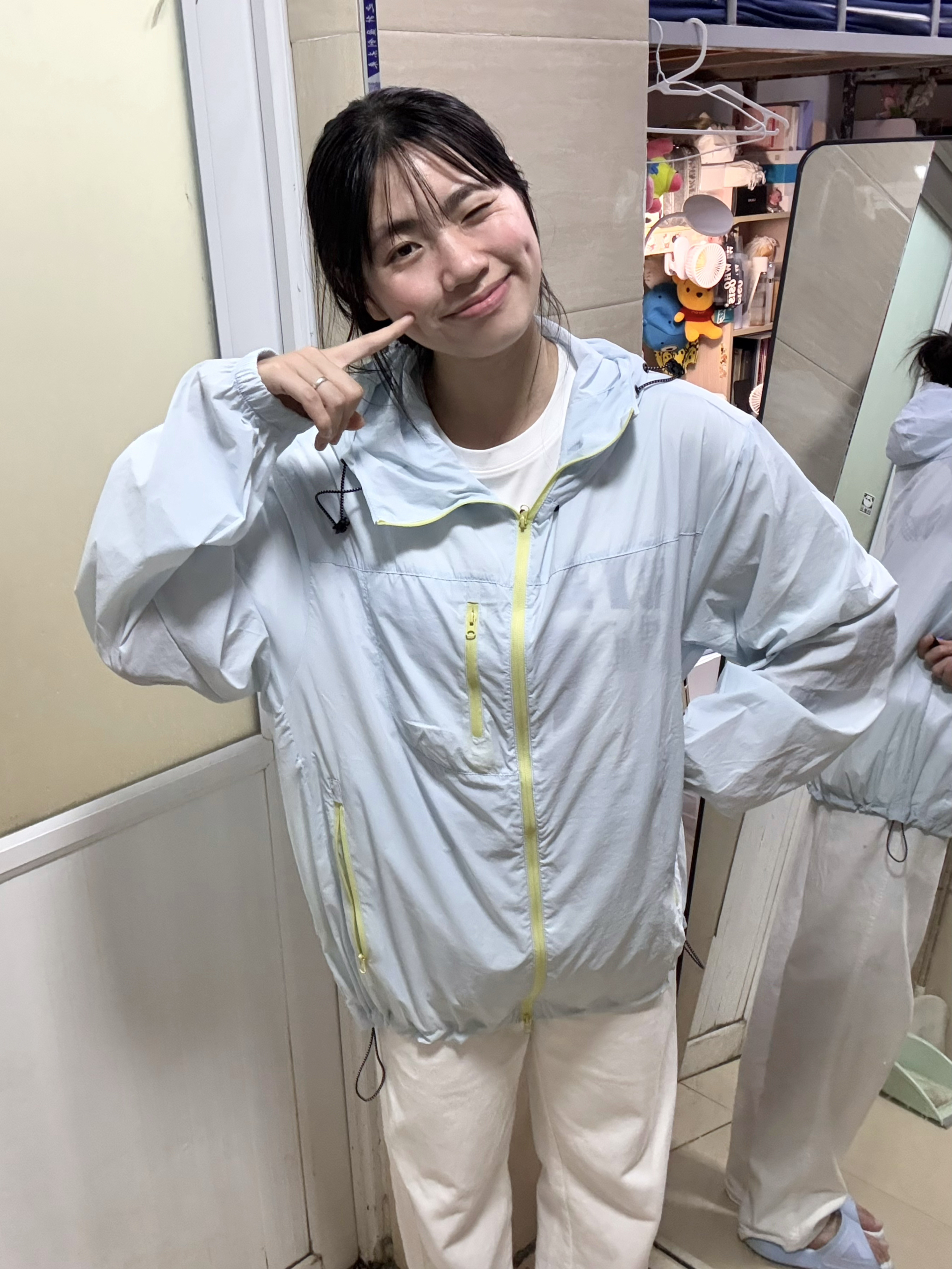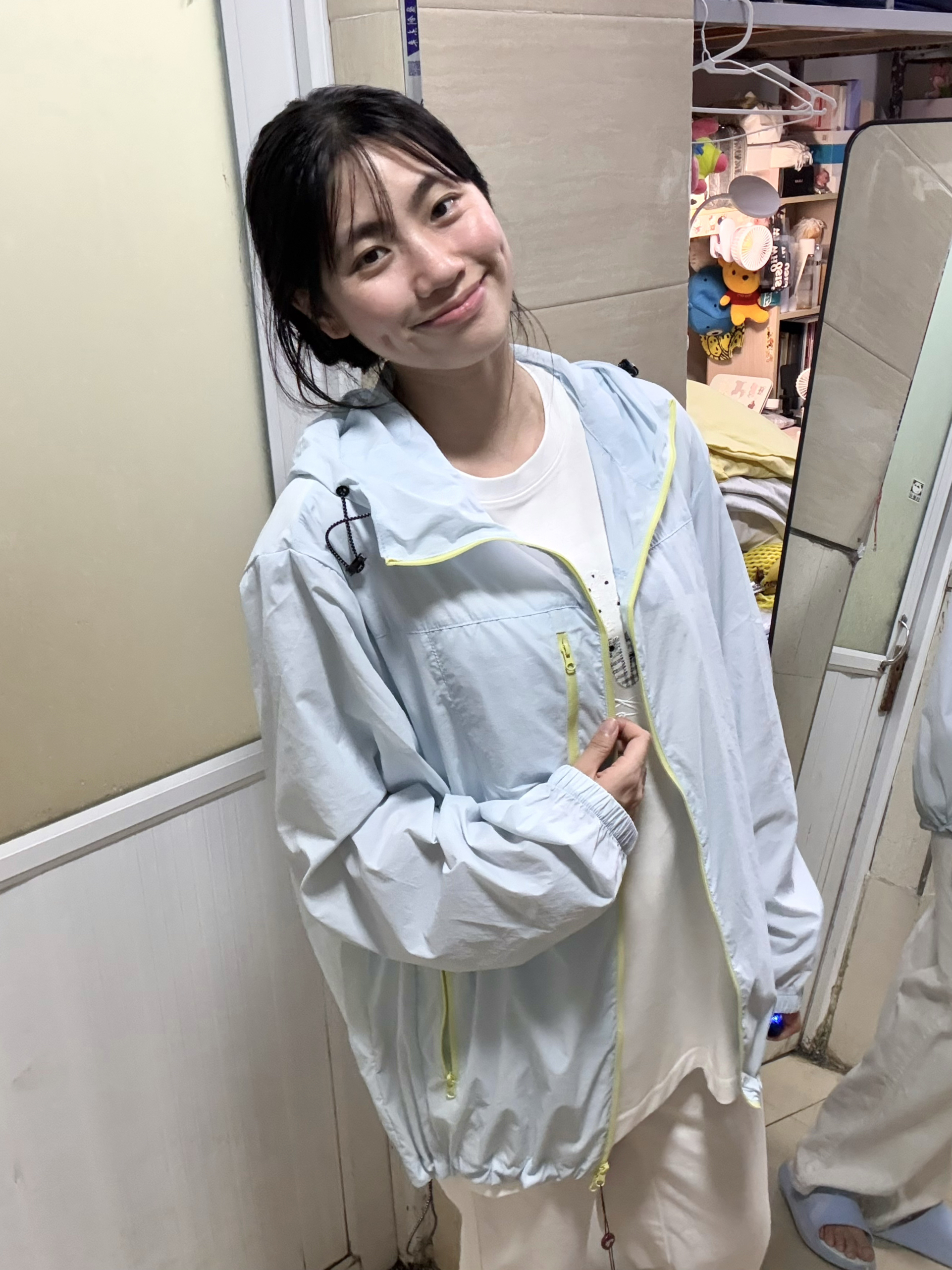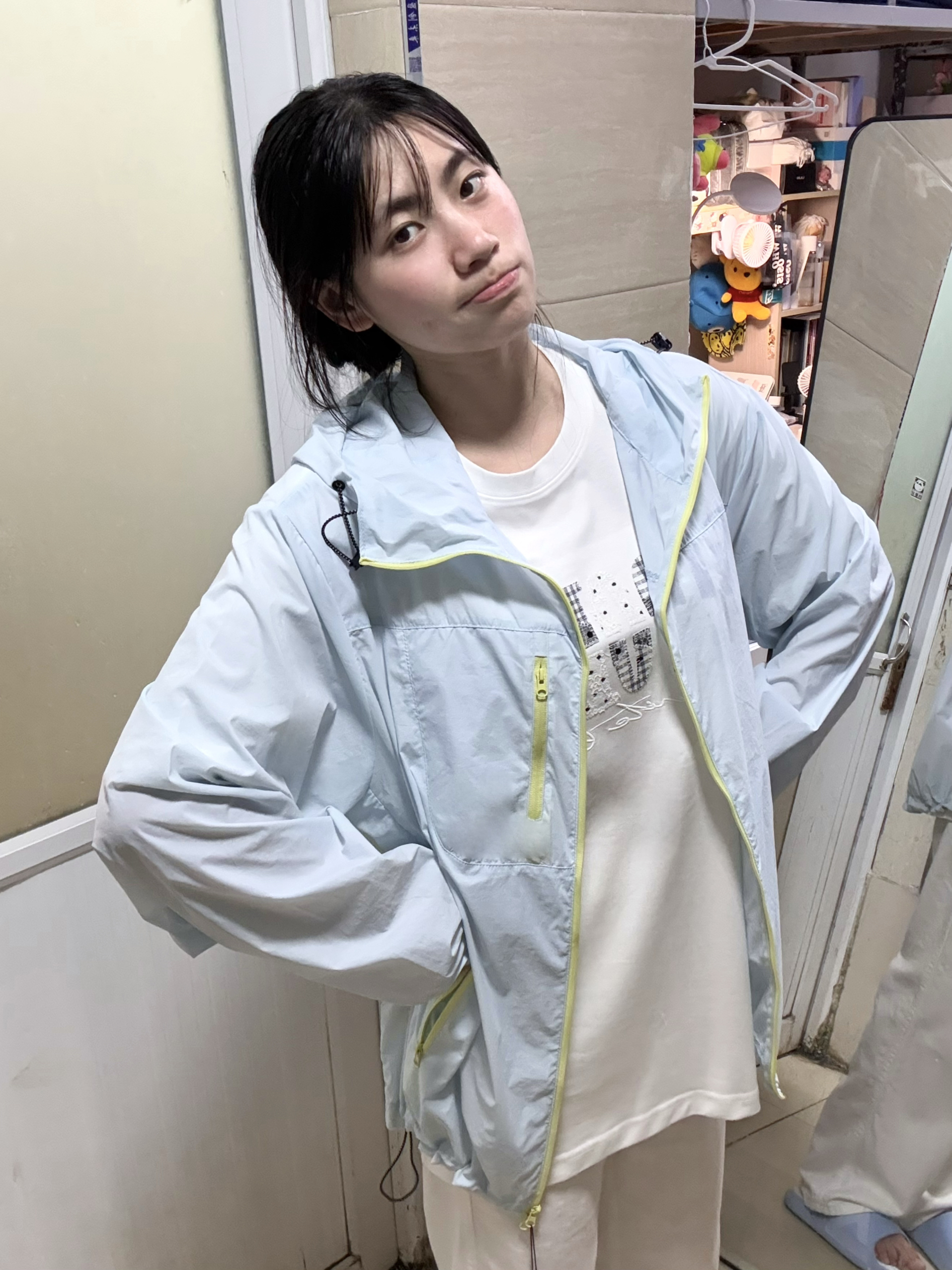 166 102穿的是M码 奶蓝色真的好嫩 穿上人都显得有气色有活力呢 而且上身也不会闷热 很凉快 防晒值有50+ 喜欢的宝宝可以参考一下哦