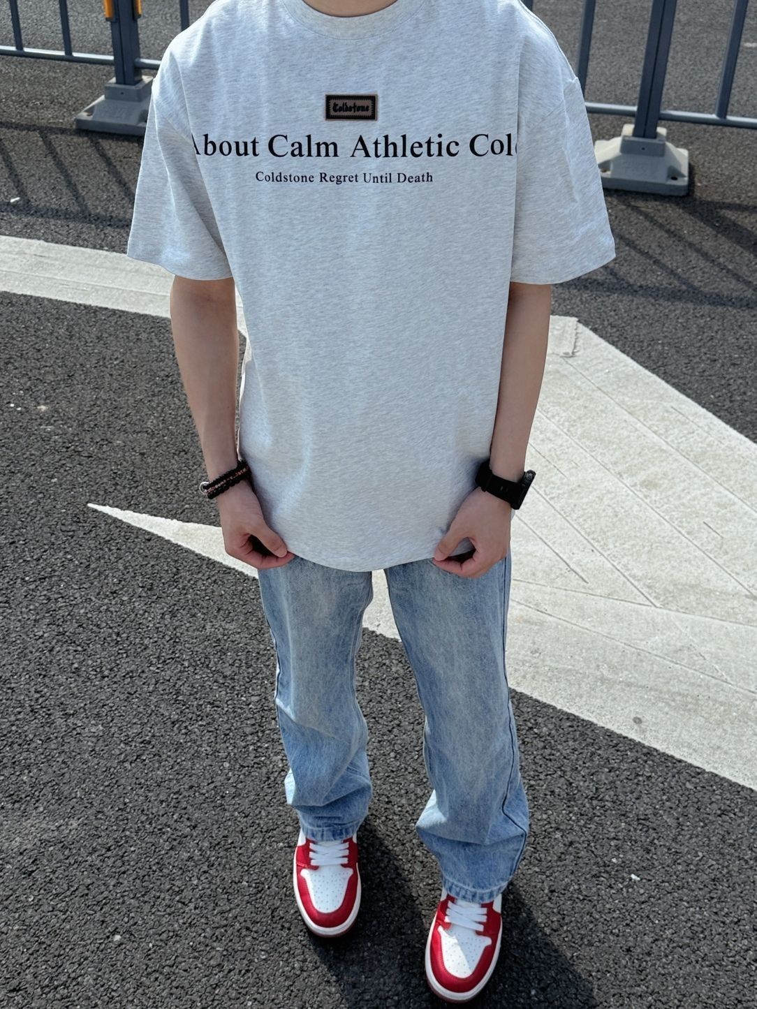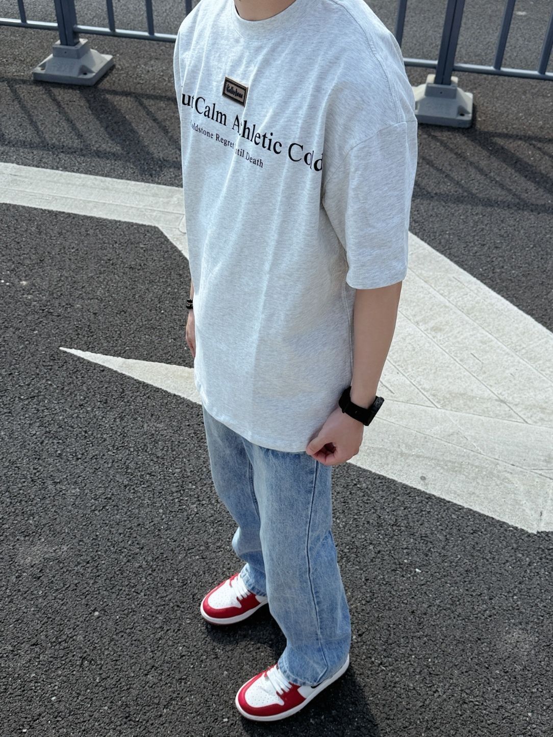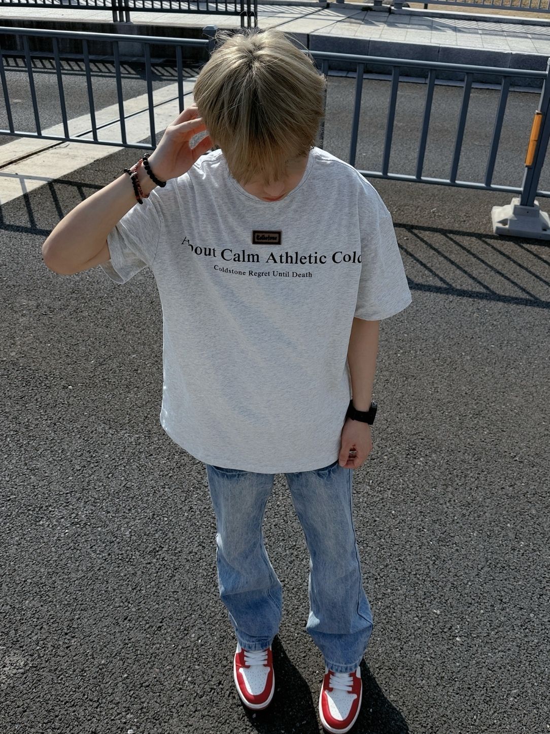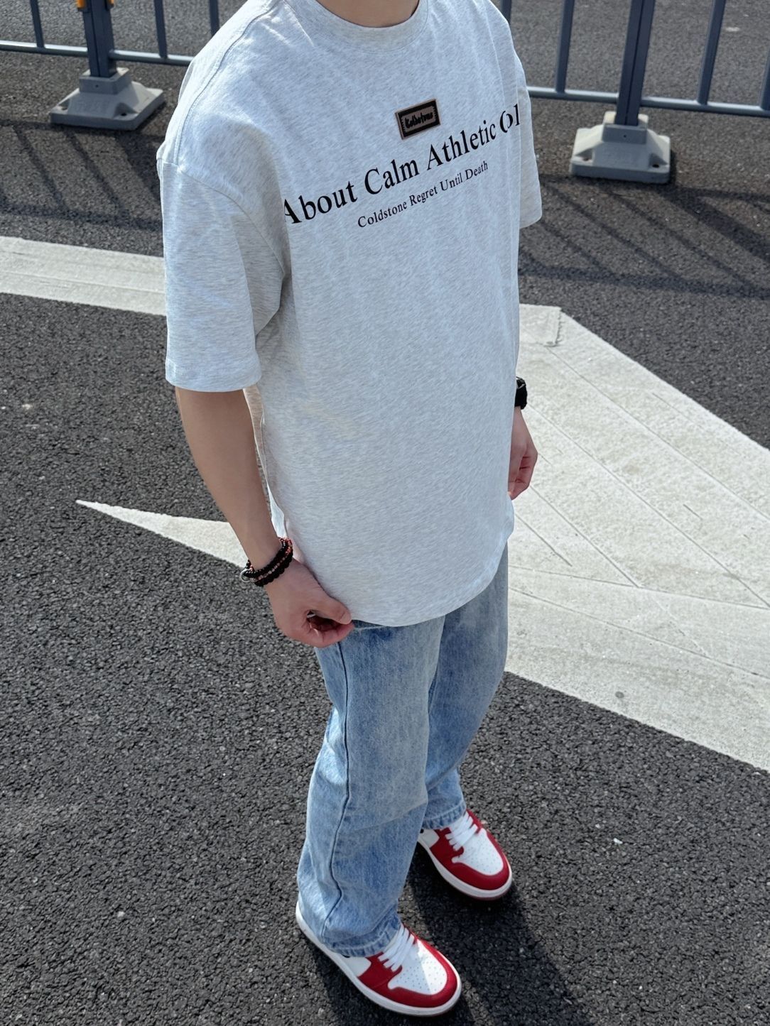 早春简约搭配 简约的标语短袖 灰色更加百搭出片 衣服版型也很好 搭配闪电纹蓝牛真的帅 裤子直筒的版型适合大多数人 这一套休闲干净好舒服!