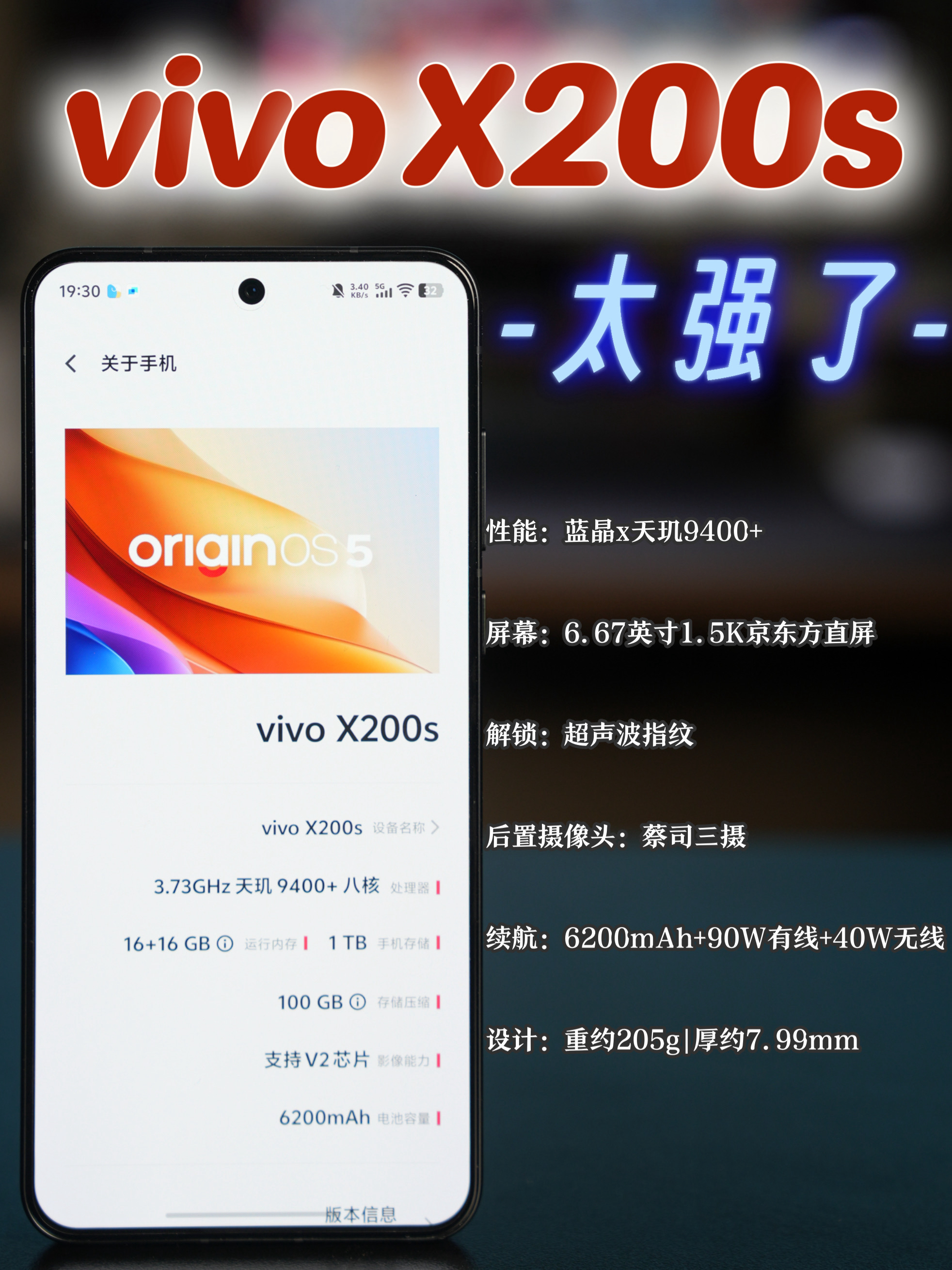 蓝厂这次太高调了,vivo X200s一款标准版手机做成这样,你让友商怎么活? 给了天玑9400+ 的强悍性能、给了1.5K的京东方Q10直屏,甚至还大手笔的把超声波指纹都安排上了。续航有6200mAh的蓝海大电池+90W有线闪充+40W无线充电,无线充电也没有缺席。 影像方面就更不用多说了,这是蓝厂的一贯优势。蔡司三摄,随便怎么拍都很出片。我喜欢的长焦微距也保留了。另外新增的AI天气变装...