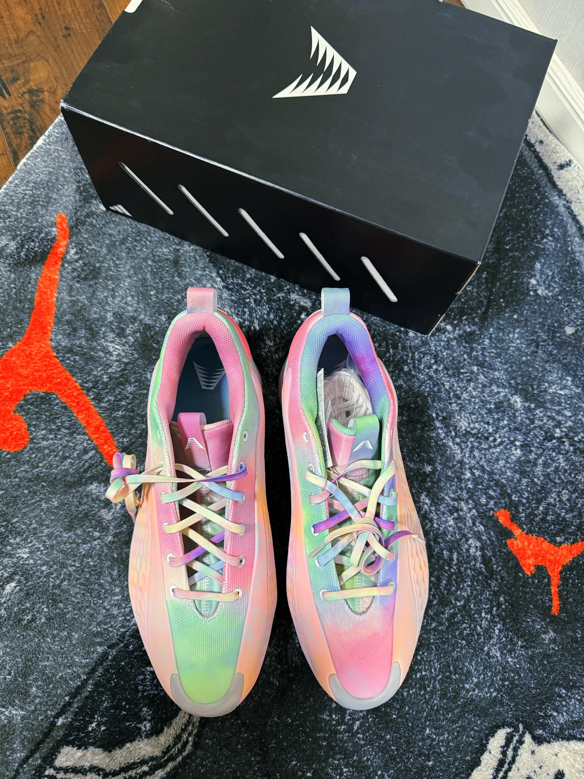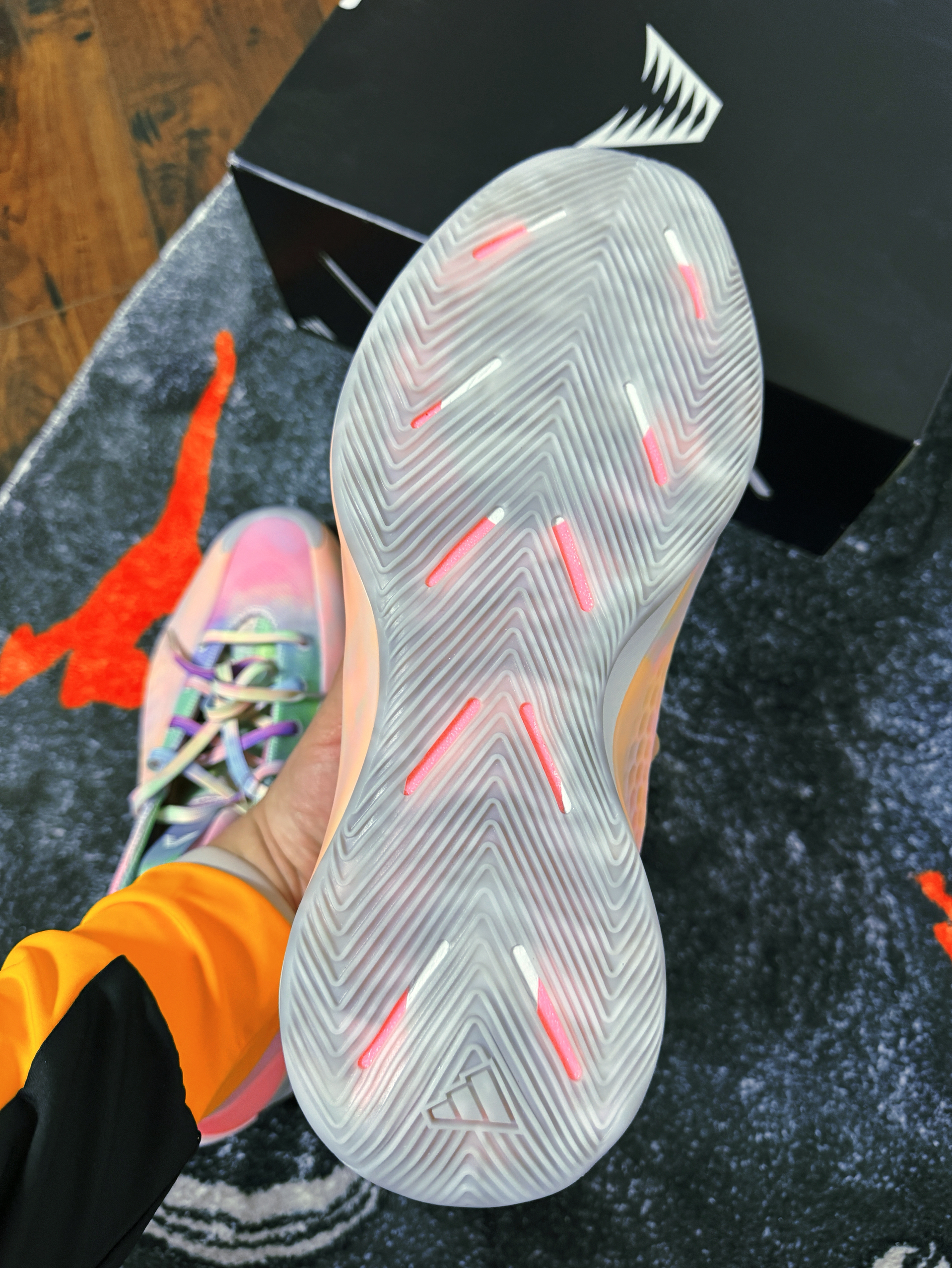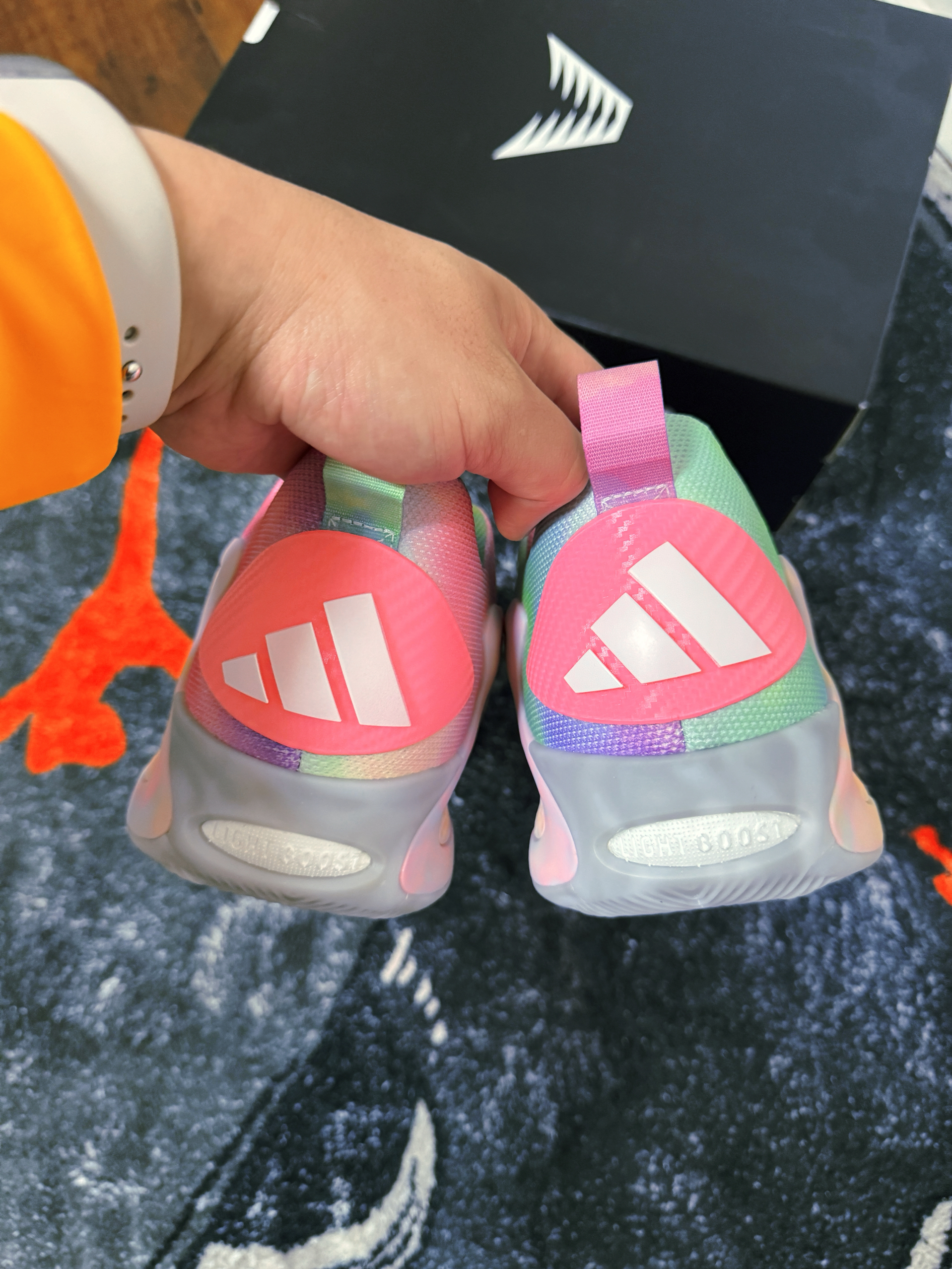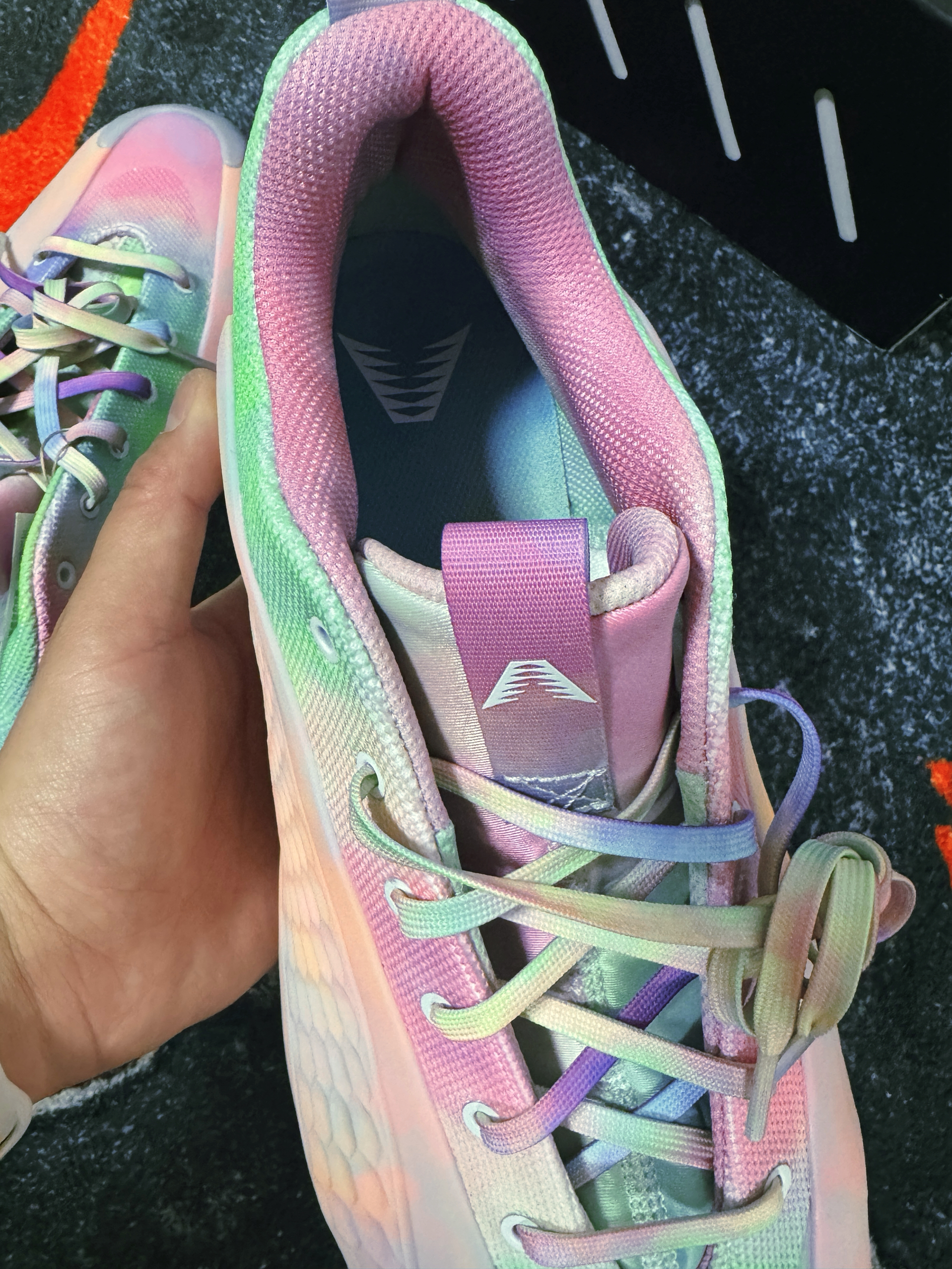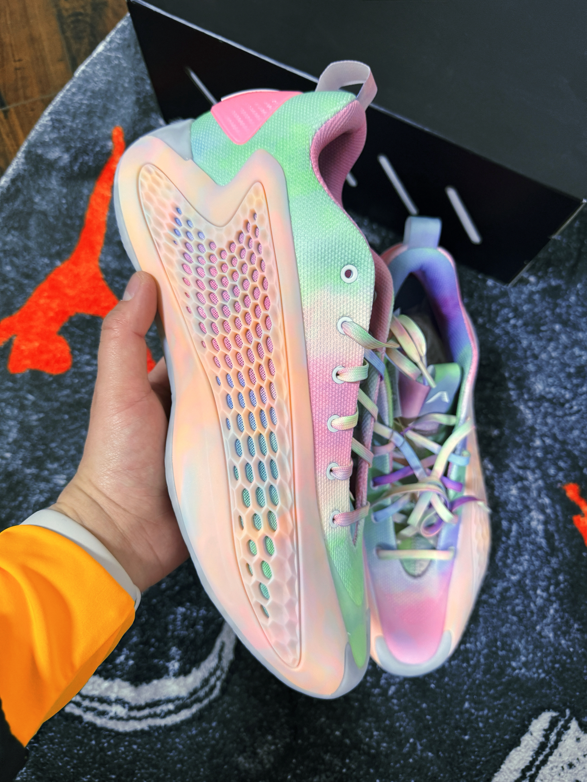 其实爱德华兹1代这双球鞋 打篮球并没有那么舒服 那么优秀的实战性能 所以我更加喜欢这双球鞋的颜值外观 很适合日常出街 和穿搭的一个搭配 这个扎染配色 很有潮流的感觉 粉色 紫色 蓝色 绿色 灰色的一个渲染搭配 还是我比较会选潮鞋😎