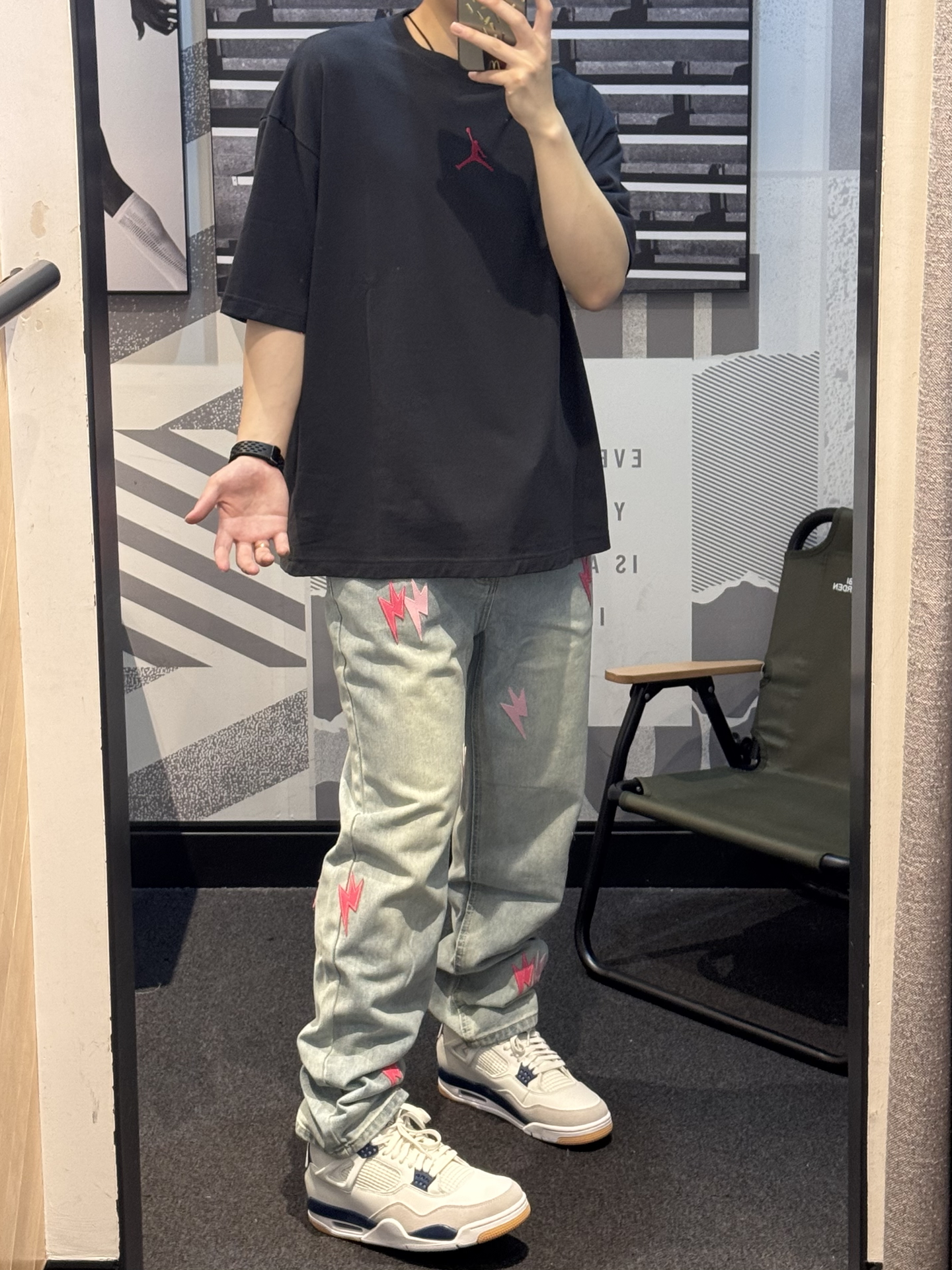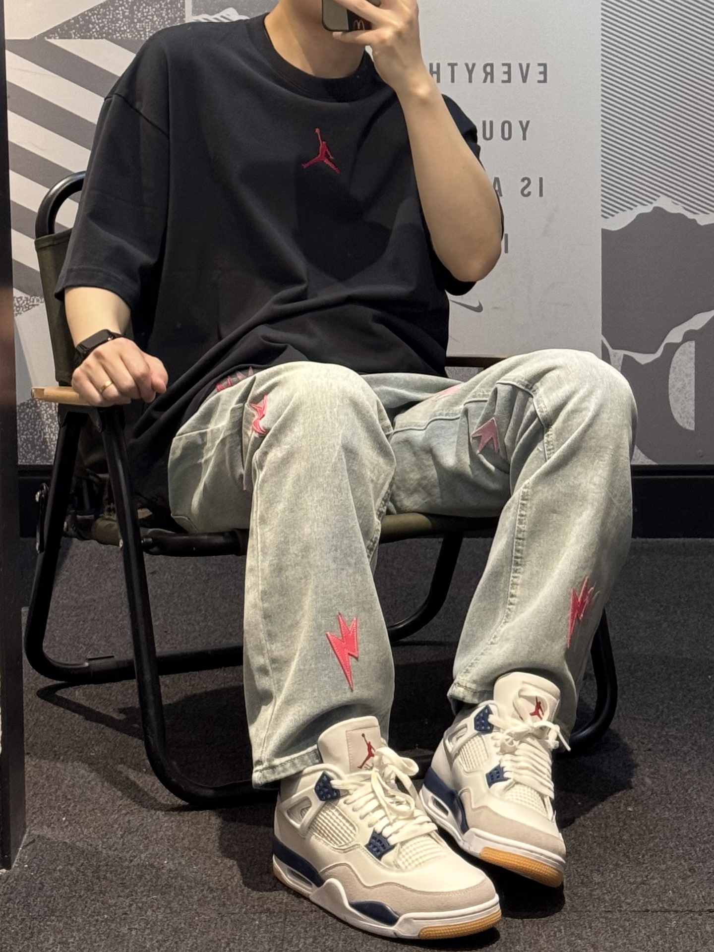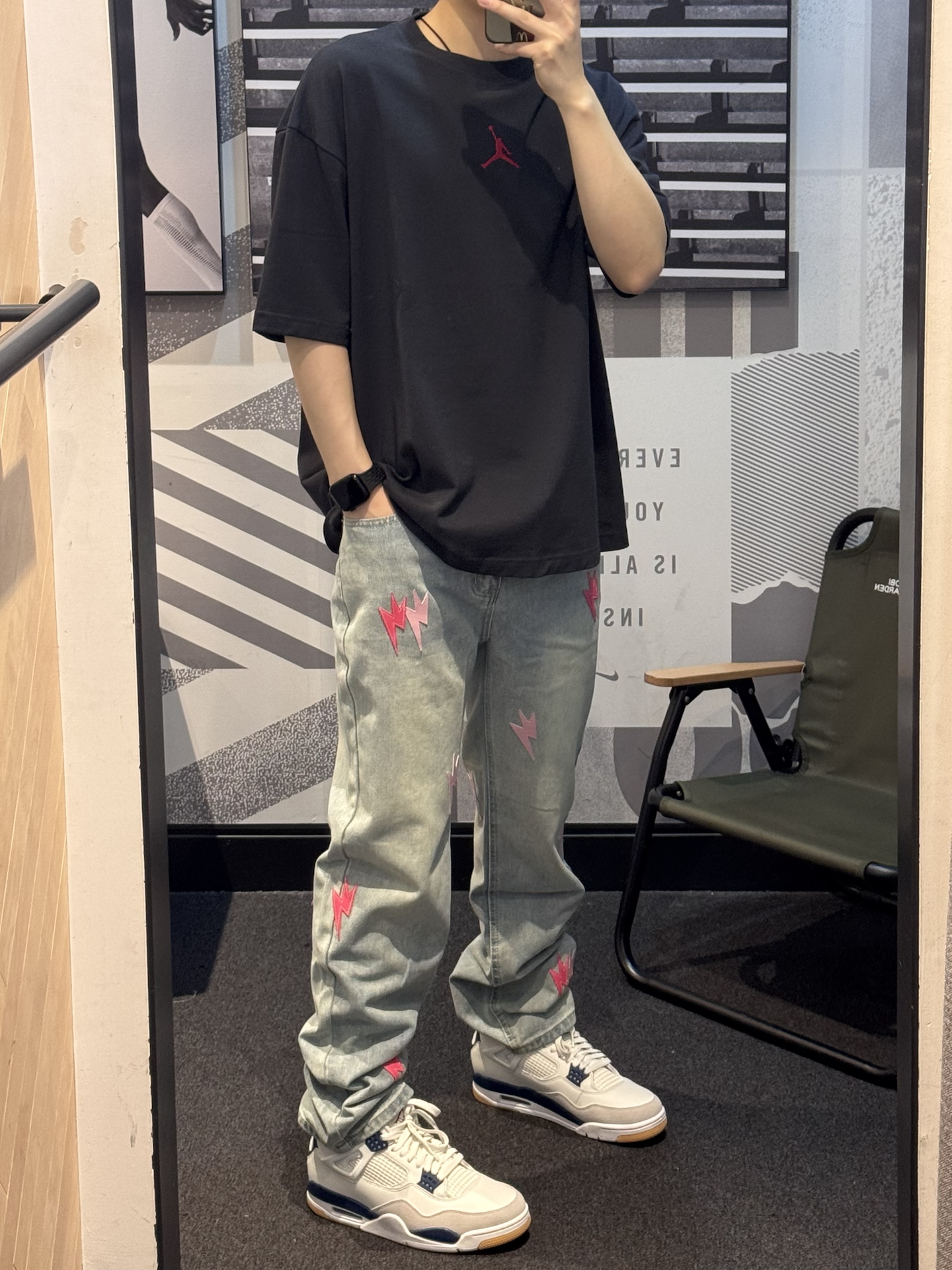 谁懂这条牛仔裤的含金量啊😭 今天的帅气就是ta给的❗️❗️ 新款闪电⚡️标换成了粉色搭配红色 好抢眼👀 直筒版型 不挑腿型贼拉显瘦💢 今天搭配的是同色logo的T恤➕aj4 细节一整个拿捏住了! 约会女友都讲我越来约会穿了[耍帅_blue] #我真的超会穿 #我的态度穿身上 #一条神裤的无限可能 #给裤子做点减法 #春夏时髦运动风