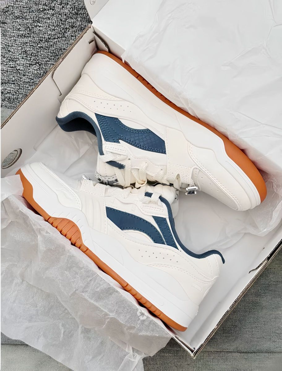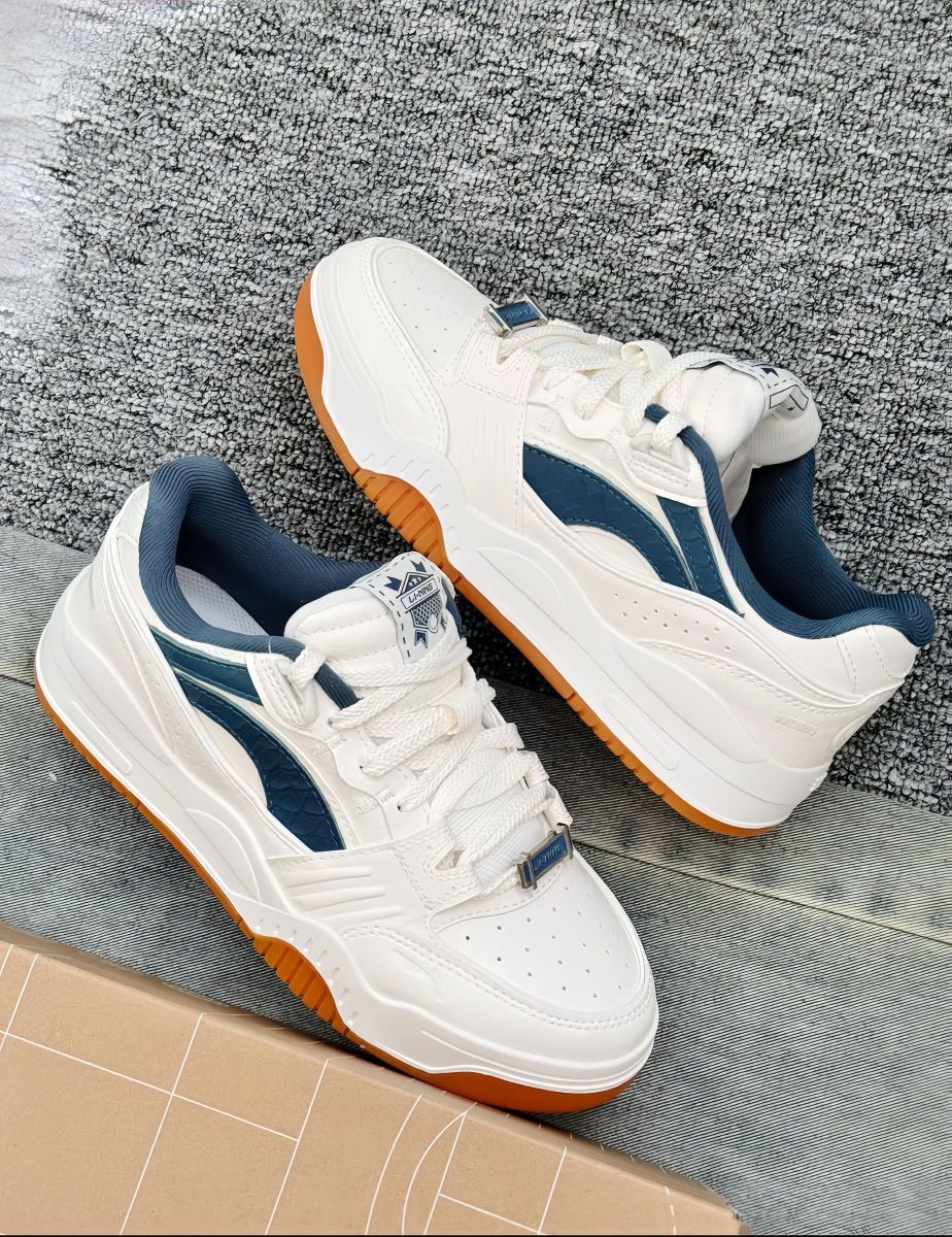 👟外观设计,经典白色鞋面搭配深邃藏蓝线条,简约又不失时尚感,复古韵味拉满。鞋型流畅利落,线条勾勒精致,怎么搭配都很出彩。都能轻松拿捏,出街回头率爆表! 🛠️材质也超赞!鞋面采用优质皮革,质感满满,耐磨又耐脏,日常打理超轻松。鞋带部分细节满满,金属扣件不仅提升了整体精致度,还增强了实用性,系紧后稳固不松动。 🧦鞋口内里柔软亲肤,贴合脚踝,走路跑步都舒适自在,完全不会磨脚。鞋底是橡胶材质,棕色...