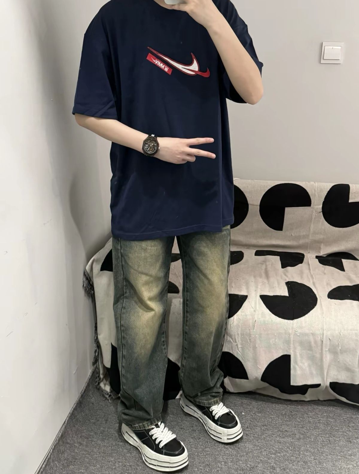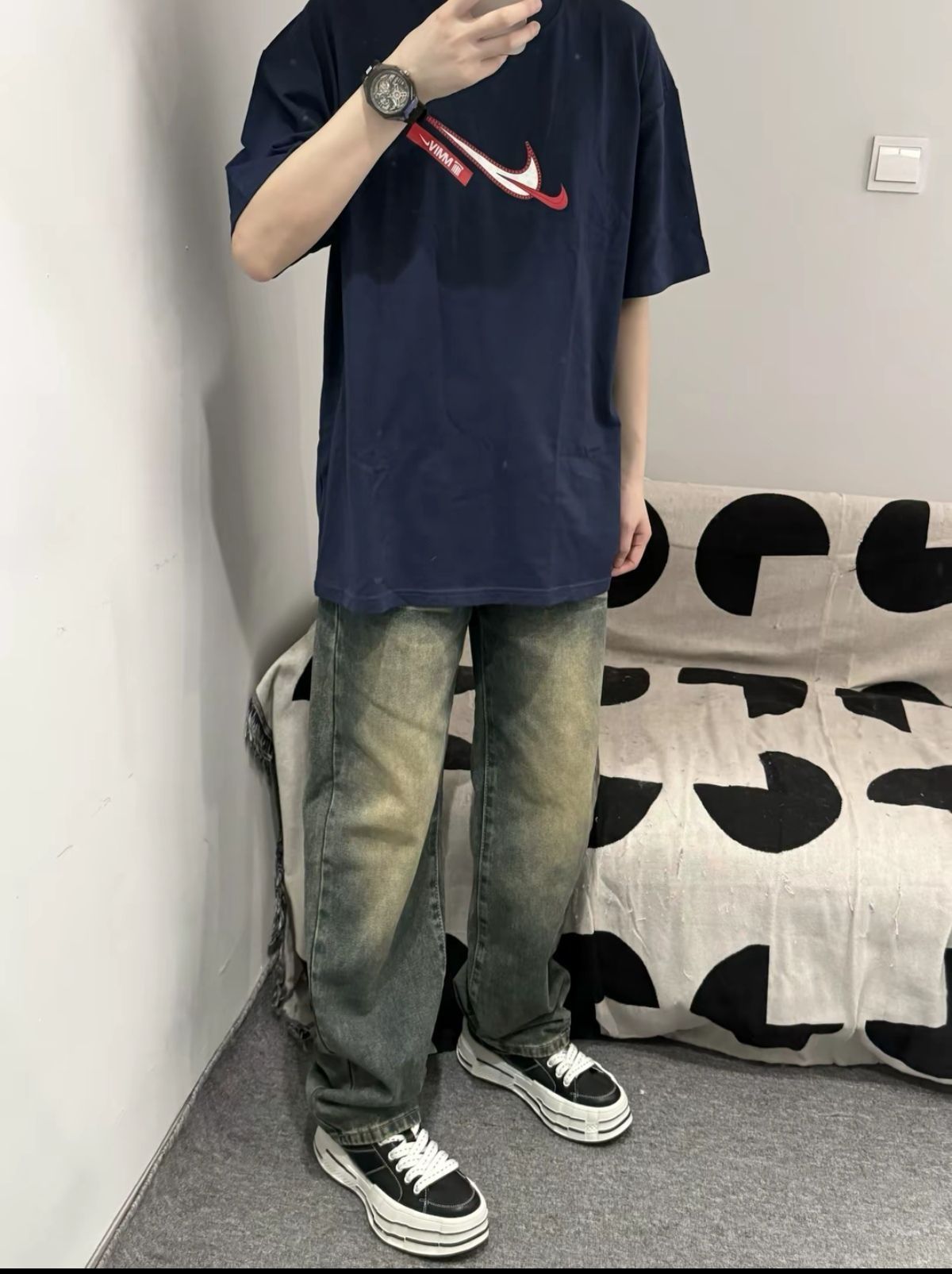 在日常通勤时候就可以这么去搭配 一件经典的Nike短袖深蓝色真的很是百搭的 再来搭配一件做旧复古感满满的牛仔裤 它的裤型也是很修身宽松直筒板的 这一身穿搭不管在什么时候 穿着都是很帅的 怎么搭配都是轻松驾驭各种风格的😊😊😊