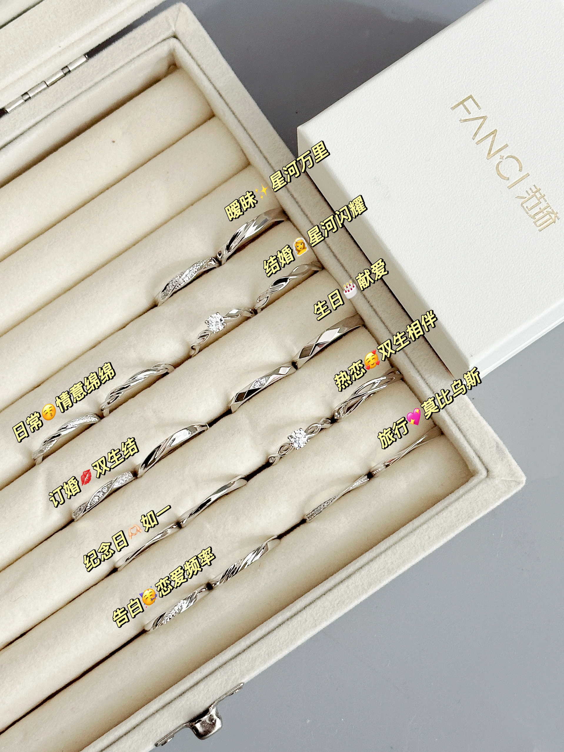 介么亮晶晶的情侣对戒我尊滴会心动 每一对的款式都好甜蜜啊 女戒是blingbling的闪闪发光 男戒是简约大气的风格 我们日常佩戴也适合 不浮夸哦 都是纯银的质感挺百搭的 我都有点纠结520和男友戴哪对约会了~