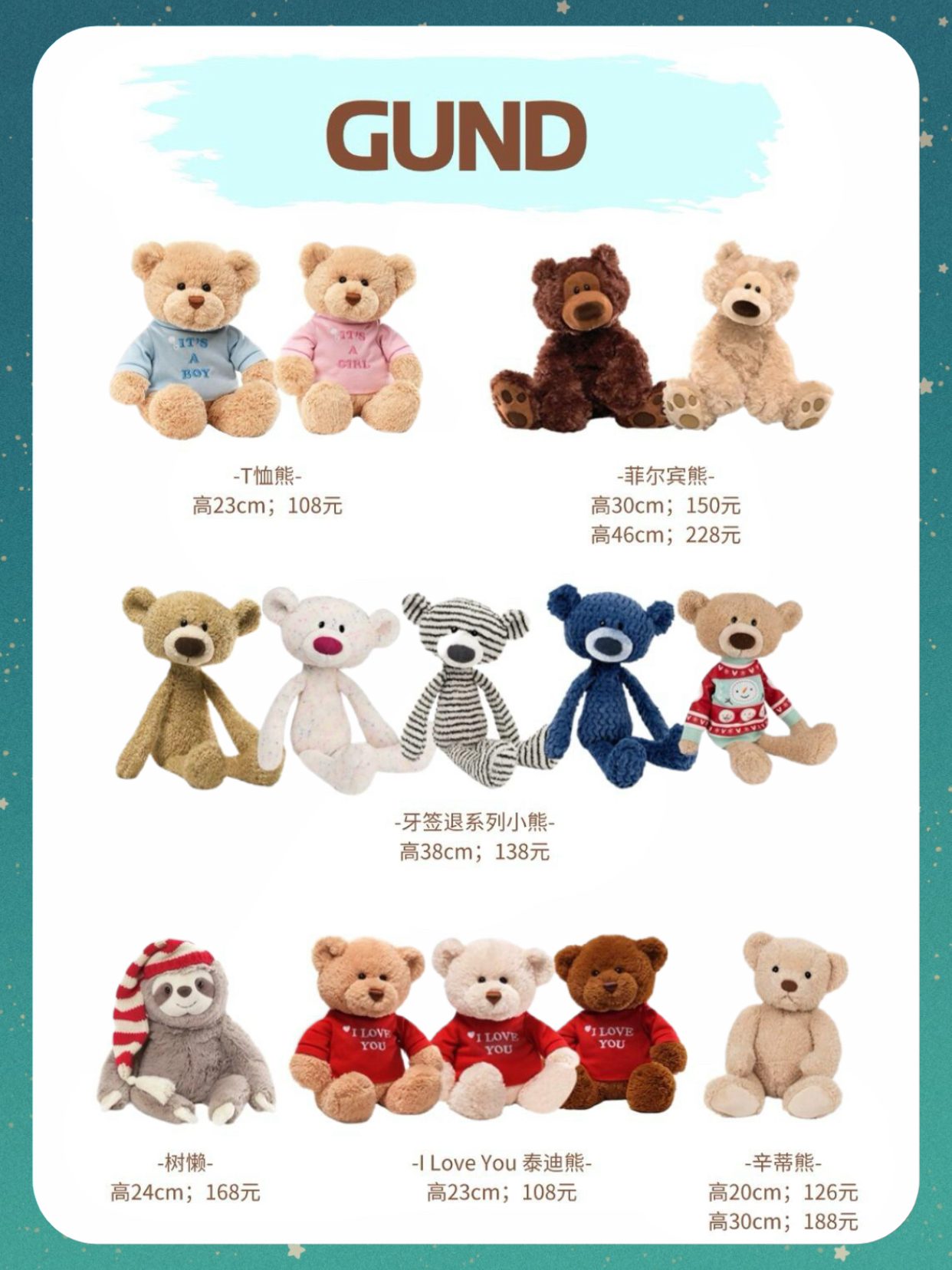 本篇笔记关联了Gund 动物系列 T恤熊 毛绒玩具 蓝色、Gund 动物系列 牙签腿 小熊 毛绒玩具 条纹、Gund 动物系列 牙签腿 小熊 毛绒玩具 五彩糖果等商品,为用户提供真实的使用体验和购买参考。