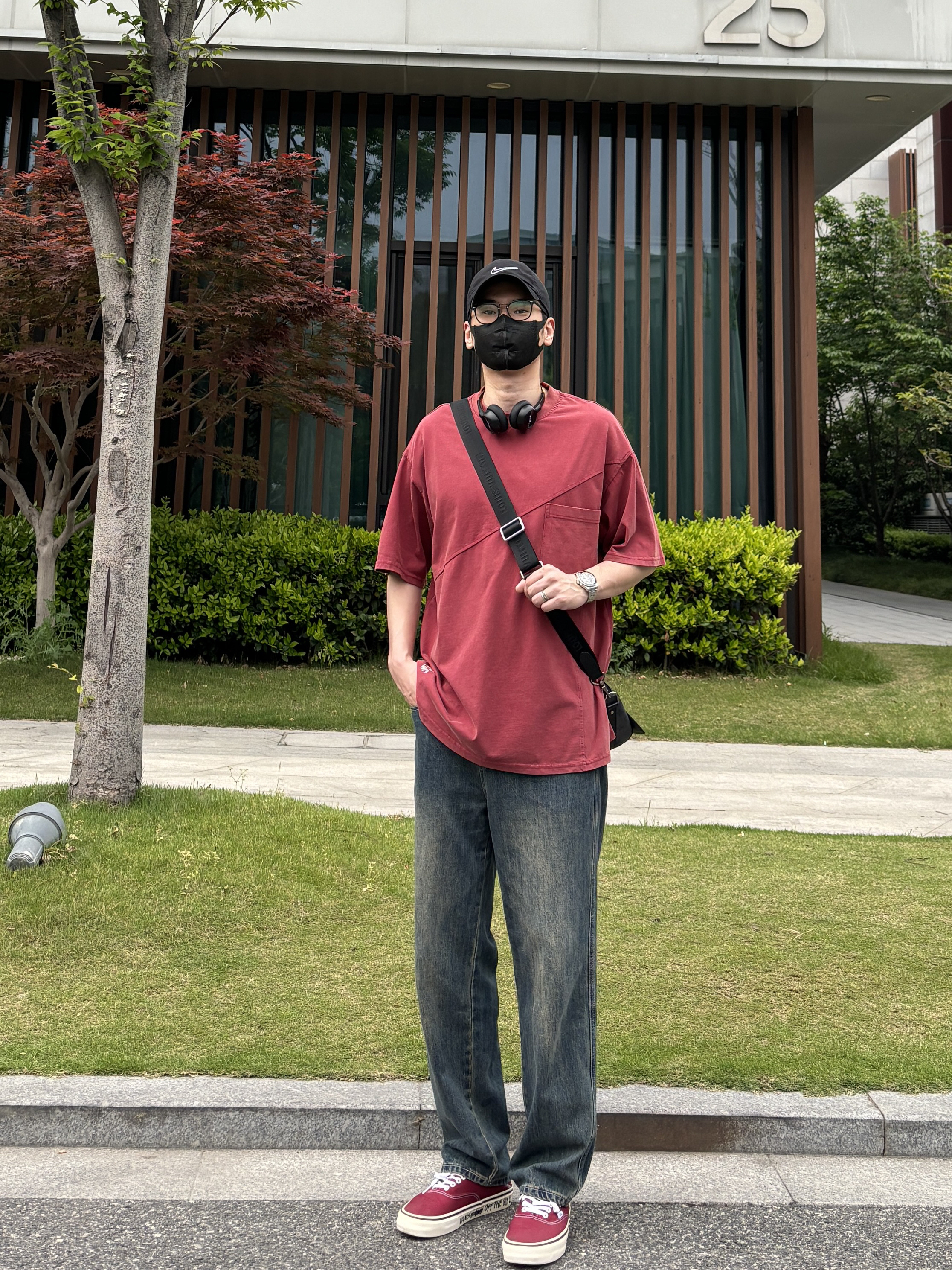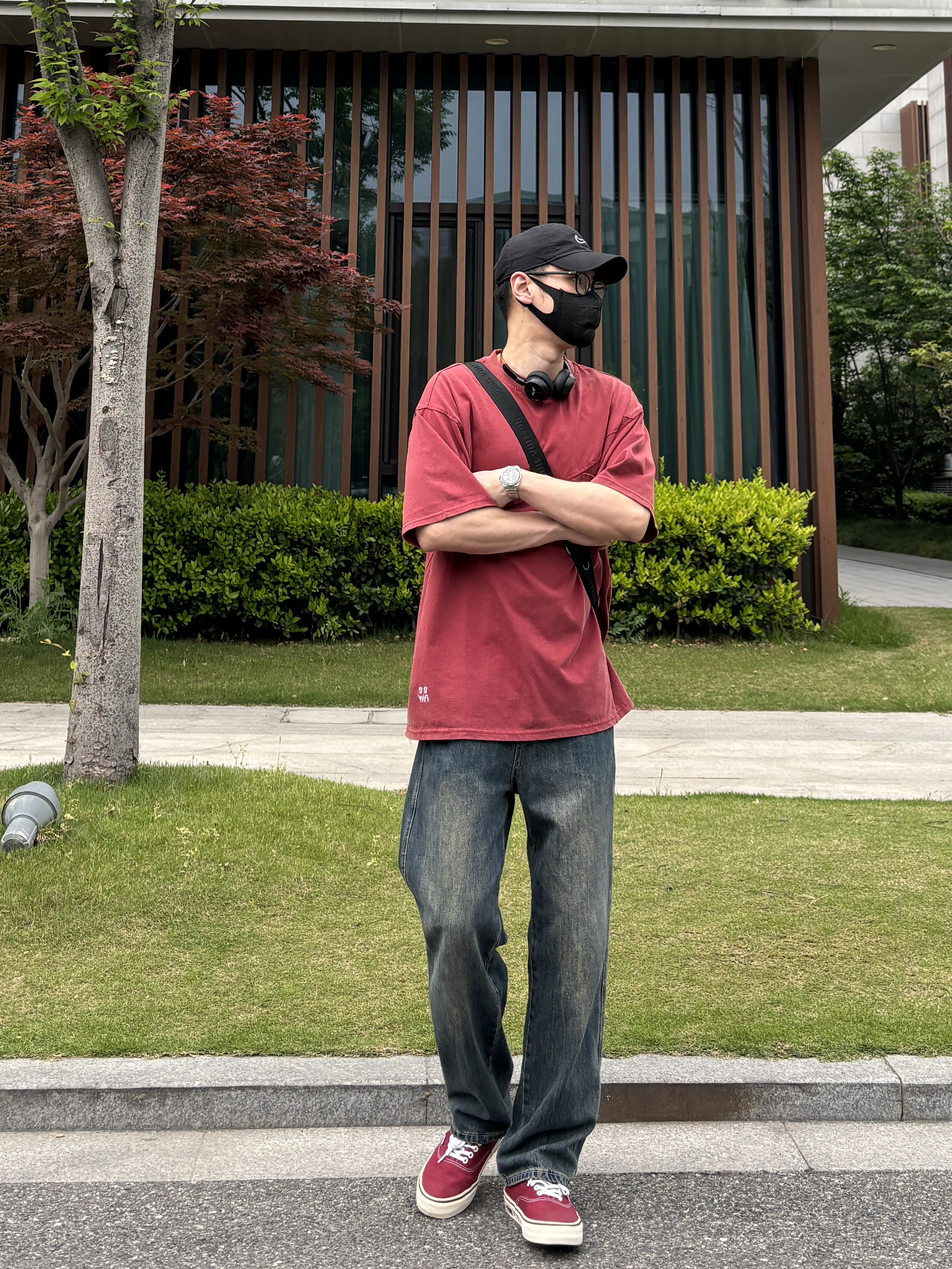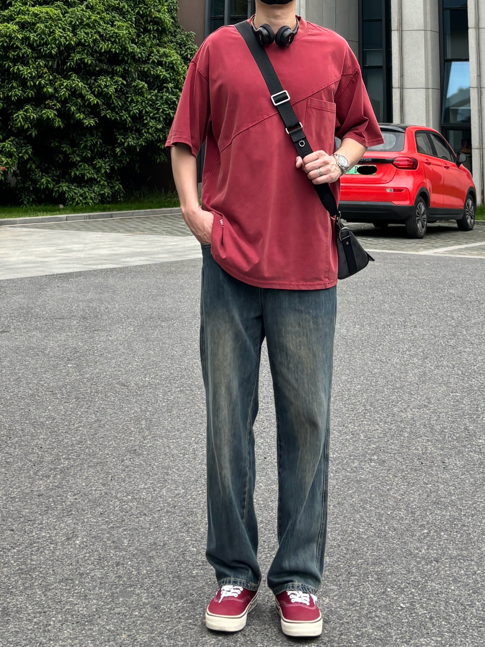 今天这套上衣穿了一件亮眼吸睛的红色宽松重磅不规则分割大口袋圆领T恤 ⬇️ 裤子选择不挑腿型的蓝色直筒水洗复古牛仔裤 ⬇️ 鞋子上脚街头味十足的酒红色涂鸦低帮板鞋呼应下衣服的颜色 ⬇️ 最后戴一副氛围感满满的蓝牙耳机 - 今日搭配 衣服裤子:NICE LILI 鞋子:vans红校车