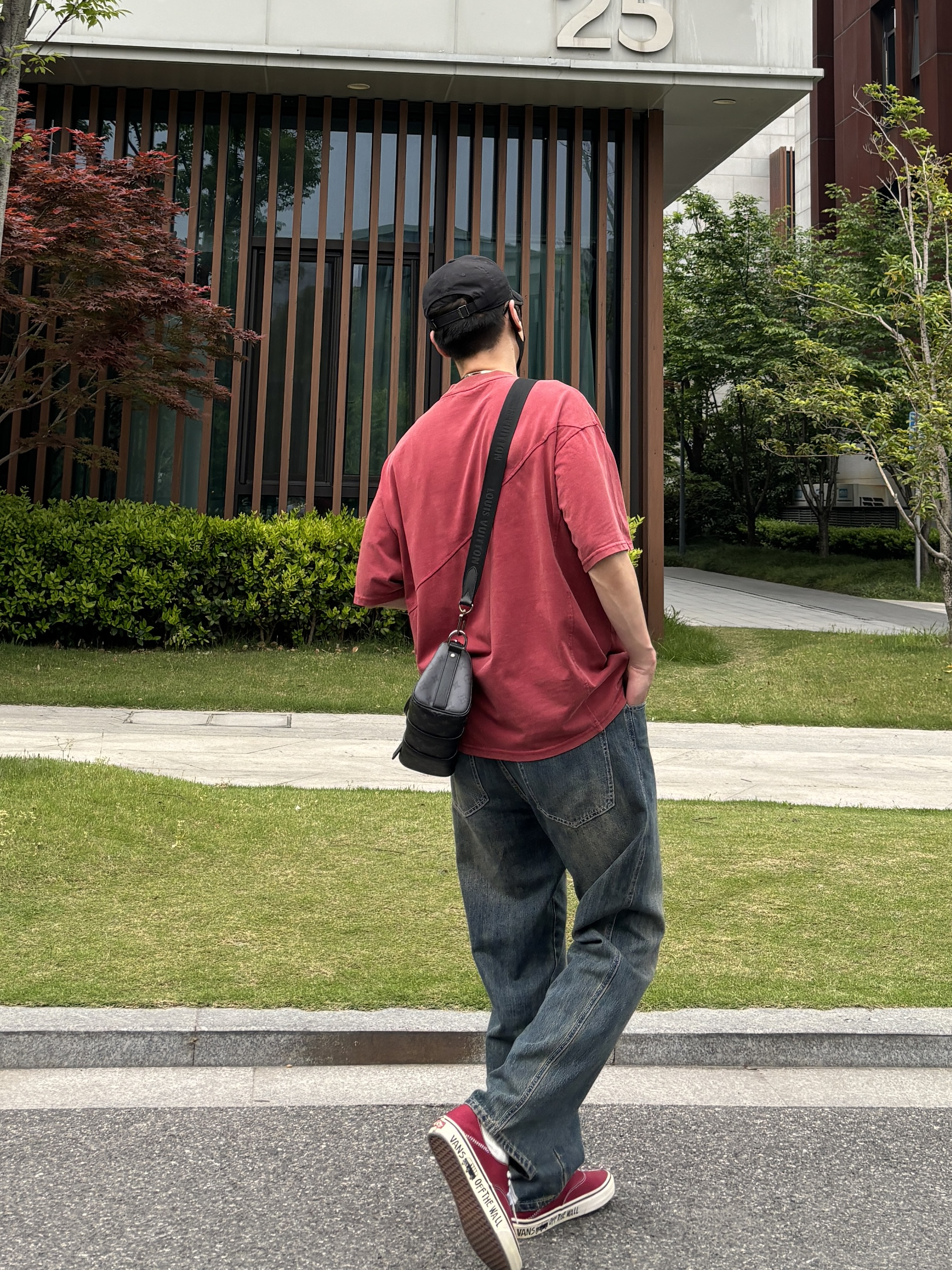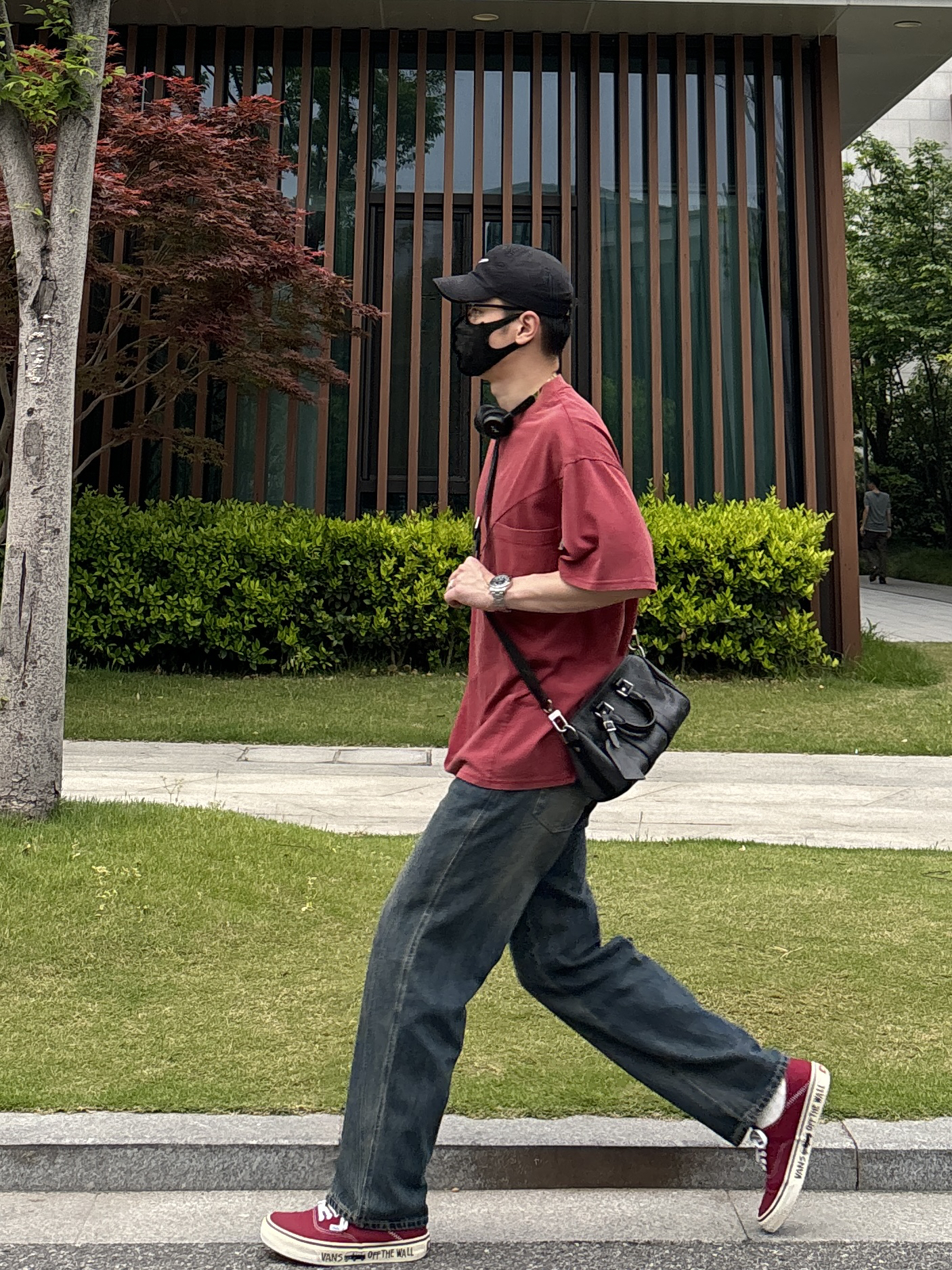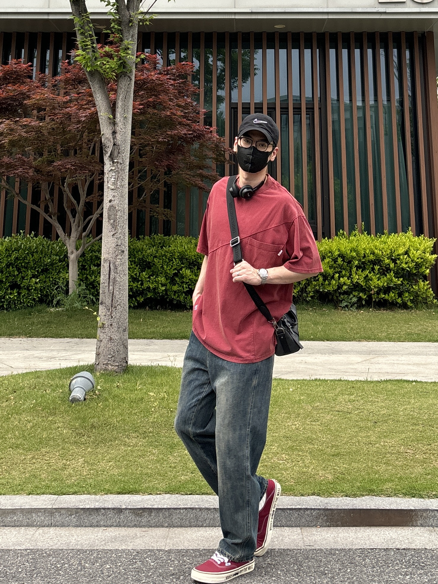 今天这套上衣穿了一件亮眼吸睛的红色宽松重磅不规则分割大口袋圆领T恤 ⬇️ 裤子选择不挑腿型的蓝色直筒水洗复古牛仔裤 ⬇️ 鞋子上脚街头味十足的酒红色涂鸦低帮板鞋呼应下衣服的颜色 ⬇️ 最后戴一副氛围感满满的蓝牙耳机 - 今日搭配 衣服裤子:NICE LILI 鞋子:vans红校车