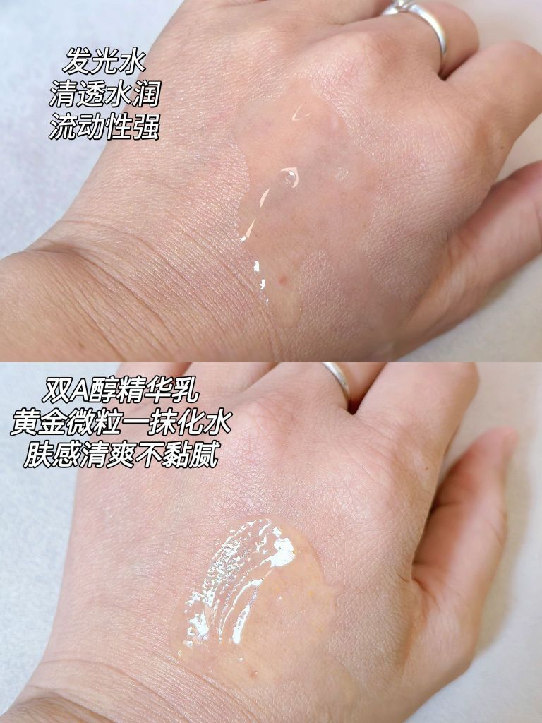 今天来分享一下如何正确使用早C晚A,让肌肤焕发光彩✨。 首先,早上一定要用发光水2.0,让你肤色瞬间提亮🌞。轻拍或湿敷都是极好的选择,质地轻盈,吸收超快,不粘腻!💦 内含丰富的焕亮成分,真正为你的皮肤带来改变!我每天坚持湿敷,皮肤光滑细腻更上一层楼!👏 晚上,同样不能少了发光水2.0,之后记得叠加双A醇精华乳2.0,针对细纹和初老问题,两者结合效果拔群!🌙 细腻的淡黄色质地推开即融,油...