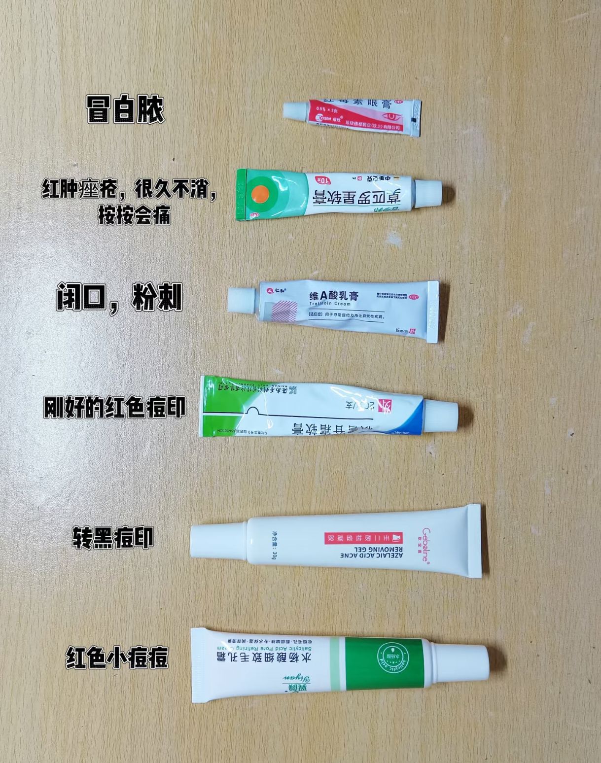 各类痘痘对应药膏📍 以上分别是: ①红霉素眼膏(个人感觉会比红霉素软膏刺激小一点) ②莫匹罗星软膏 ③维A酸乳膏 ④积雪苷霜软膏 ⑤壬二酸祛痘凝胶 ⑥水杨酸细致毛孔霜 —————————————————— 根据我三年以来战“痘”经验总结的心血,可能有些不准确或不专业,不过都是在我自己脸上试出来的结果(我是干性敏感肌),以下是需要提醒的地方: ●维A乳膏:刺激性较强,连续用可能导致脱皮 ●积雪苷霜软...
