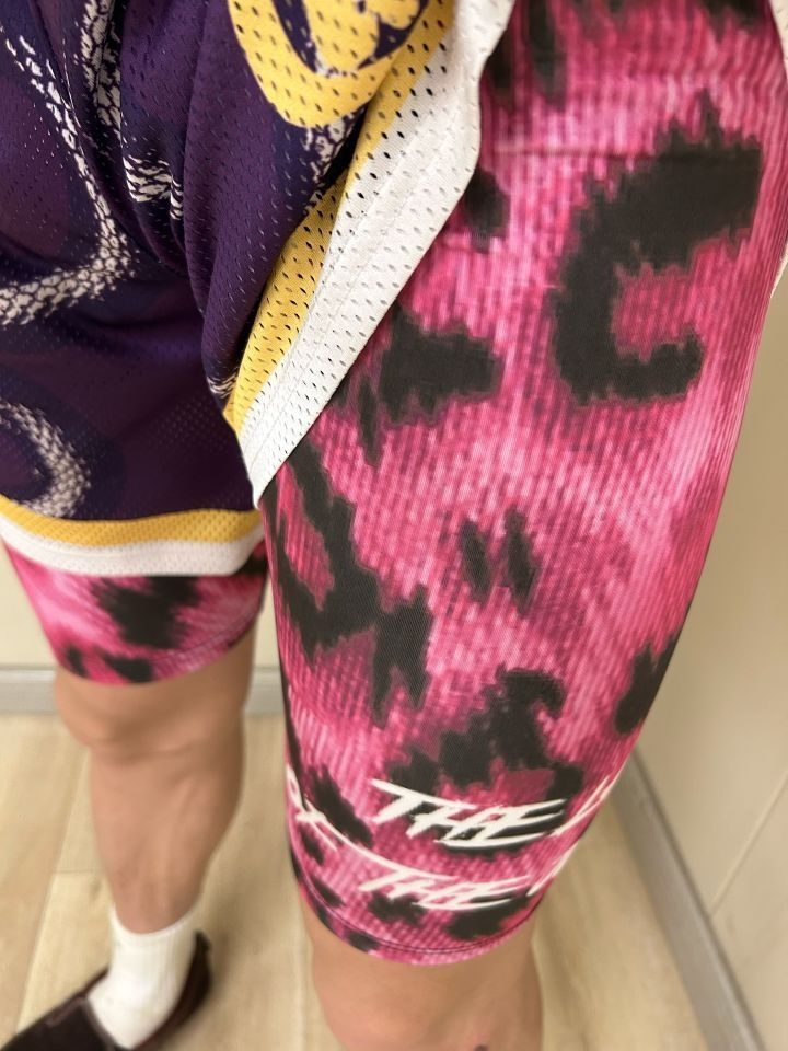 紧身裤: 准者 RIGORER 🧍🏻:186|78 XL码 今天上身的准者家的粉红豹五分紧身裤💗 谁能想到现在的紧身裤都能这么炫酷了了,没有人可以拒绝猛男粉加豹纹的组合😍 在球场上打球时穿上它,漏出一点点粉色的豹纹图案,这不妥妥的球场焦点嘛,并且还有buff加成🐆 紧身裤的面料特别亲肤舒适,弹力特别不错,不容易松垮,日常打球吸汗透气效果也非常的好,就冲这颜值值得推荐👍