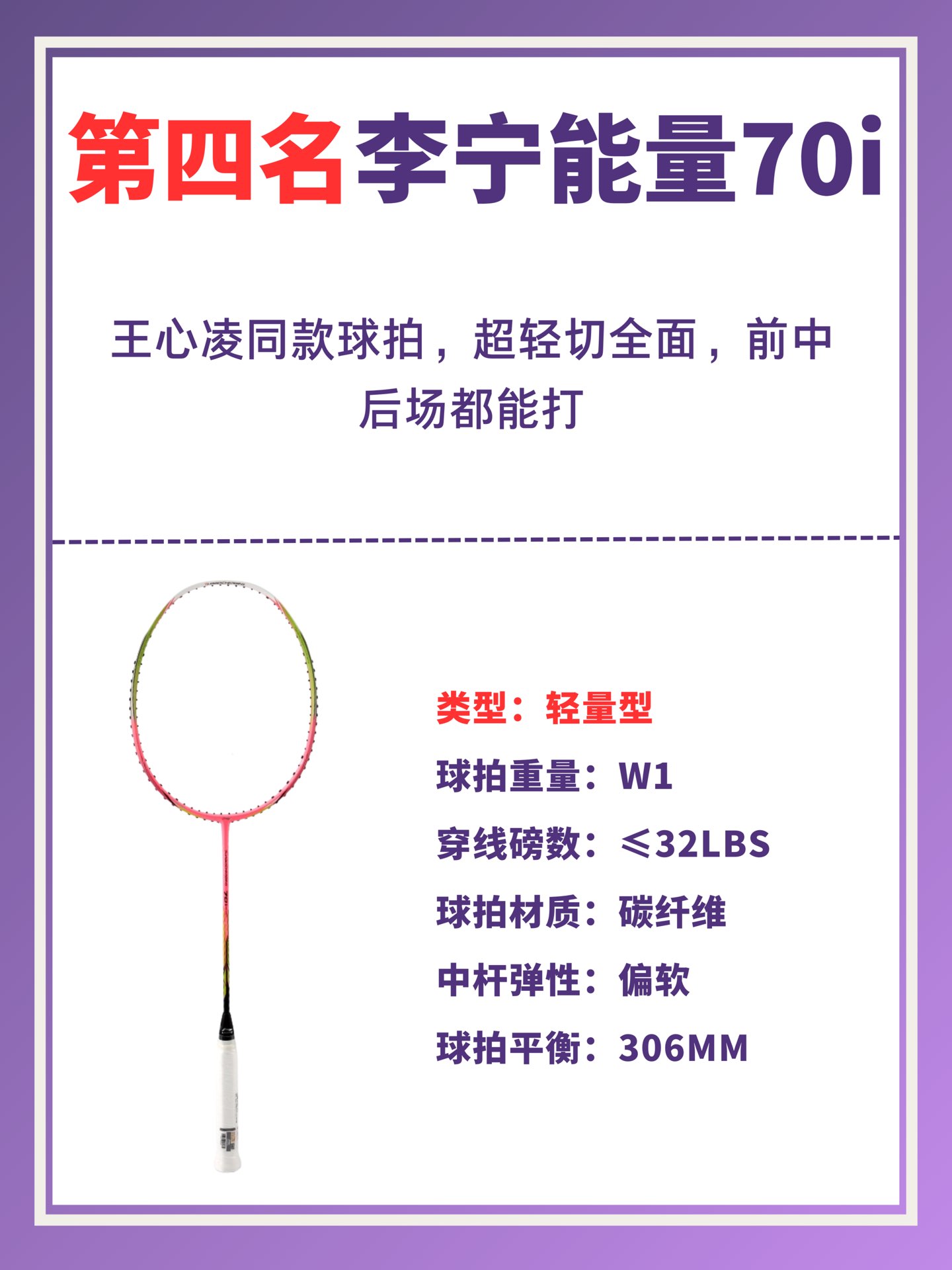 本篇笔记关联了Li Ning/李宁 能量系列 能量70I 全碳素 均衡型 耐打 专业级 羽毛球拍 白金、Li Ning/李宁 风动系列 风动9000I 控制型 速度型 专业级 高弹性 稳定操控 攻守兼备 增加挥速 全碳素 羽毛球拍 黑金、Li Ning/李宁 风暴系列 WS72 超轻系列 进攻专用 速度型 进阶级 全碳素 高弹性 灵活耐打 羽毛球拍 蓝橙等商品,为用户提供真实的使用体验和购买参考。