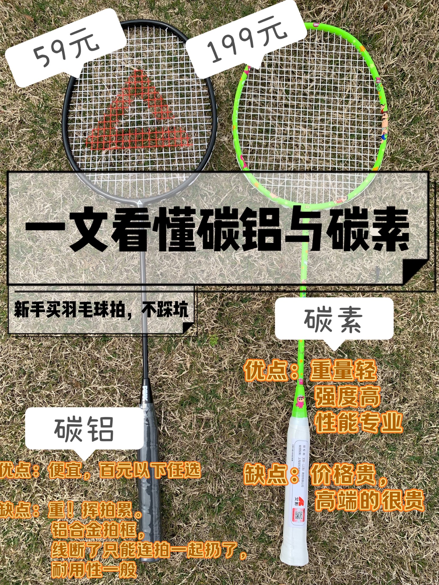 这篇就可以简单读懂羽毛球拍里的碳铝和碳素的区别,羽毛球拍新手必看~ 碳铝:材质便宜,售价也大多便宜,一般在几十元的价位,多为双拍装,超过百元就不要考虑了。耐用性一般,重量较重,适合偶尔玩玩。 碳素:全碳纤维,价格贵,多为单拍装。重量轻,强度高,性能专业,羽毛球入门的和专业级选手都在使用。低于百元的就要辨别下真假了。 #全碳素#羽毛球拍推荐