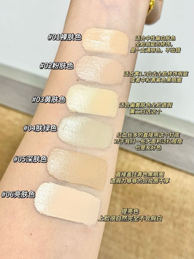 从黄一白到黑黄皮,从黑眼圈到红血丝… 这几支全包揽!!!像瑕疵严重、眼下卡到干纹的奇葩肤质姐妹,用到这种扒得死死的又不拔干的遮瑕真的绝…… 怒!推!n遍!!!! 总共6个色号,选色号直接抄我功课👇 01裸肤色 适合中性偏白肤色,全脸瑕疵的修饰,是一支通用色,不出错 02粉肤色 适合黄1.2白去全脸修饰瑕疵或者中和青紫色黑眼圈 03黄肤色 适合偏黄肤色全脸遮瑕,黄二白选这个 04肤绿色: 红血丝多的...