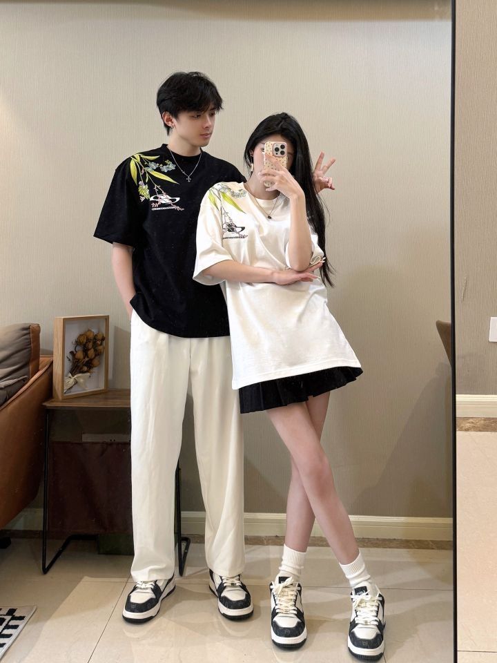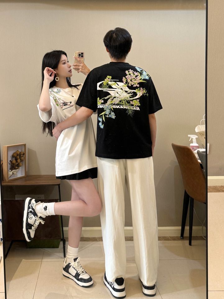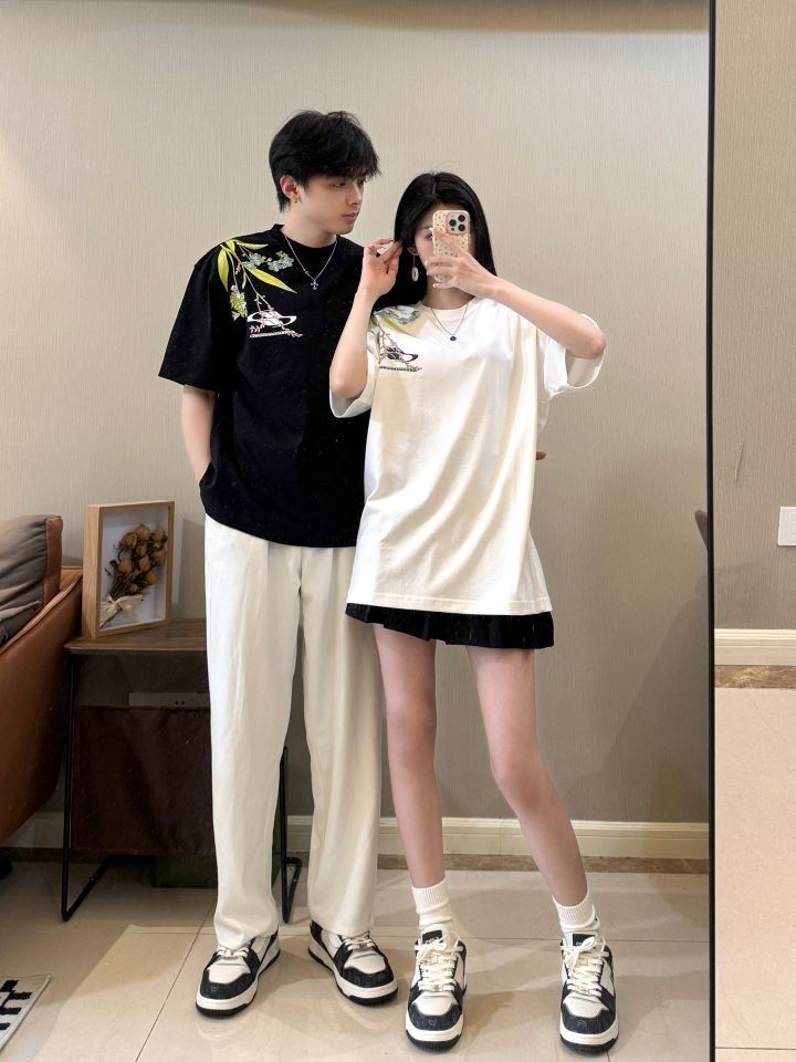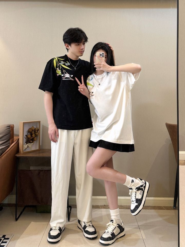 177/130 M 👧🏻166/96 S 今年新中式的好火🔥 和男朋友一起穿尊嘟不要太美了! 重磅刺绣工艺真的高级感满满 布料很舒服 夏天穿起来很清爽 百搭又休闲 帅气满满诶! 搭配一双卡宾腰果花的情侣板鞋 黑白呼应 整体层次感一下子上来惹~ (图源网络侵删)