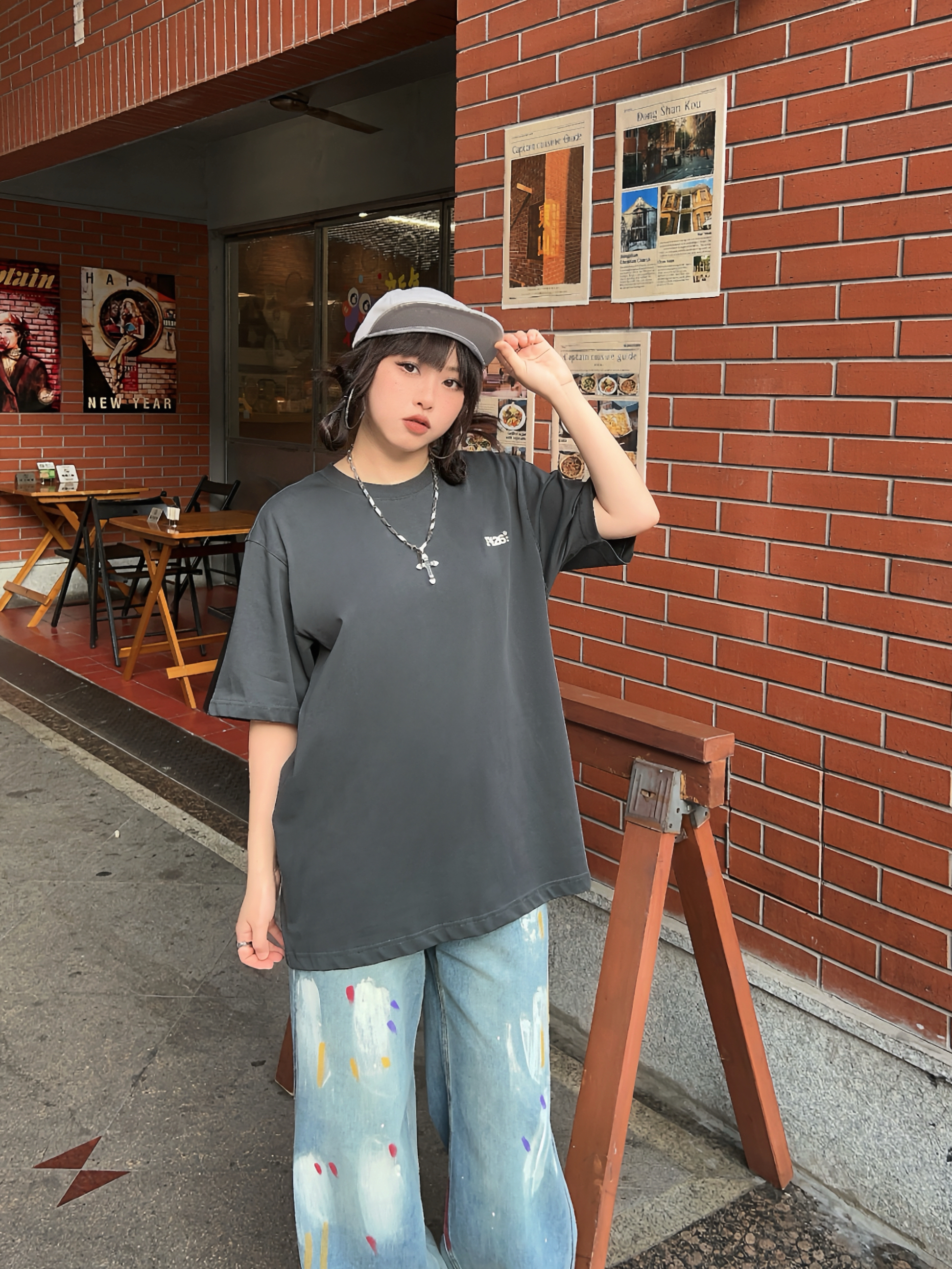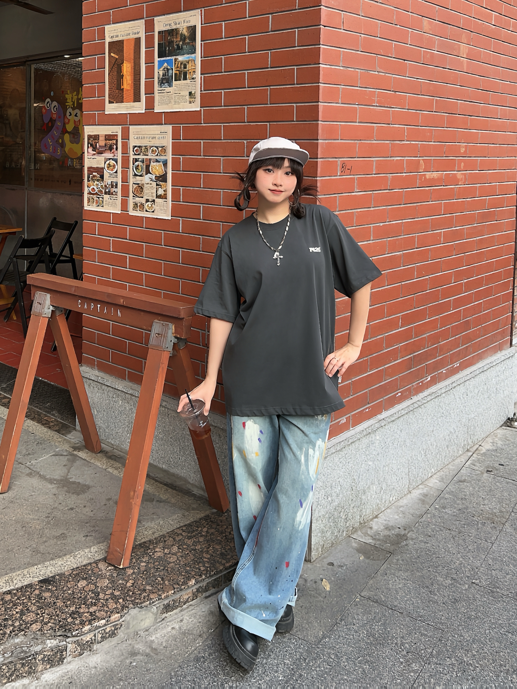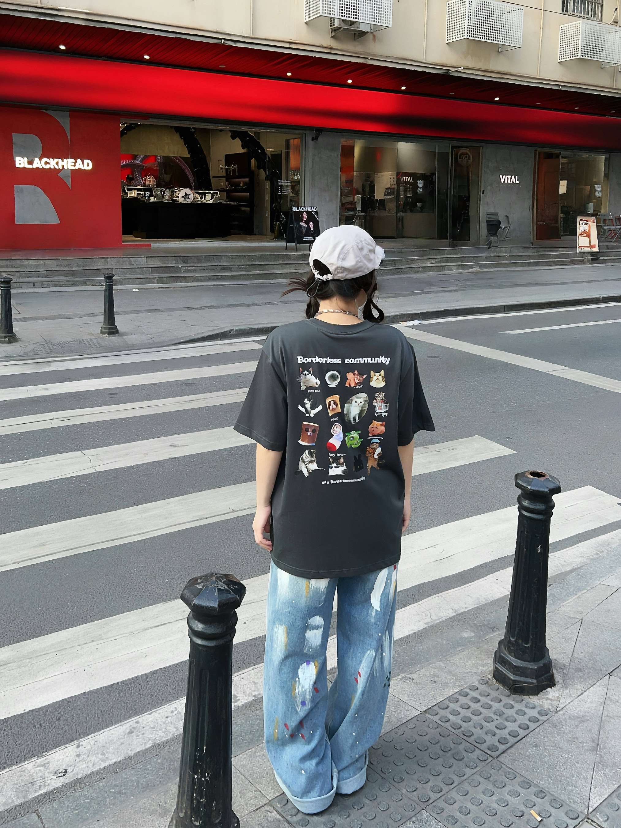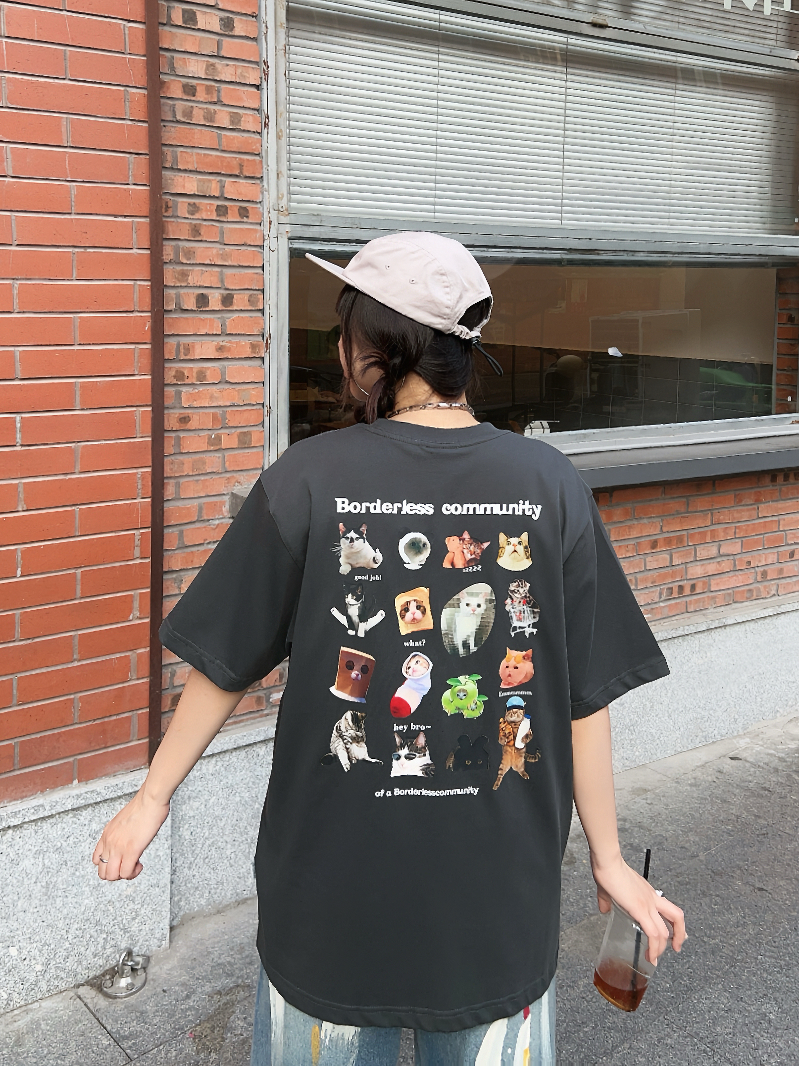 🛹158/100/M 美式街头穿搭来啦,穿帅点 🐈有点萌的夏日短袖,背后的猫猫表情包可可爱爱,上身宽松版型舒服好穿~ ☑️搭配涂鸦牛仔裤和复古棒球帽🧢,出门citywalk