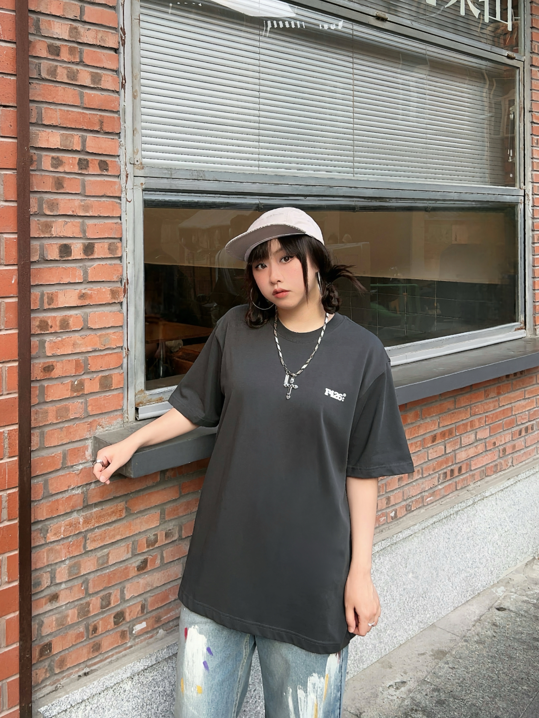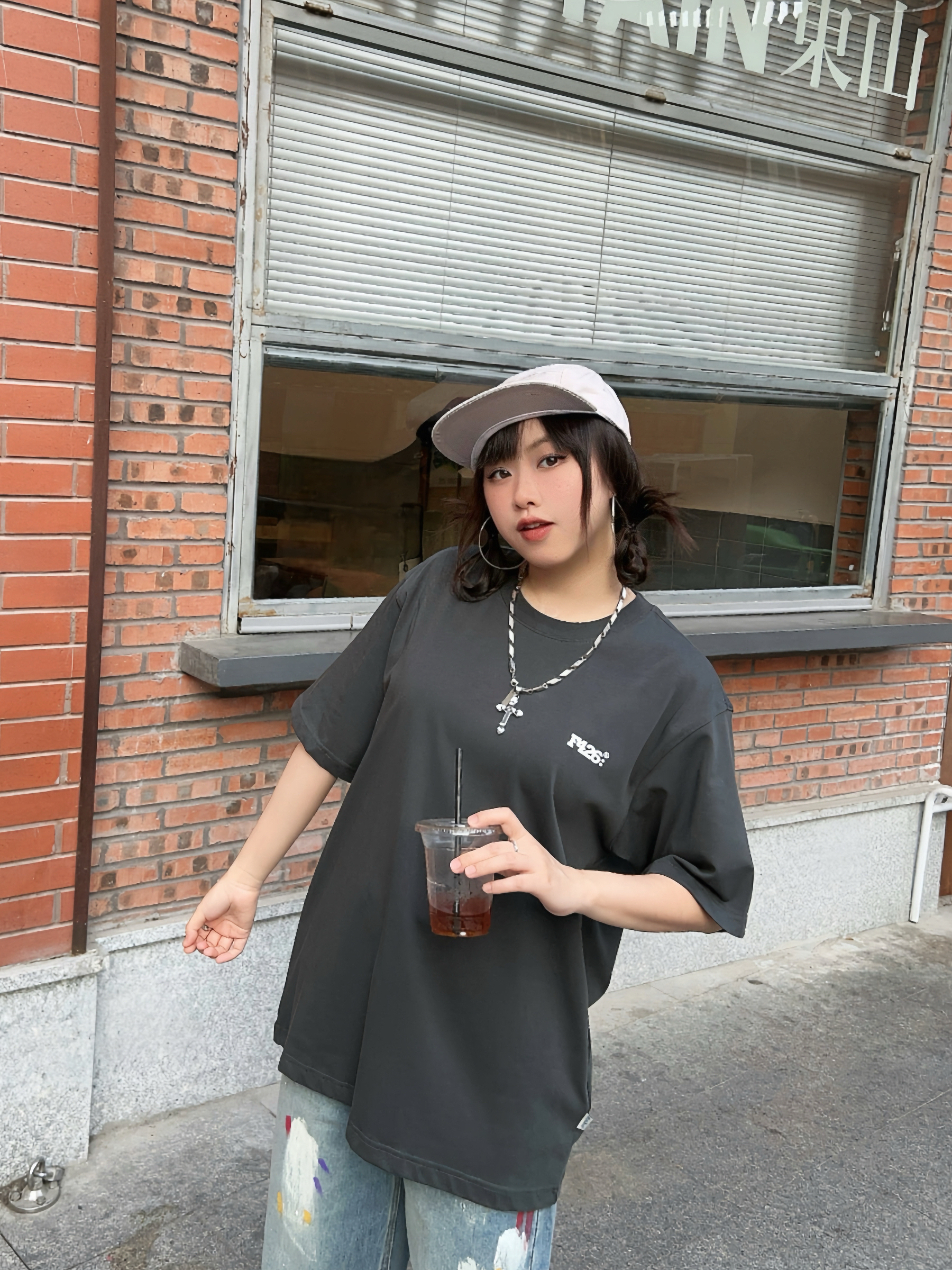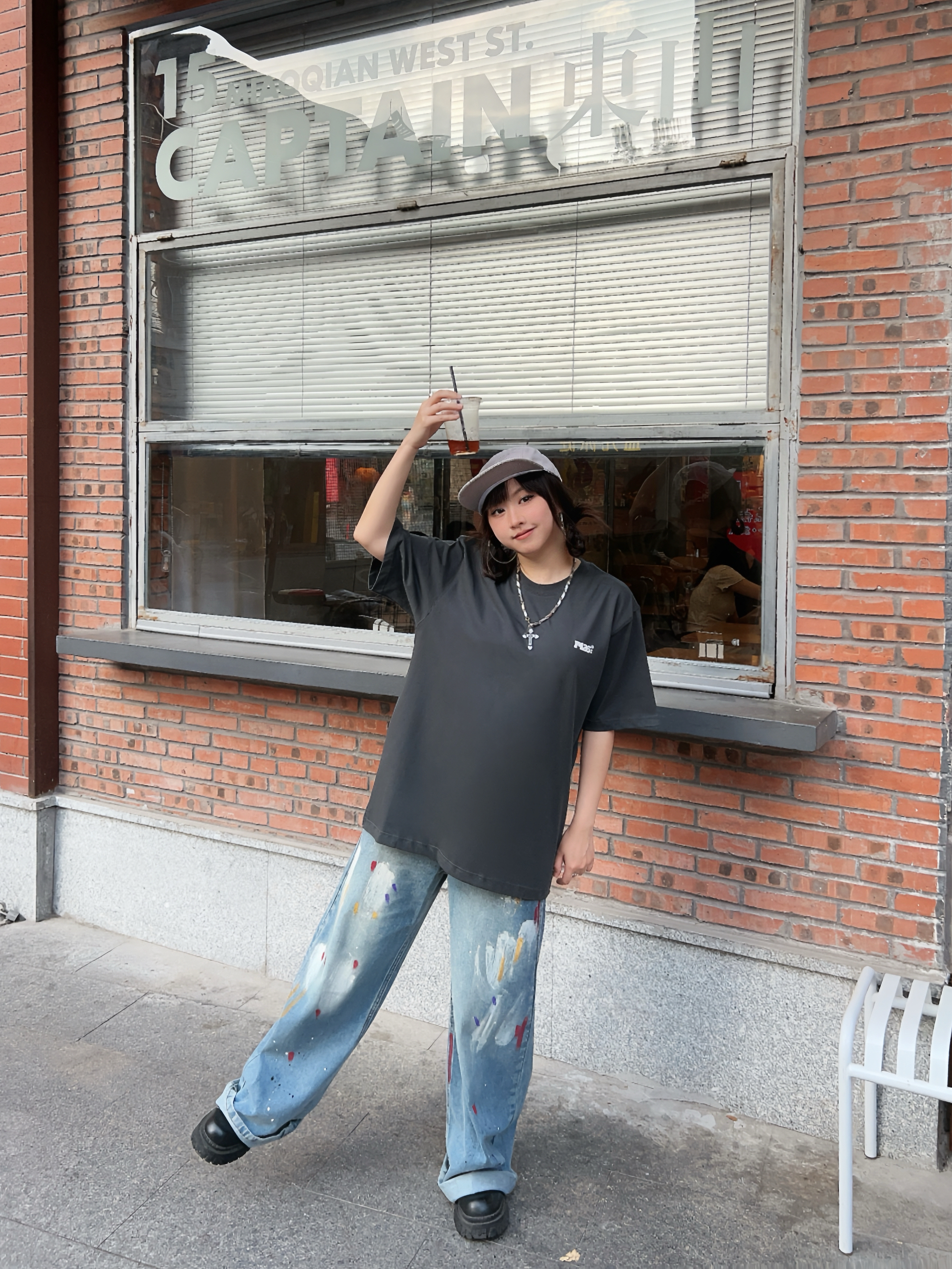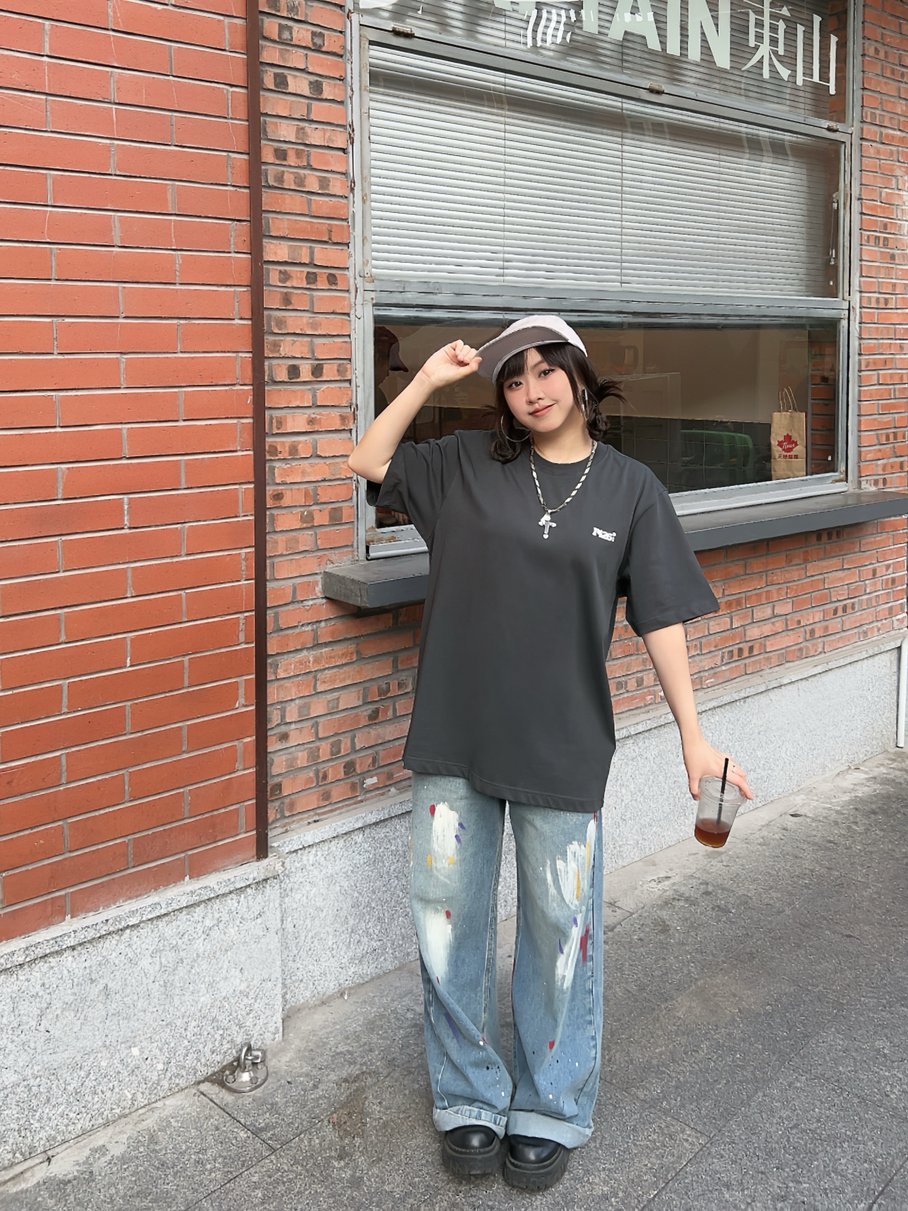 🛹158/100/M 美式街头穿搭来啦,穿帅点 🐈有点萌的夏日短袖,背后的猫猫表情包可可爱爱,上身宽松版型舒服好穿~ ☑️搭配涂鸦牛仔裤和复古棒球帽🧢,出门citywalk