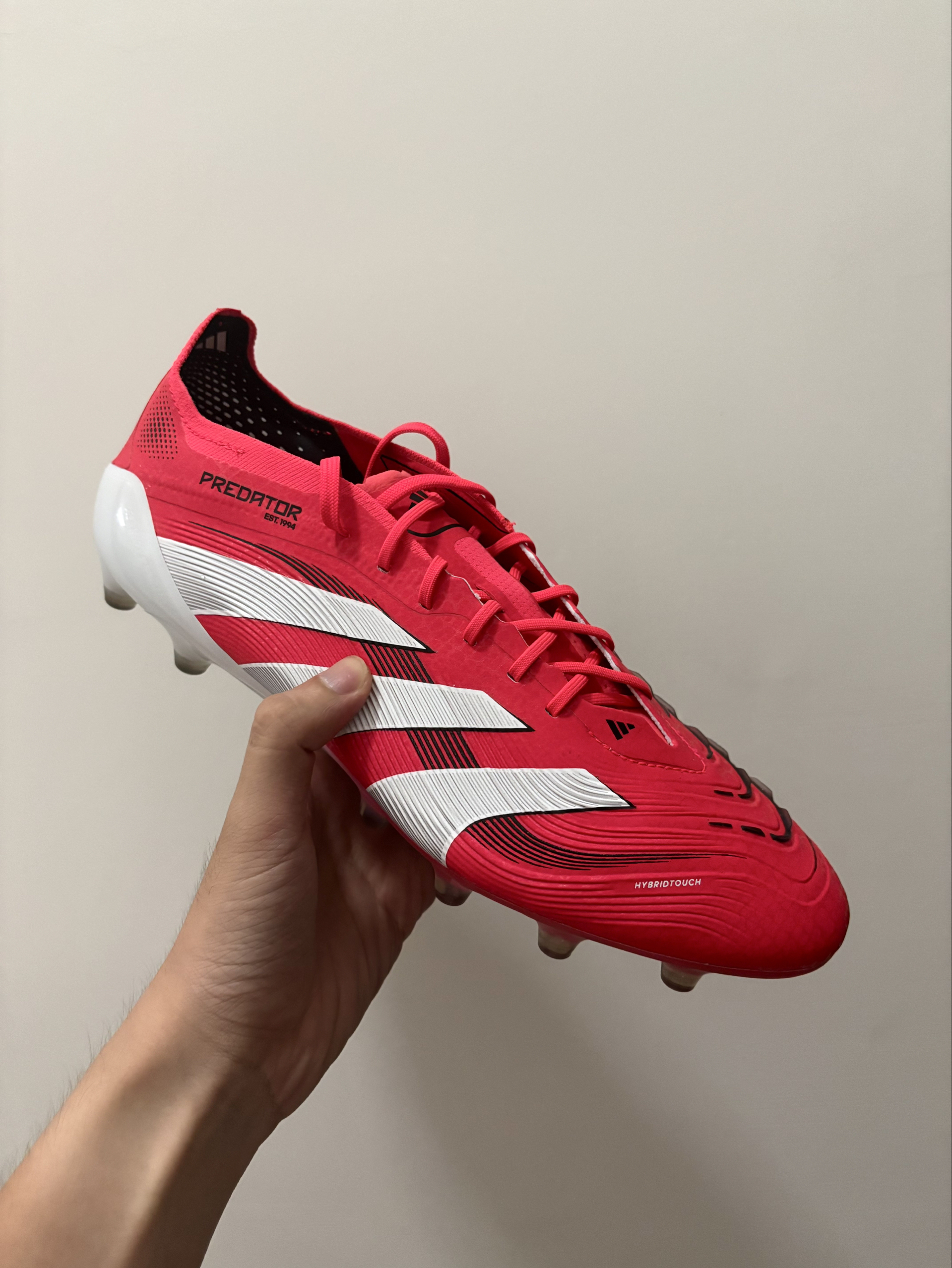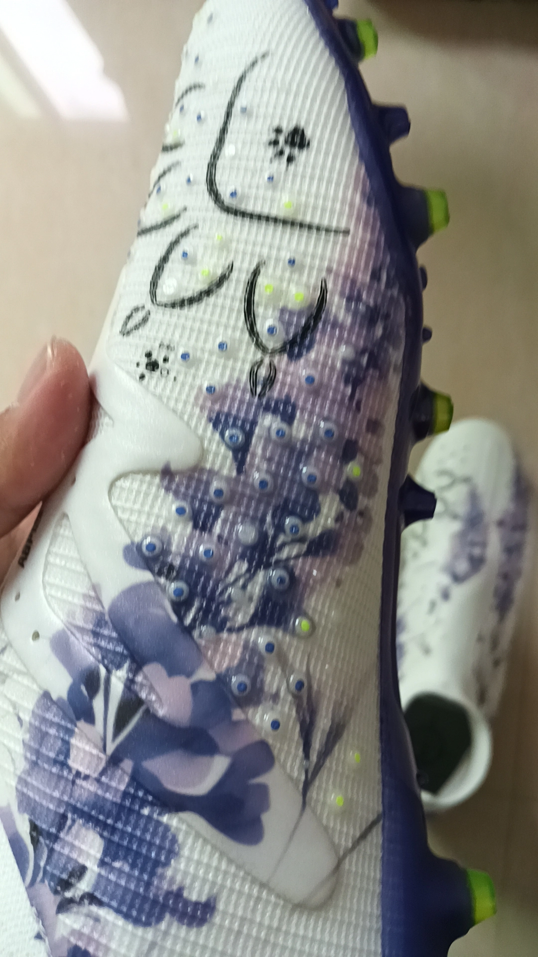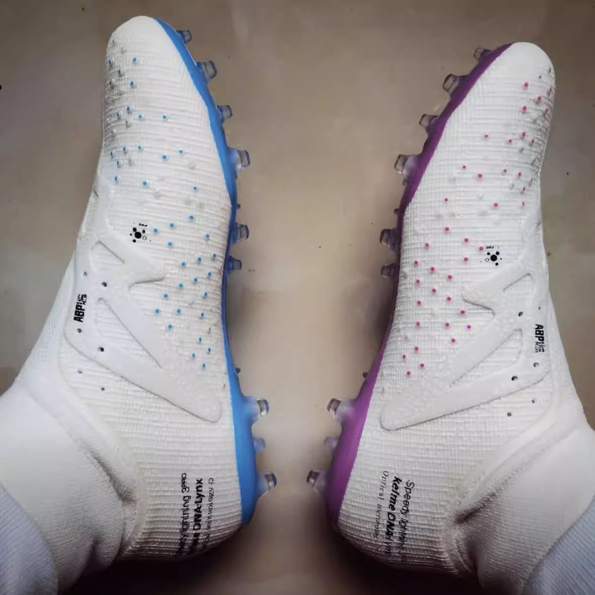 上脚确实很惊艳!鞋面材质柔软贴合,触球感相当细腻,发力也很干脆👌👌👌 ⚽⚽⚽高帮设计包裹性一流,做急停、变向动作时安全感十足。 短钉在人工草场上抓地力稳,跑动不打滑。不过鞋舌位置有点磨脚踝,新鞋磨合期得穿厚袜子,总体来说实战表现对得起价格😁😁😁