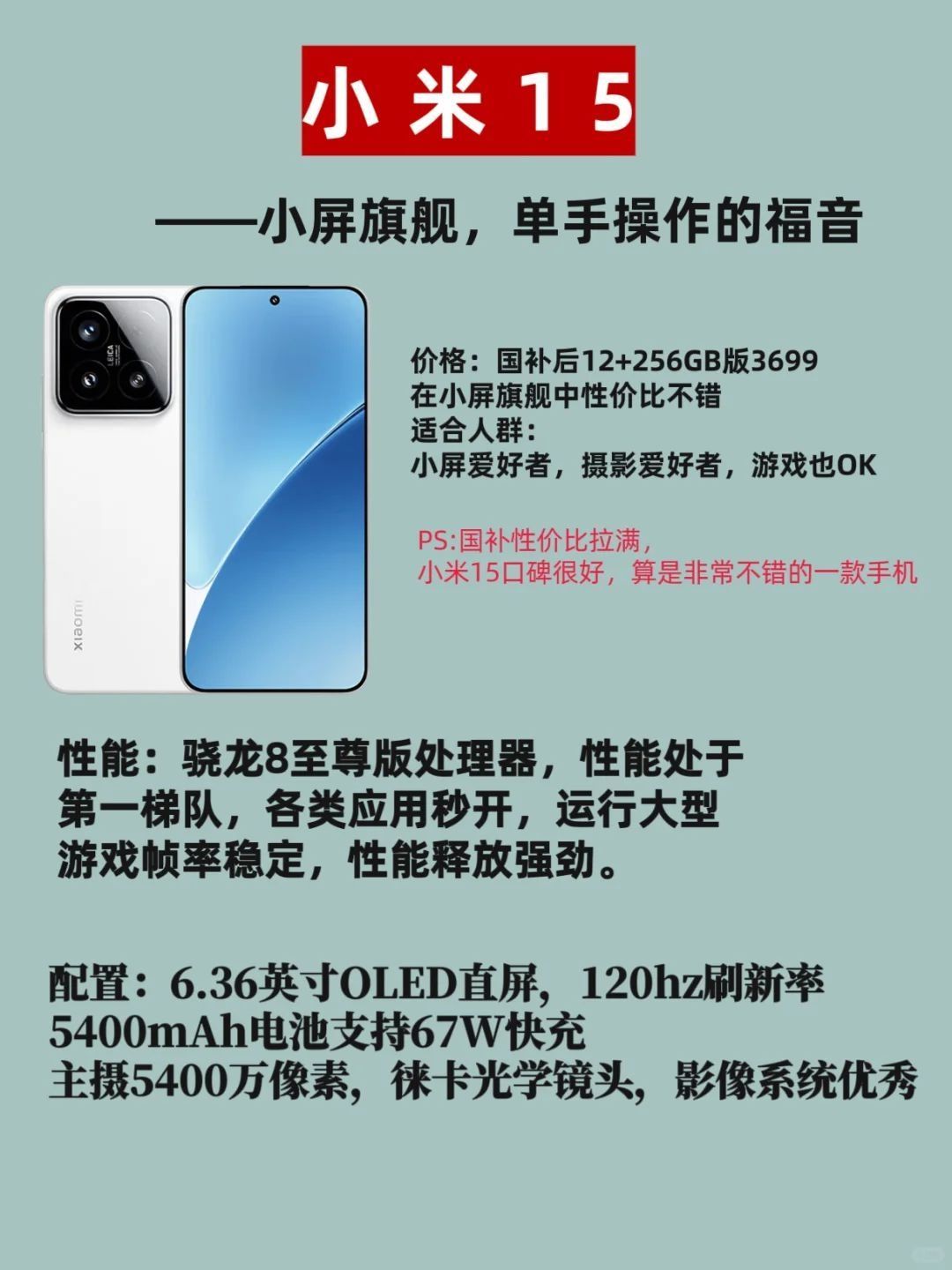 小米15——小屏旗舰之光 国补后12 + 256GB版只要3699💰 小屏爱好者的福音!一手轻松掌握~骁龙8至尊版处理器,性能超强,不管是日常应用秒开,还是大型游戏帧率都稳得一批🎮 6.36英寸OLED直屏,120Hz刷新率,视觉体验超棒。5400mAh大电池+67W快充,续航有保障。5400万像素主摄+徕卡光学镜头,摄影爱好者冲就完事儿! vivo X200 Pro Mini——轻薄影像...