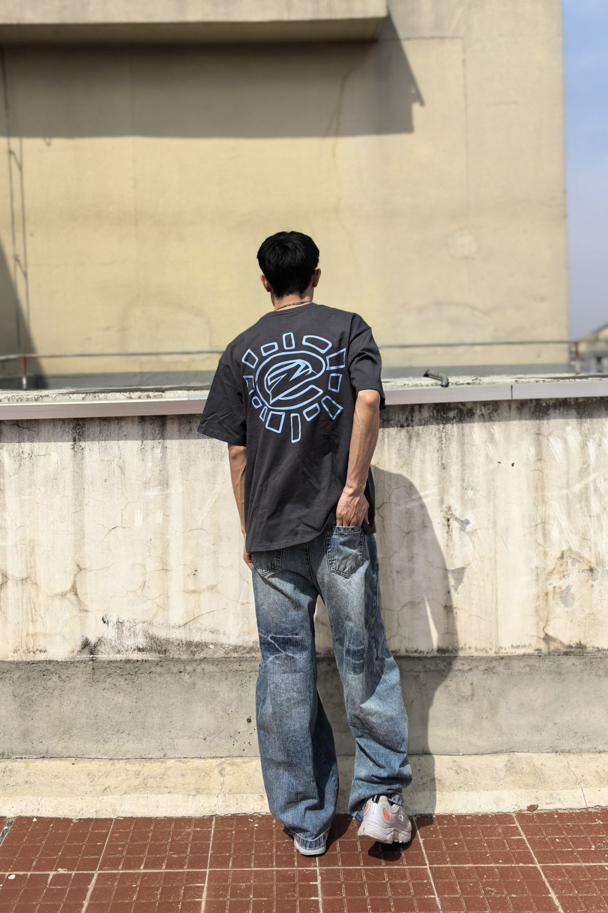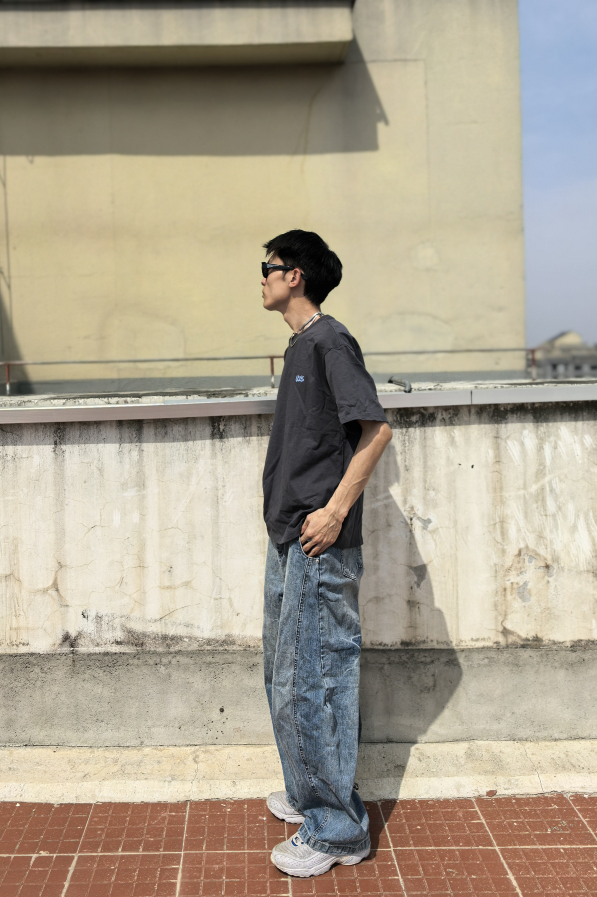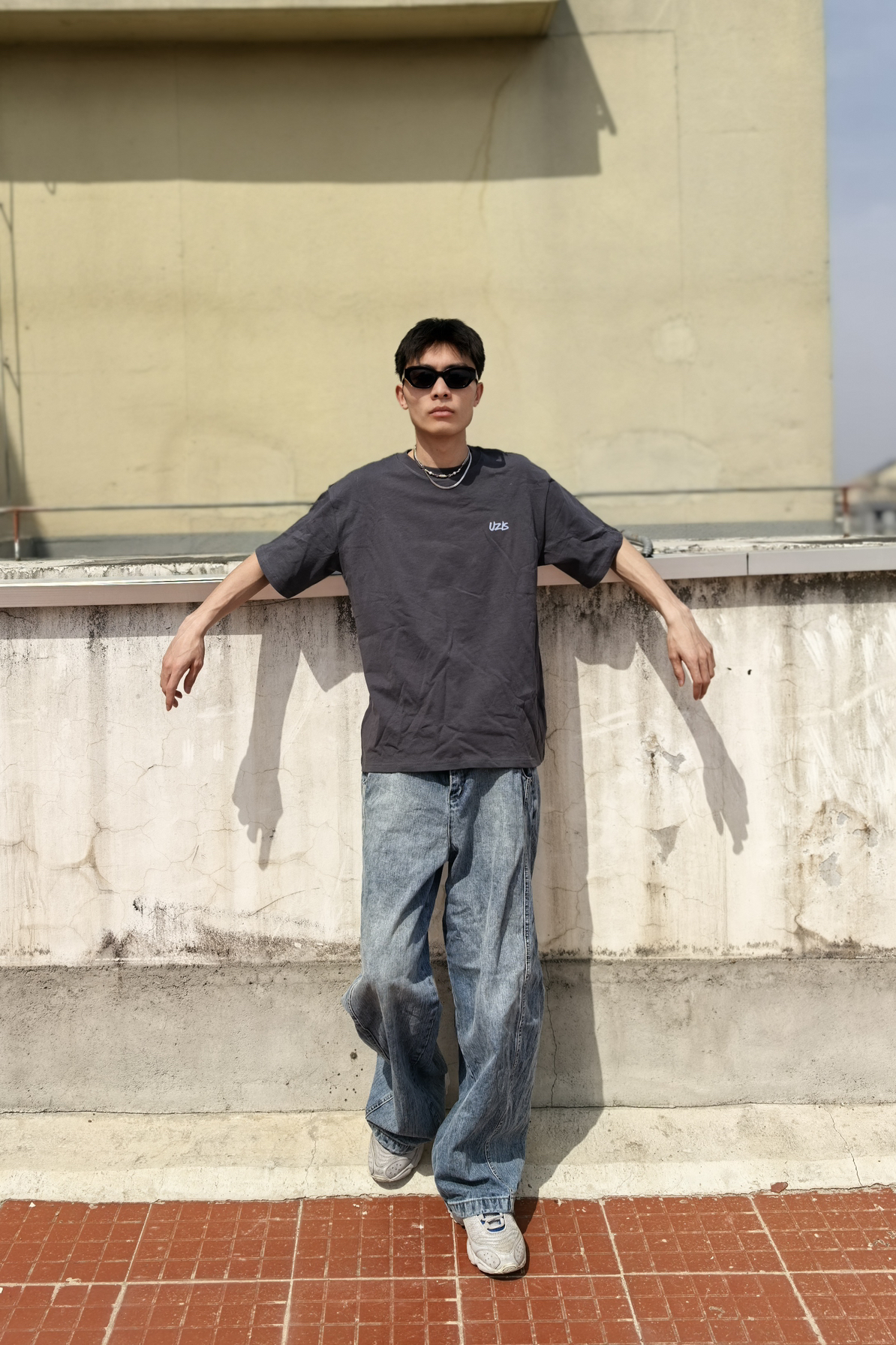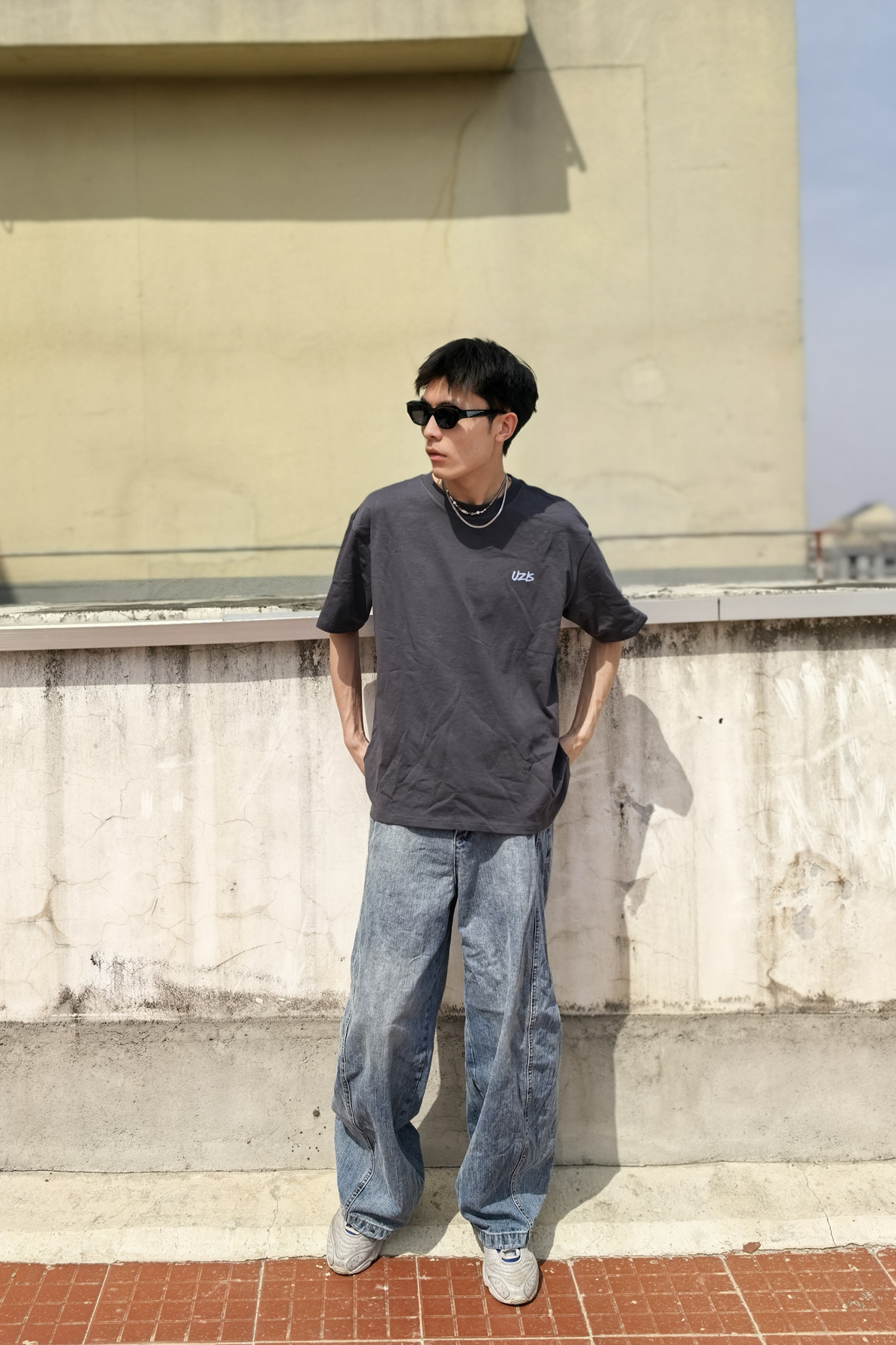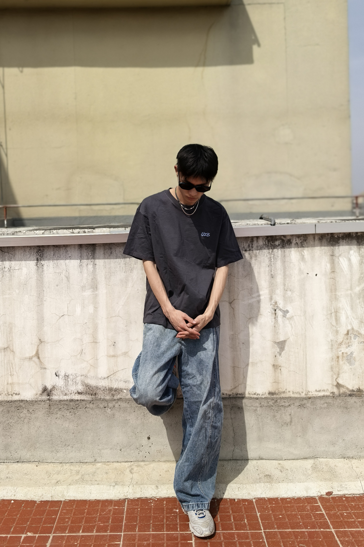今夏男生出街王炸组合来了!上衣来自UZIS曙光系列yi深灰色美式印花短T自带高级滤镜,胸口浅蓝印花巧妙呼应下装,视觉降温5℃的清爽配色一眼心动!搭配浅蓝阔腿牛仔裤堪称神来之笔——水洗工艺褪去厚重感,高腰+垂坠版型秒拉腿长10cm,行走间带风的裤管把少年感直接拉满。脚踩一双双复古老爹鞋从教室到Livehouse都能稳占C位!