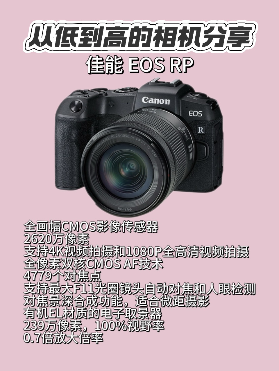 在摄影的世界里,选择一款合适的相机是每个摄影师的重要决策。从入门级到专业级,不同档次的相机各有特色,满足不同摄影爱好者和专业摄影师的需求。以下是几款从低到高排列的专业级相机,每一款都独具匠心,值得推荐。 1. 佳能 EOS RP 作为入门级全画幅微单相机,佳能EOS RP以其亲民的价格和强大的功能吸引了众多摄影爱好者。搭载2620万像素的全画幅CMOS传感器,支持4K视频拍摄和全像素双核CMOS ...