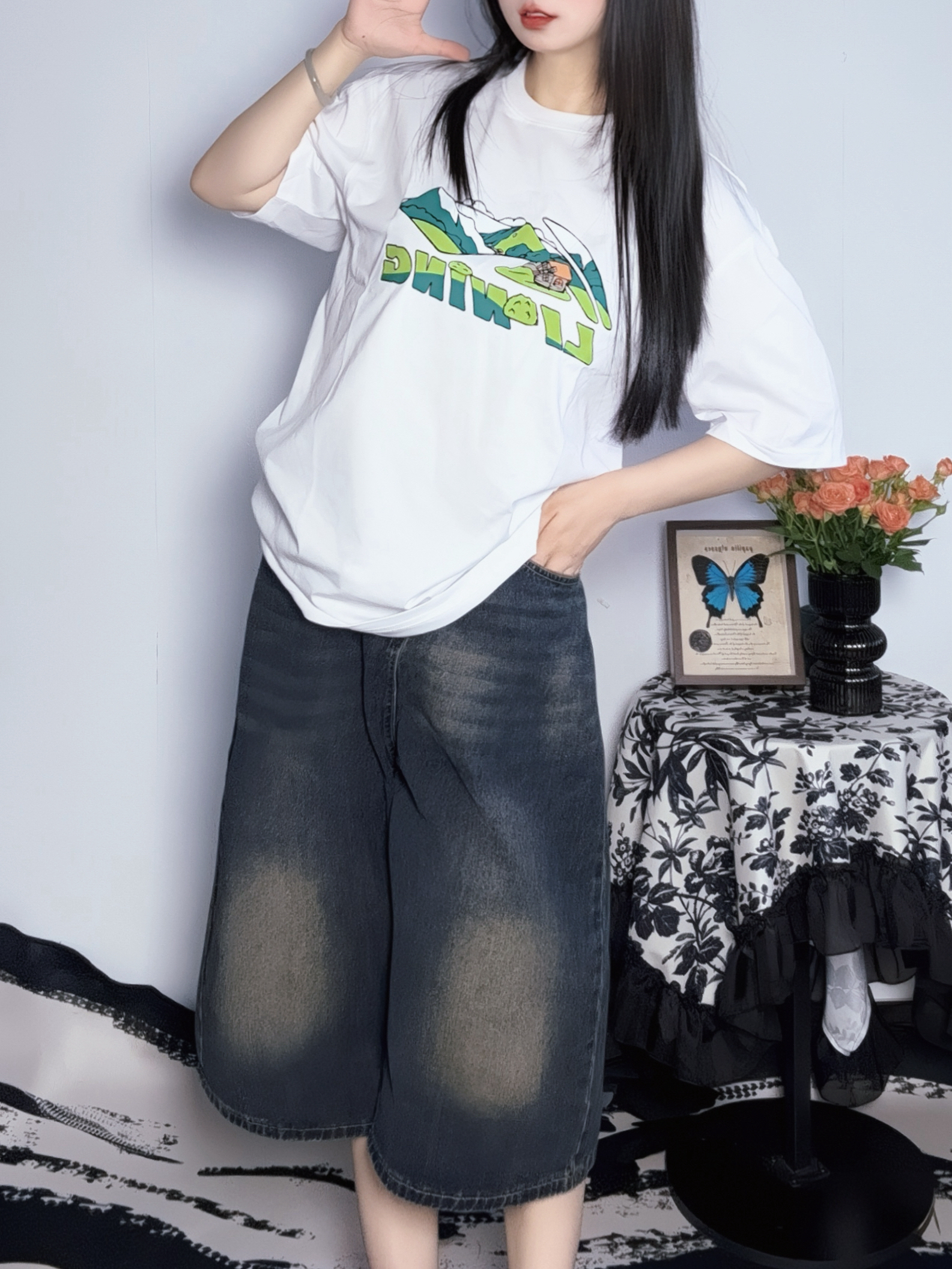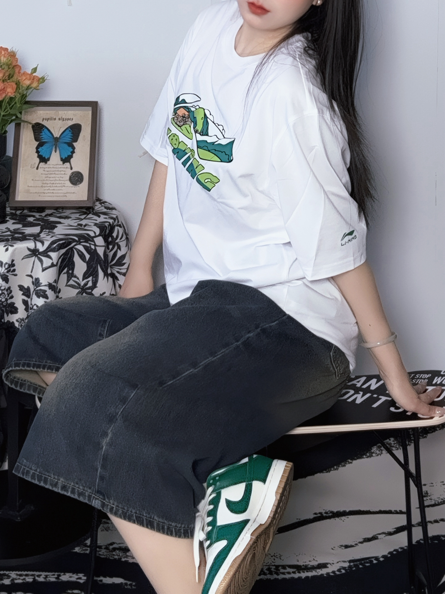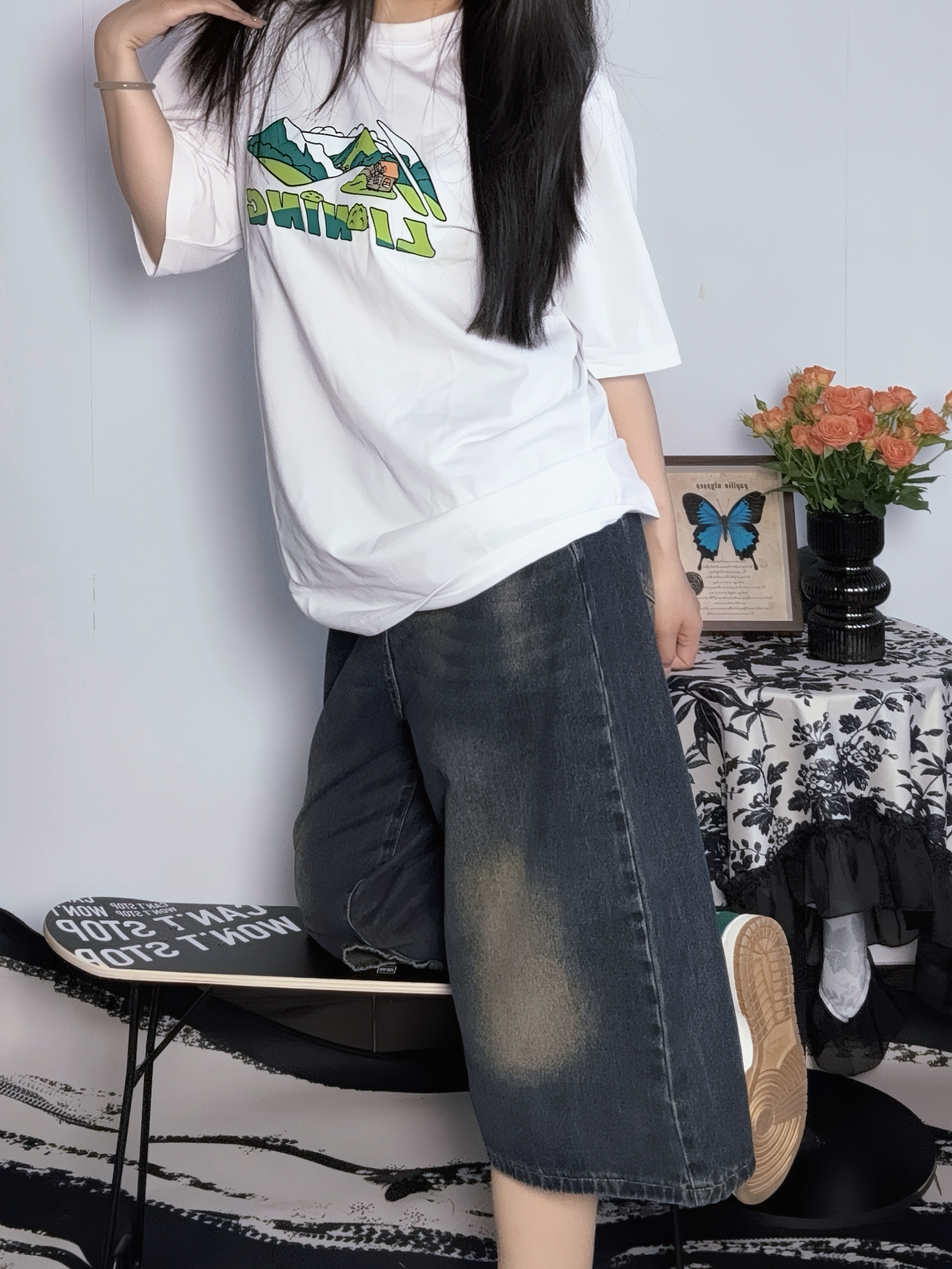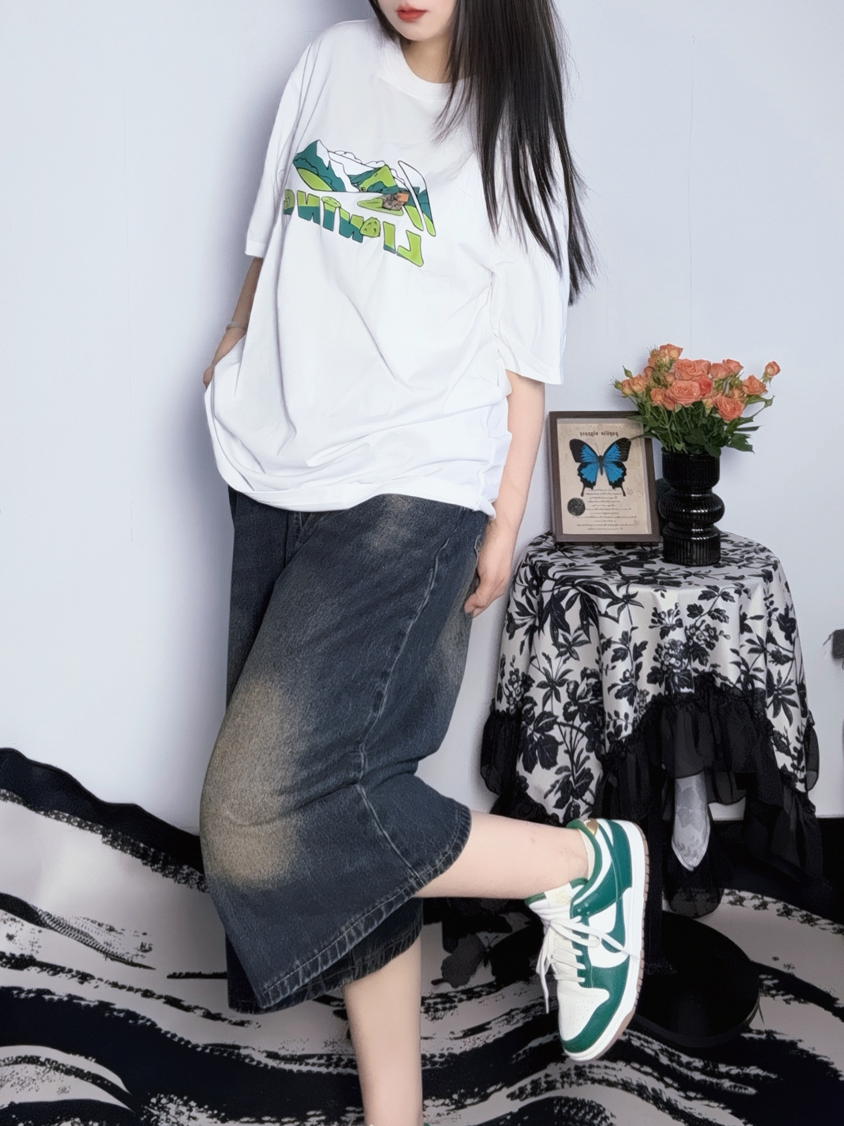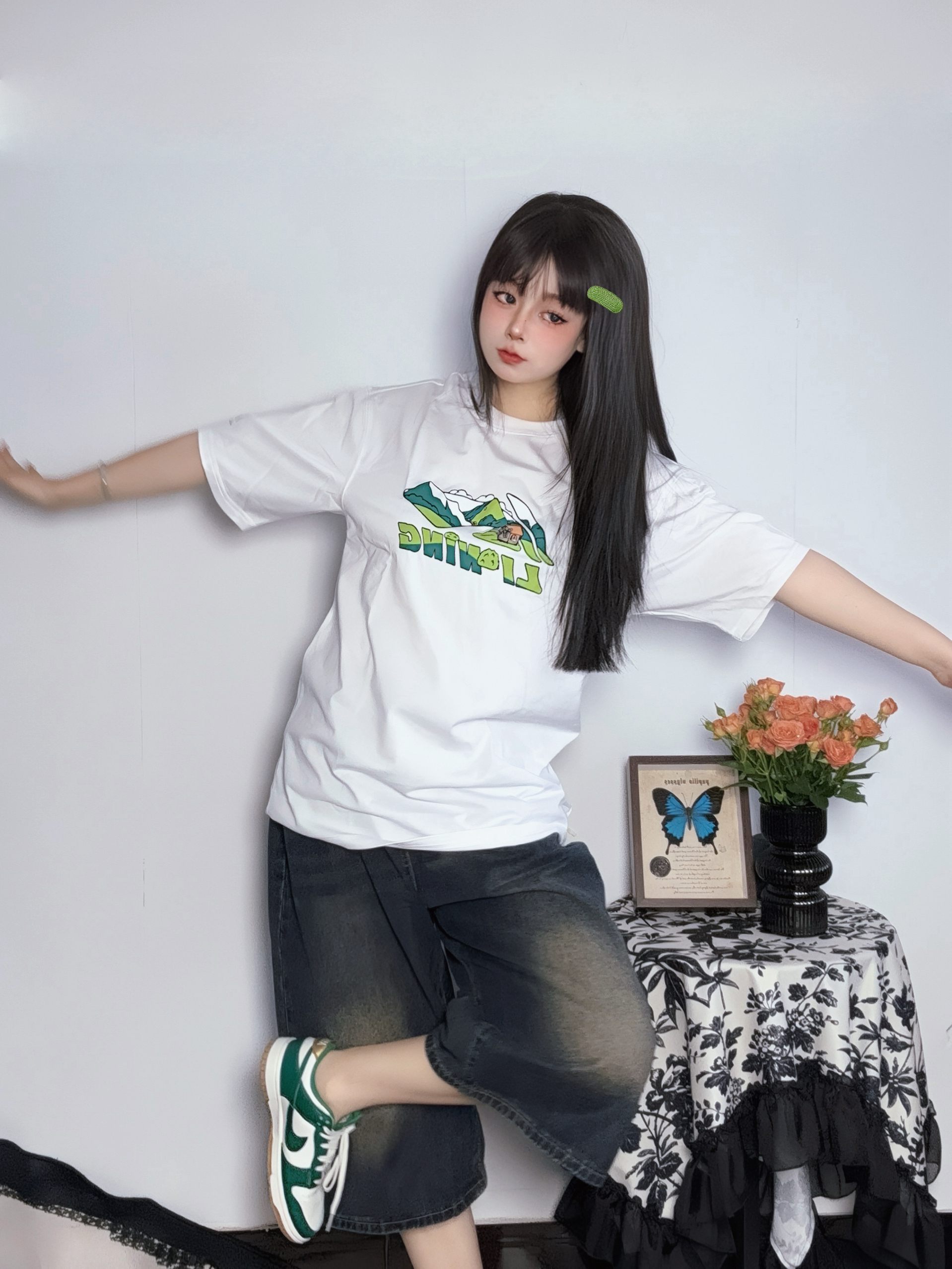 白T软软的老牌子宁子的运动系列 简单的图案很有大自然的那种氛围哈哈 面料适中但是不透哦大胆穿 加上九分裤和dunk姐给少年感拉满~ ♡ 参考尺码:168cm60kg M码