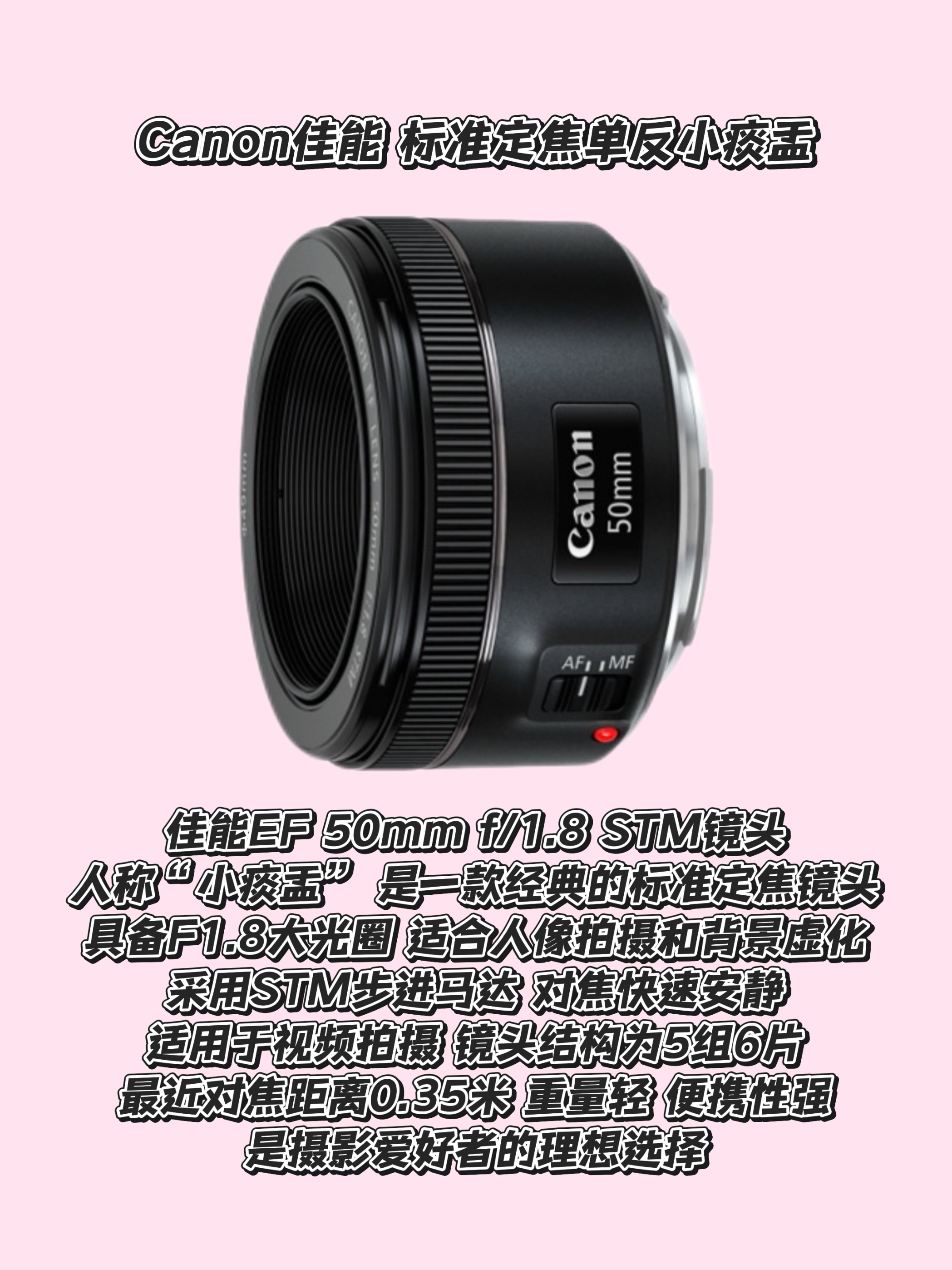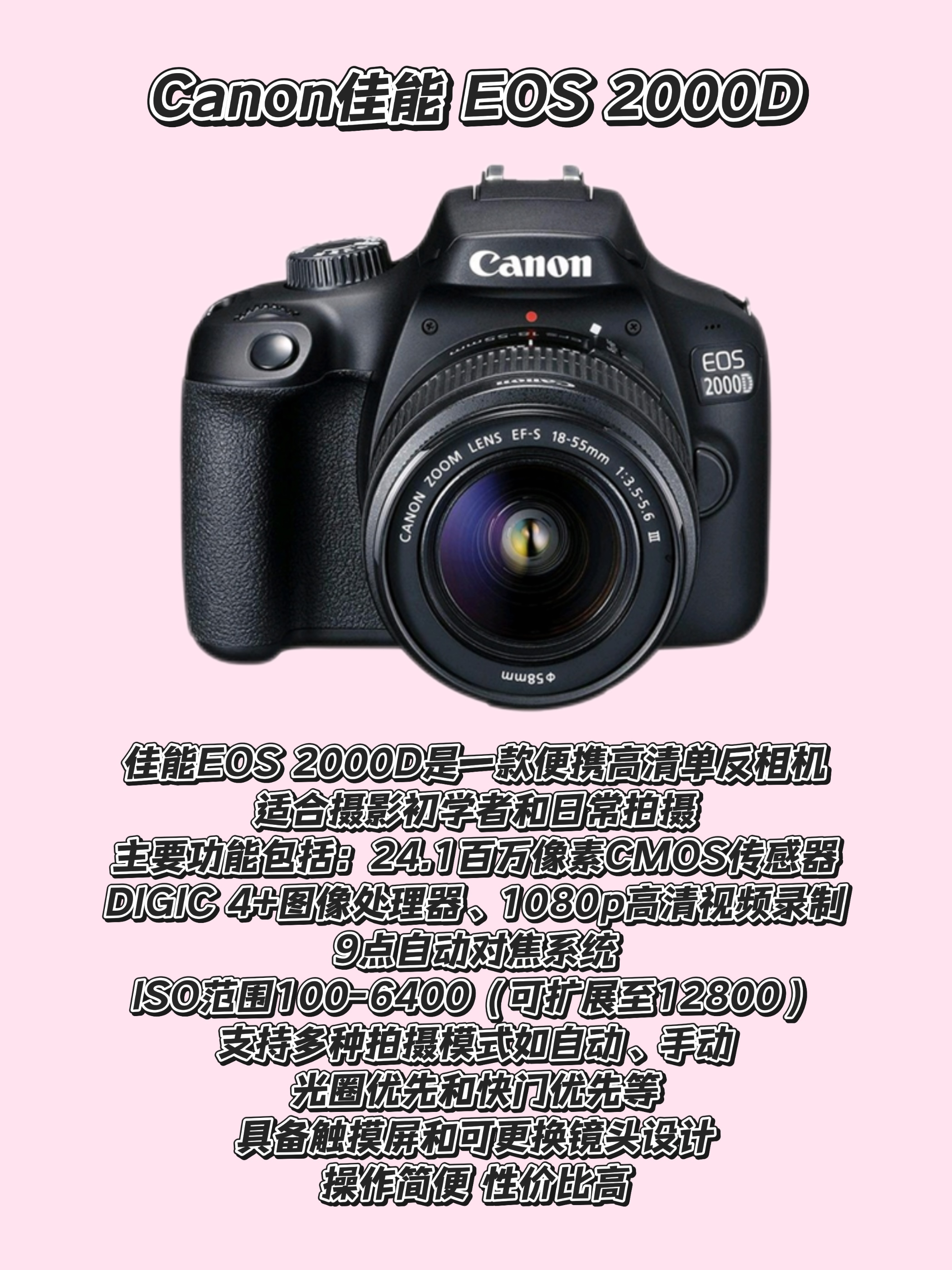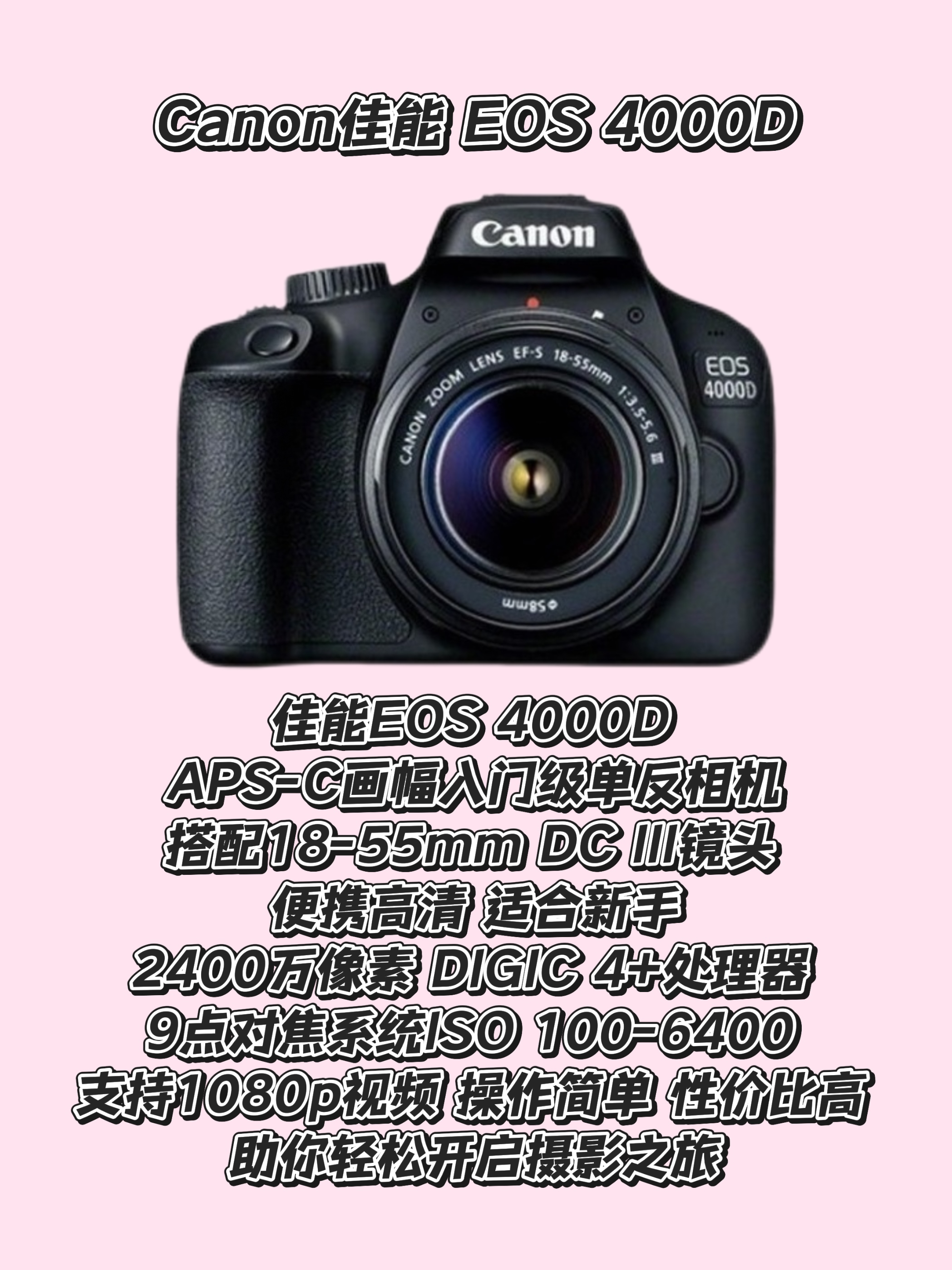 本篇笔记关联了Canon/佳能 EF 50mm f/1.8 STM 全画幅 标准定焦镜头 小痰盂 单反 广角 人像 大光圈 黑色、Canon/佳能 EOS 4000D 单反相机 入门级 旅游 黑色、Canon/佳能 EOS 2000D 单反相机 短视频 旅游 高清数码 机身+18-55mm III镜头等商品,为用户提供真实的使用体验和购买参考。