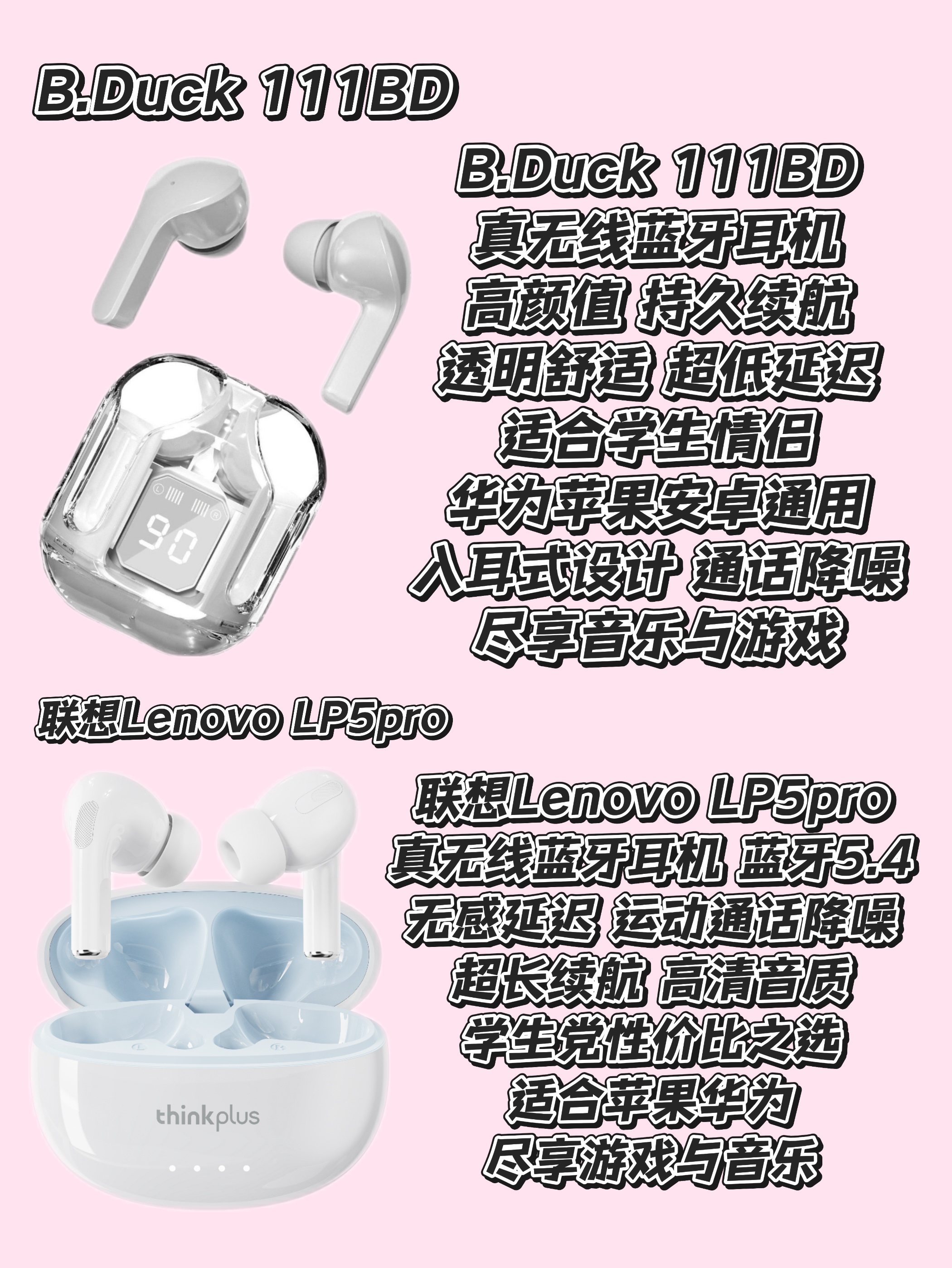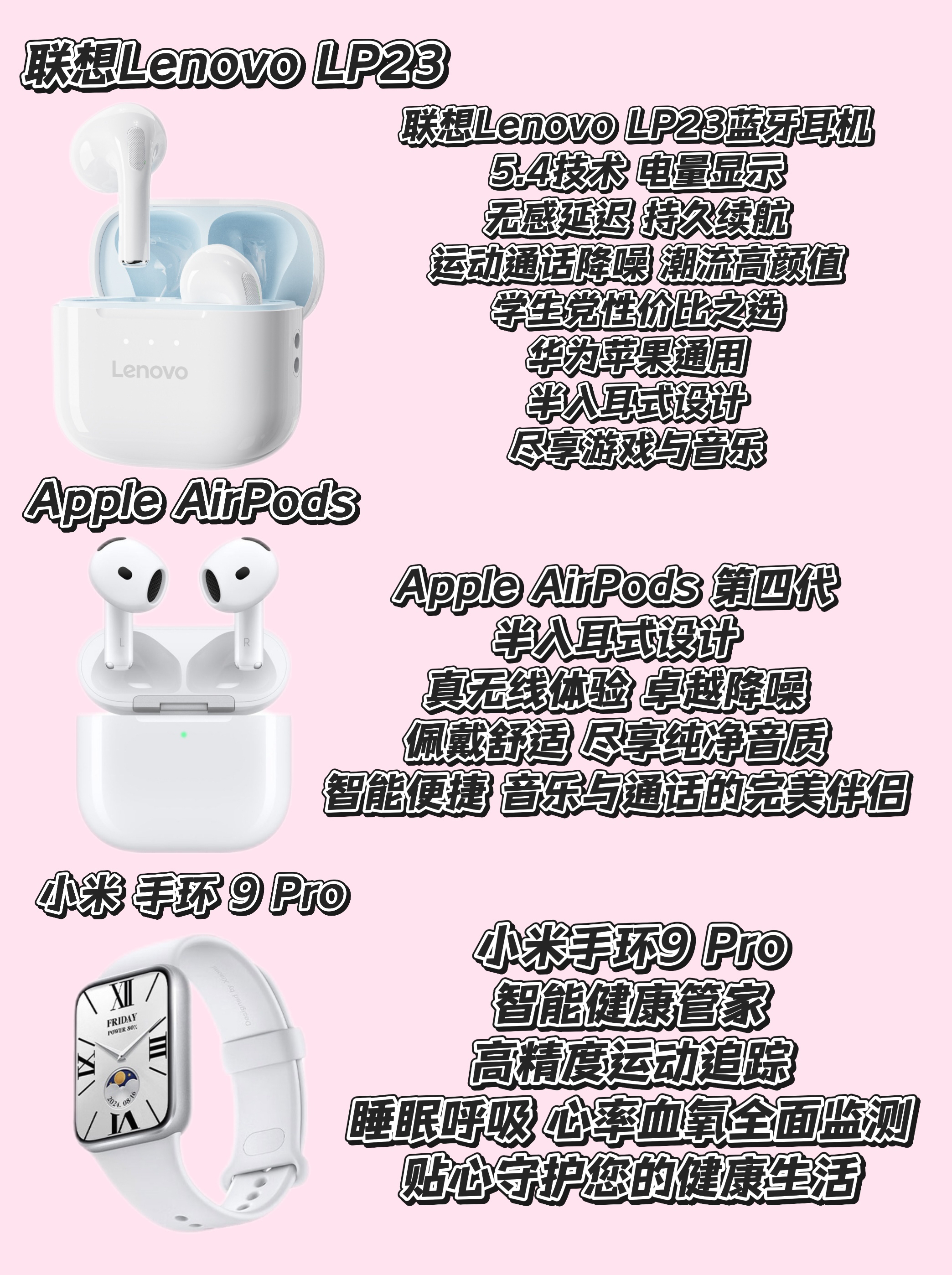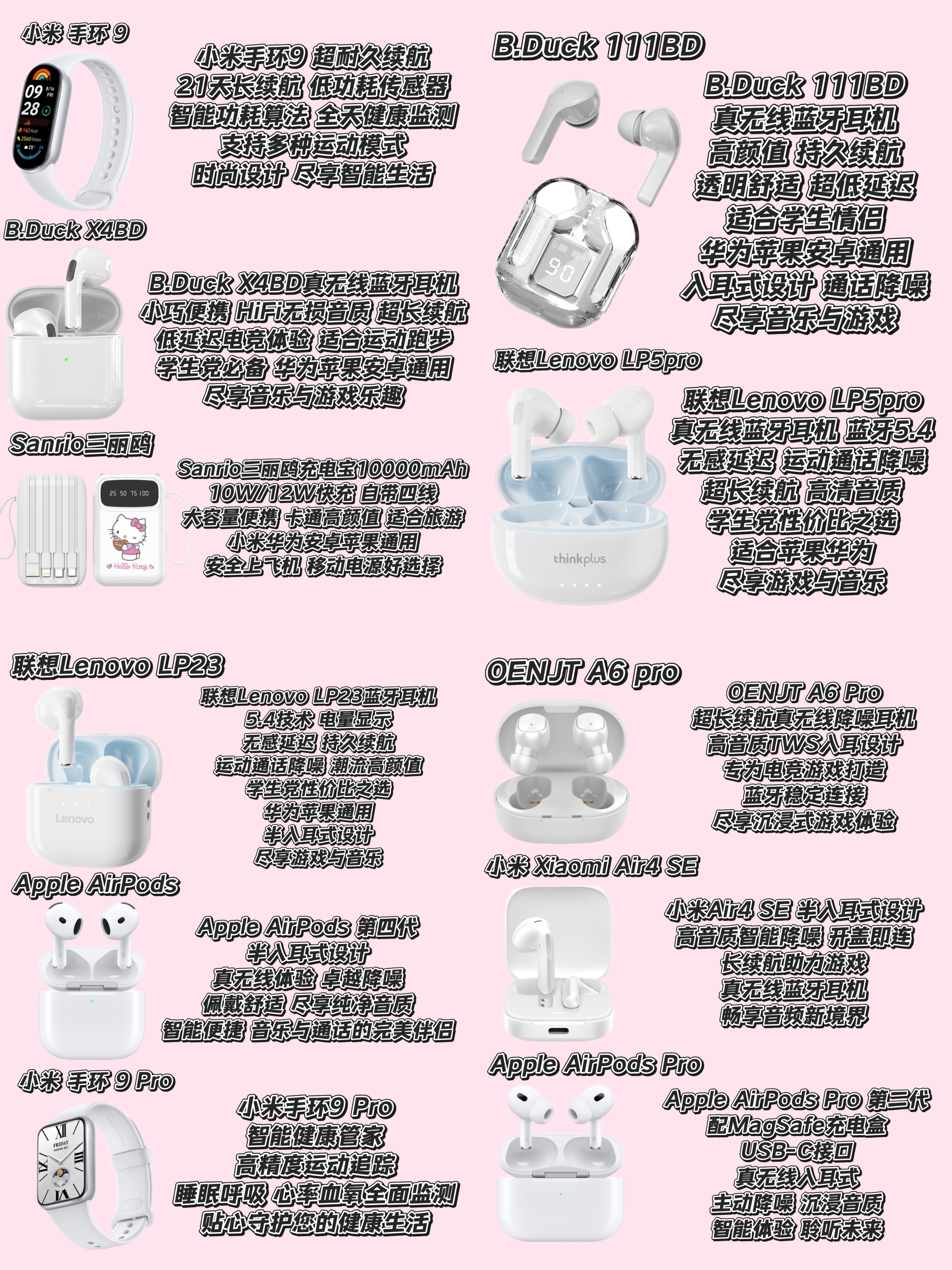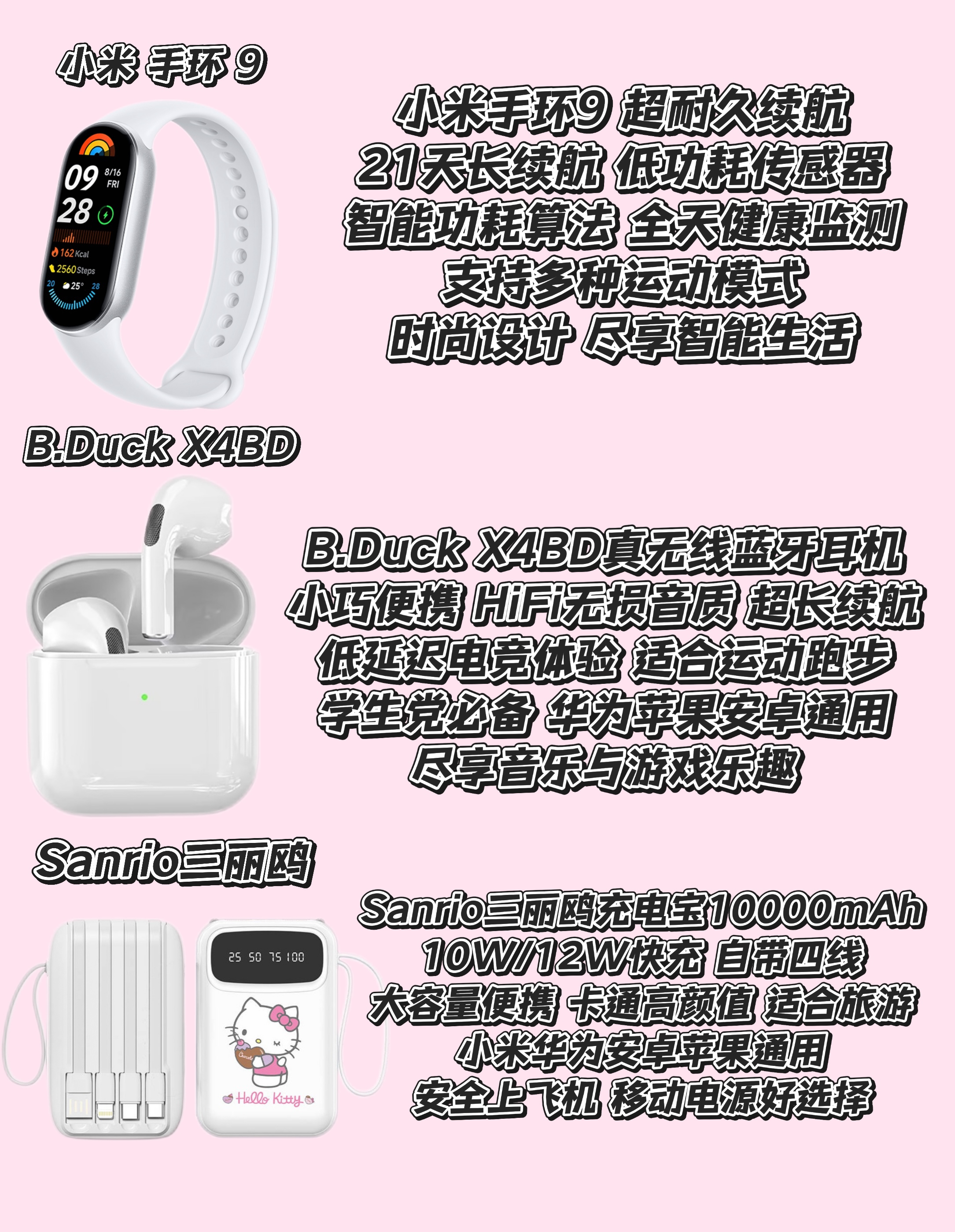 小米手环9:超耐久续航,全天健康监测,性价比高,学生党必备。 B.Duck X4BD耳机:小巧便携,HiFi无损音质,超长续航,低延迟,华为苹果安卓通用。 Sanrio三丽鸥充电宝:10000mAh大容量,自带四线,双向快充,卡通高颜值,适用于小米华为安卓苹果。 B.Duck 111BD耳机:高颜值,持久续航,超低延迟,通话降噪,真无线,适合学生情侣。 联想Lenovo LP5pro耳机:蓝牙5....